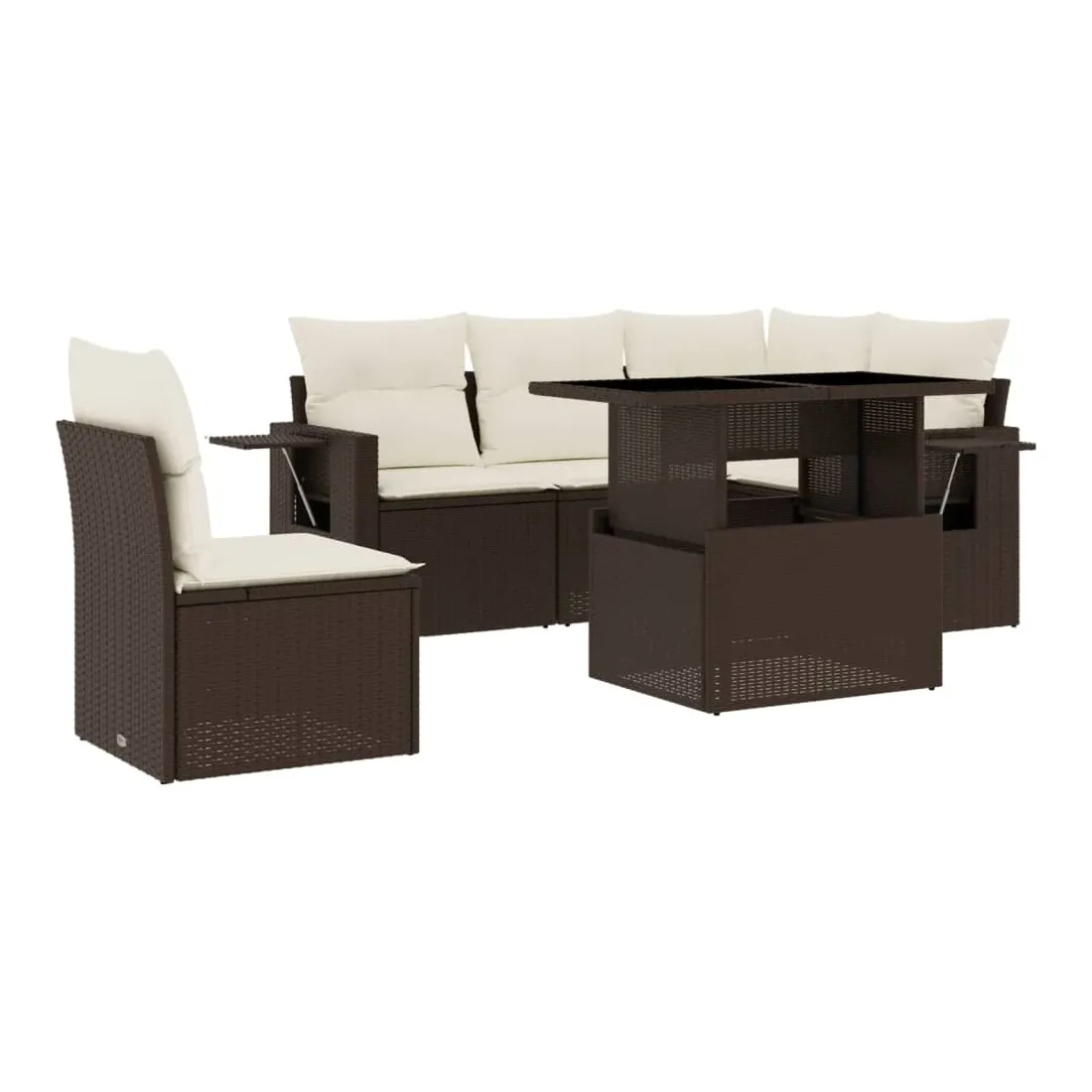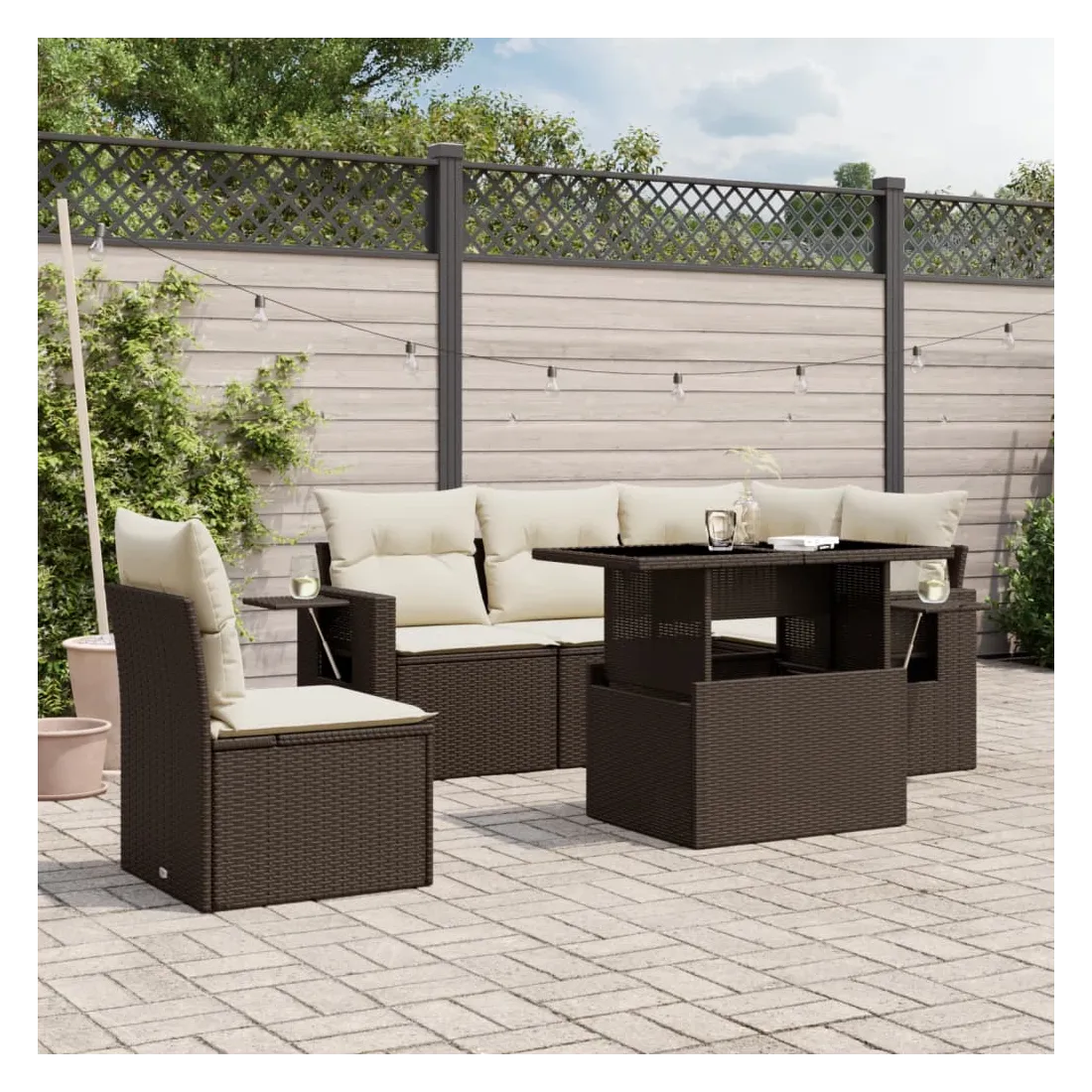 Cet ensemble de canapés de jardin est le complément parfait de votre arrière-cour, terrasse ou patio, offrant un espace confortable et accueillant pour discuter avec la famille et les amis ou simplement se détendre et profiter de l'extérieur. Matériau durable : la résine tressée, également connue sous le nom de poly rotin, est un matériau synthétique solide et nécessitant peu d'entretien qui ressemble au rotin naturel. Il est léger, facile à nettoyer et couramment utilisé pour les meubles d'extérieur en raison de sa durabilité et de ses propriétés de résistance aux intempéries.Dessus de table réglable : le dessus de table peut être soulevé pour rendre la table plus haute, ce qui transforme la table d'extérieur d'une table basse à une table de salle à manger. Elle est parfaite pour recevoir des invités ou prendre des repas à l'extérieur.Table d'appoint pratique : ce mobilier d'extérieur comprend des tables d'appoint pliables avec un ressort à gaz sur les accoudoirs, offrant des endroits pratiques pour garder vos essentiels à portée de main. Expérience d'assise confortable : ce mobilier d'extérieur, doté de coussins épais, offre une expérience d'assise confortable.Conception modulaire : cet ensemble de meubles d'extérieur a une conception modulaire, ce qui le rend complètement flexible et facile à déplacer, afin que vous puissiez créer un agencement de meubles d'extérieur personnalisé. Bon à savoir :Pour que vos meubles d'extérieur restent beaux, nous vous recommandons de les protéger avec une housse imperméable.