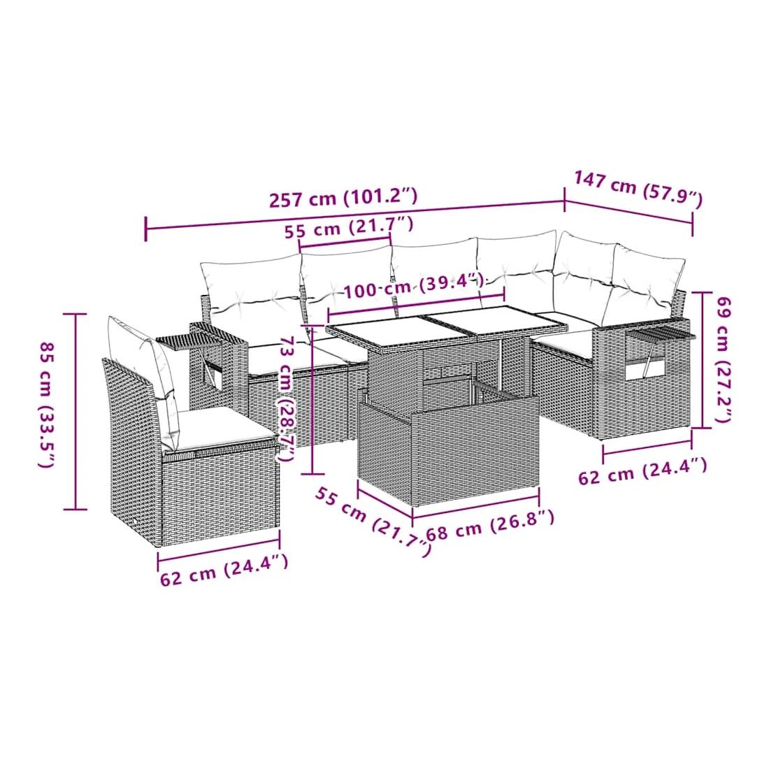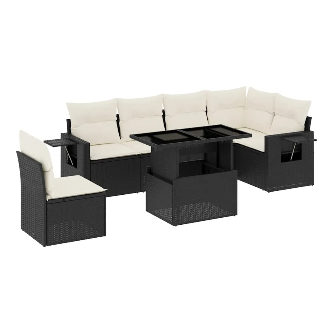 Cet ensemble de canapés de jardin est le complément parfait de votre arrière-cour, terrasse ou patio, offrant un espace confortable et accueillant pour discuter avec la famille et les amis ou simplement se détendre et profiter de l'extérieur. Matériau durable : la résine tressée, également connue sous le nom de poly rotin, est un matériau synthétique solide et nécessitant peu d'entretien qui ressemble au rotin naturel. Il est léger, facile à nettoyer et couramment utilisé pour les meubles d'extérieur en raison de sa durabilité et de ses propriétés de résistance aux intempéries.Dessus de table réglable : le dessus de table peut être soulevé pour rendre la table plus haute, ce qui transforme la table d'extérieur d'une table basse à une table de salle à manger. Elle est parfaite pour recevoir des invités ou prendre des repas à l'extérieur.Table d'appoint pratique : ce mobilier d'extérieur comprend des tables d'appoint pliables avec un ressort à gaz sur les accoudoirs, offrant des endroits pratiques pour garder vos essentiels à portée de main. Expérience d'assise confortable : ce mobilier d'extérieur, doté de coussins épais, offre une expérience d'assise confortable.Conception modulaire : cet ensemble de meubles d'extérieur a une conception modulaire, ce qui le rend complètement flexible et facile à déplacer, afin que vous puissiez créer un agencement de meubles d'extérieur personnalisé. Bon à savoir :Pour que vos meubles d'extérieur restent beaux, nous vous recommandons de les protéger avec une housse imperméable.