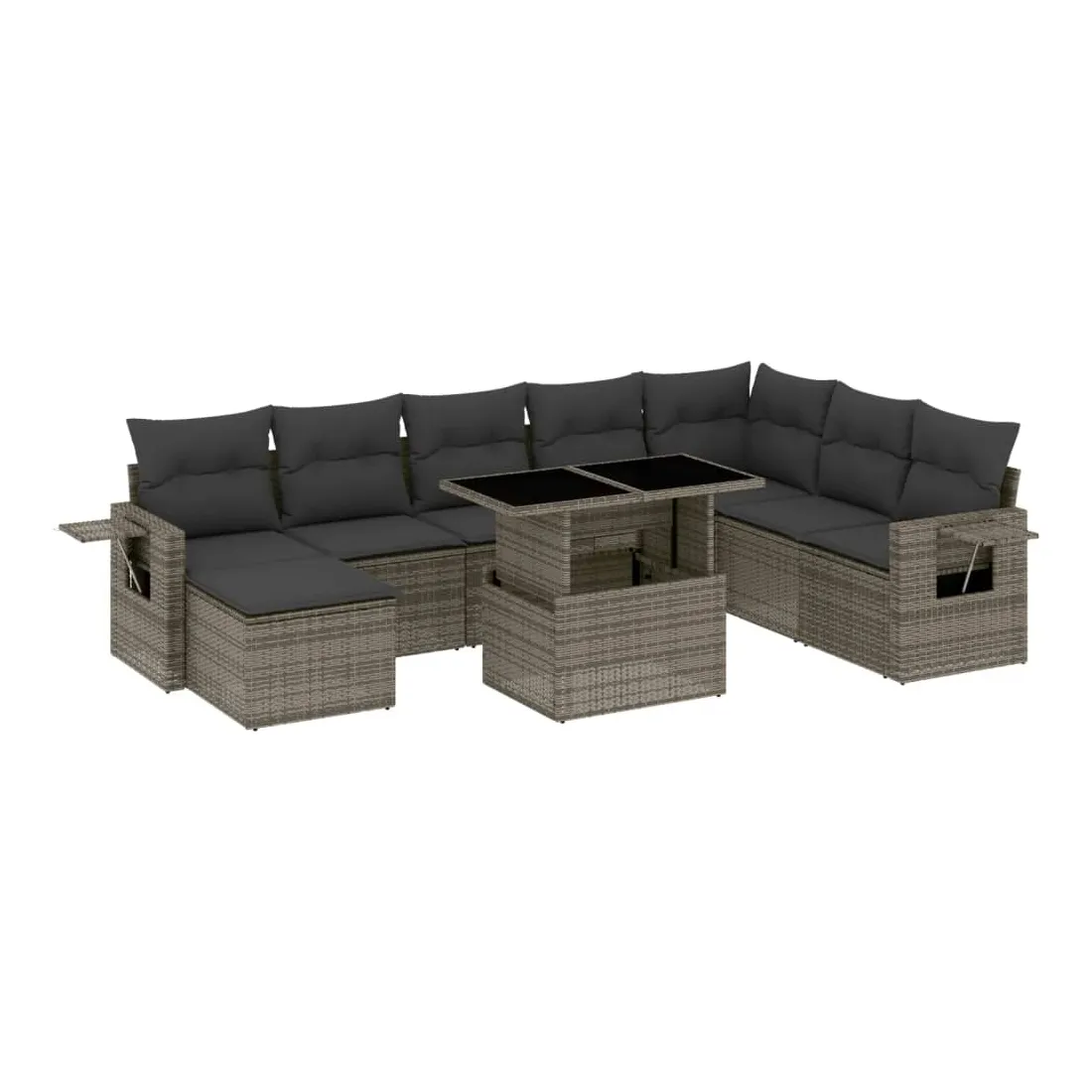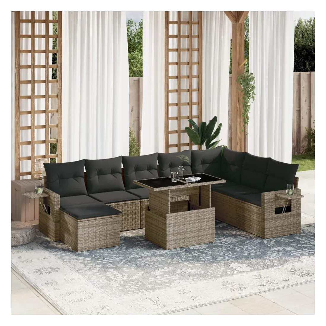Cet ensemble de canapés de jardin est le complément parfait de votre arrière-cour, terrasse ou patio, offrant un espace confortable et accueillant pour discuter avec la famille et les amis ou simplement se détendre et profiter de l'extérieur. Matériau durable : la résine tressée, également connue sous le nom de poly rotin, est un matériau synthétique solide et nécessitant peu d'entretien qui ressemble au rotin naturel. Il est léger, facile à nettoyer et couramment utilisé pour les meubles d'extérieur en raison de sa durabilité et de ses propriétés de résistance aux intempéries.Dessus de table réglable : le dessus de table peut être soulevé pour rendre la table plus haute, ce qui transforme la table d'extérieur d'une table basse à une table de salle à manger. Elle est parfaite pour recevoir des invités ou prendre des repas à l'extérieur.Table d'appoint pratique : ce mobilier d'extérieur comprend des tables d'appoint pliables avec un ressort à gaz sur les accoudoirs, offrant des endroits pratiques pour garder vos essentiels à portée de main. Expérience d'assise confortable : ce mobilier d'extérieur, doté de coussins épais, offre une expérience d'assise confortable.Conception modulaire : cet ensemble de meubles d'extérieur a une conception modulaire, ce qui le rend complètement flexible et facile à déplacer, afin que vous puissiez créer un agencement de meubles d'extérieur personnalisé. Bon à savoir :Pour que vos meubles d'extérieur restent beaux, nous vous recommandons de les protéger avec une housse imperméable.