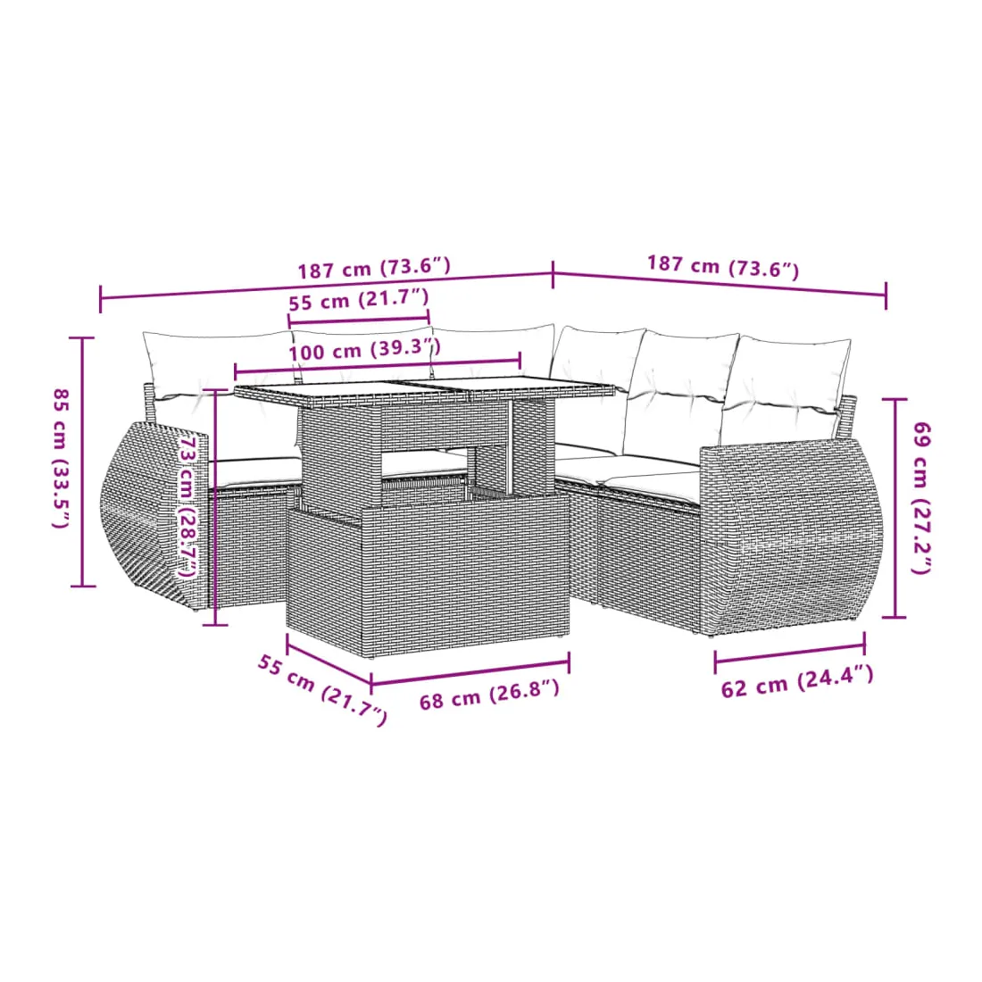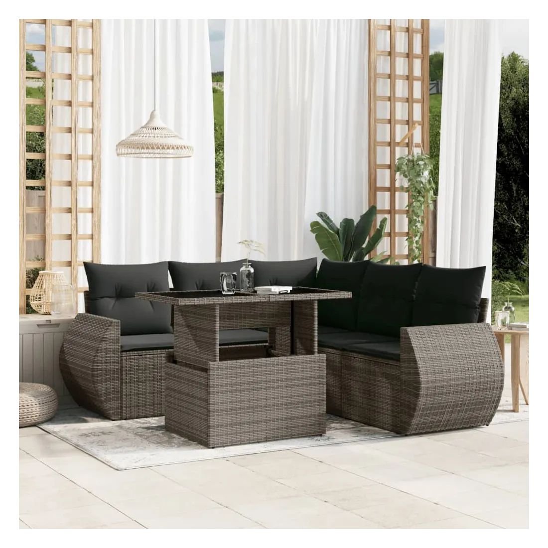 Cet ensemble de canapés de jardin est le complément parfait de votre arrière-cour, terrasse ou patio, offrant un espace confortable et accueillant pour discuter avec la famille et les amis ou simplement se détendre et profiter de l'extérieur. Matériau durable : la résine tressée, également connue sous le nom de poly rotin, est un matériau synthétique solide et nécessitant peu d'entretien qui ressemble au rotin naturel. Il est léger, facile à nettoyer et couramment utilisé pour les meubles d'extérieur en raison de sa durabilité et de ses propriétés de résistance aux intempéries.Dessus de table réglable : le dessus de table peut être soulevé pour rendre la table plus haute, ce qui transforme la table d'extérieur d'une table basse à une table de salle à manger. Elle est parfaite pour recevoir des invités ou prendre des repas à l'extérieur.Expérience d'assise confortable : ce mobilier d'extérieur, doté de coussins épais, offre une expérience d'assise confortable.Housse amovible et lavable : ces coussins de siège sont dotés de housses amovibles pour un lavage et un entretien faciles.Conception modulaire : cet ensemble de meubles d'extérieur a une conception modulaire, ce qui le rend complètement flexible et facile à déplacer, afin que vous puissiez créer un agencement de meubles d'extérieur personnalisé. Bon à savoir :Pour que vos meubles d'extérieur restent beaux, nous vous recommandons de les protéger avec une housse imperméable.
