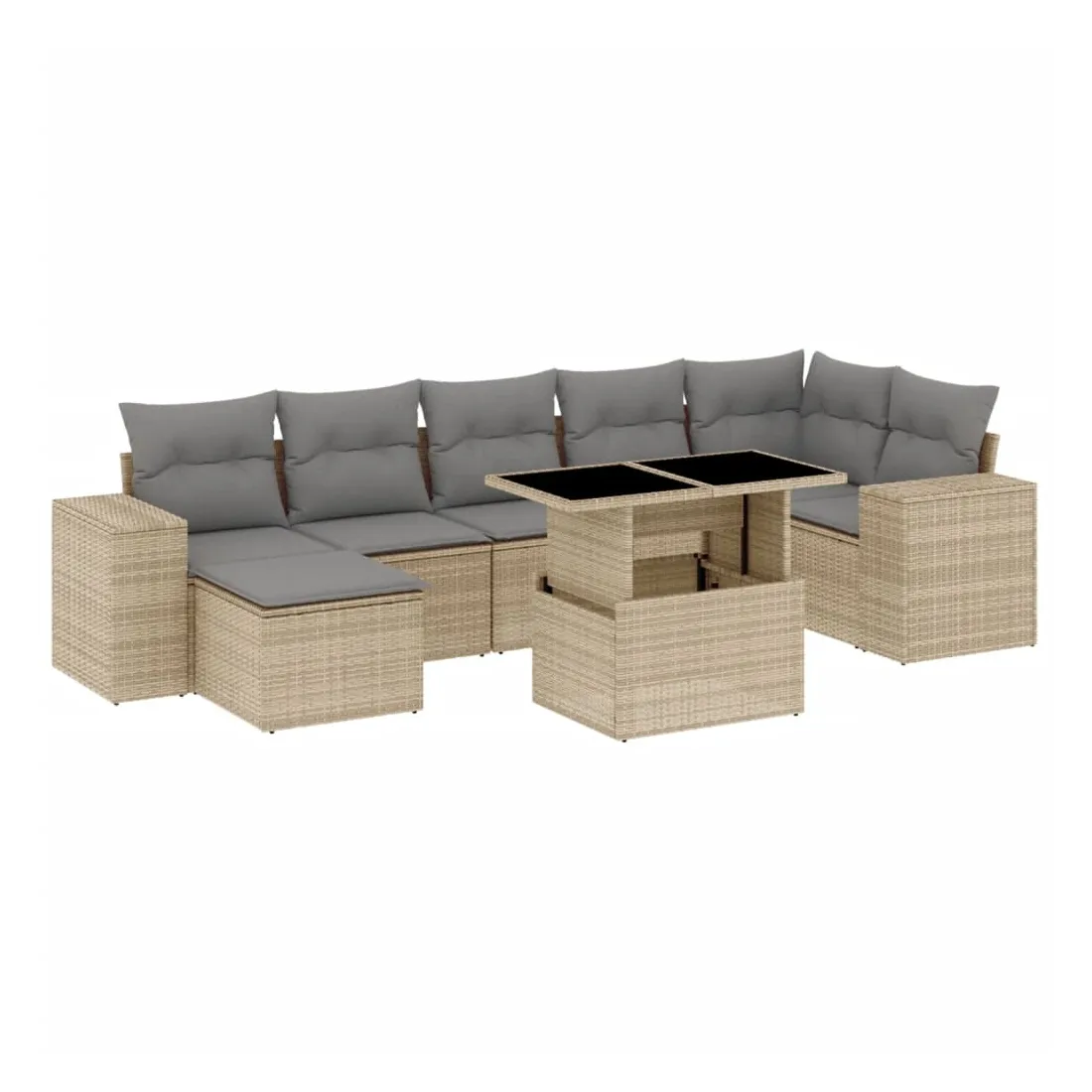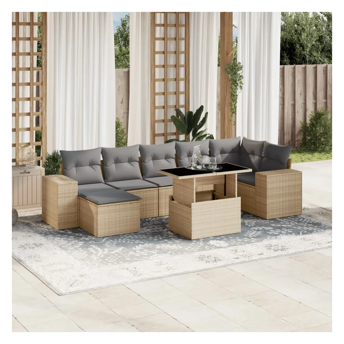Cet ensemble de canapés de jardin est le complément parfait de votre arrière-cour, terrasse ou patio, offrant un espace confortable et accueillant pour discuter avec la famille et les amis ou simplement se détendre et profiter de l'extérieur. Matériau durable : la résine tressée, également connue sous le nom de poly rotin, est un matériau synthétique solide et nécessitant peu d'entretien qui ressemble au rotin naturel. Il est léger, facile à nettoyer et couramment utilisé pour les meubles d'extérieur en raison de sa durabilité et de ses propriétés de résistance aux intempéries.Dessus de table réglable : le dessus de table peut être soulevé pour rendre la table plus haute, ce qui transforme la table d'extérieur d'une table basse à une table de salle à manger. Elle est parfaite pour recevoir des invités ou prendre des repas à l'extérieur.Expérience d'assise confortable : ce mobilier d'extérieur, doté de coussins épais, offre une expérience d'assise confortable.Housse amovible et lavable : ces coussins de siège sont dotés de housses amovibles pour un lavage et un entretien faciles.Conception modulaire : cet ensemble de meubles d'extérieur a une conception modulaire, ce qui le rend complètement flexible et facile à déplacer, afin que vous puissiez créer un agencement de meubles d'extérieur personnalisé. Bon à savoir :Pour que vos meubles d'extérieur restent beaux, nous vous recommandons de les protéger avec une housse imperméable.