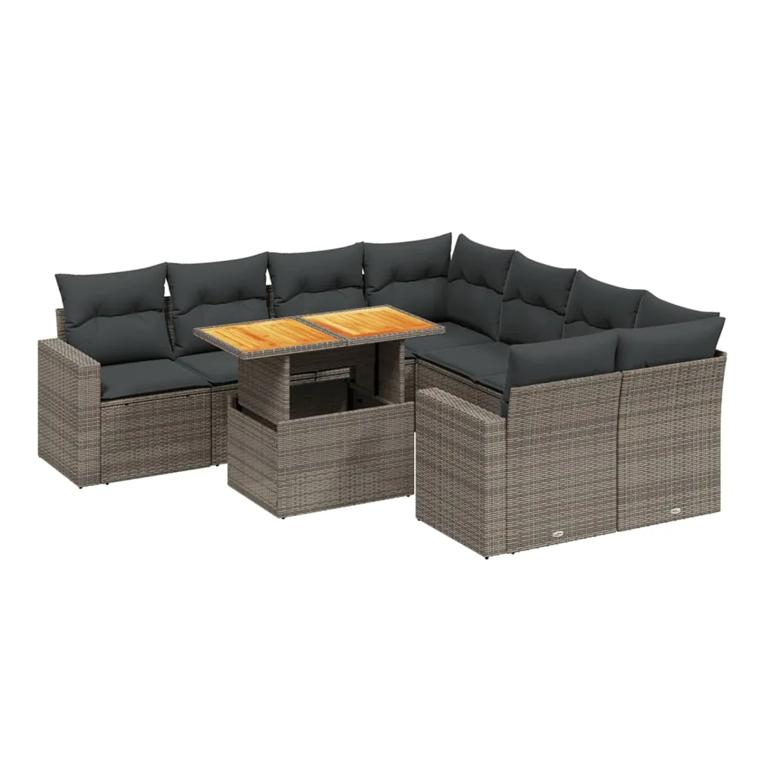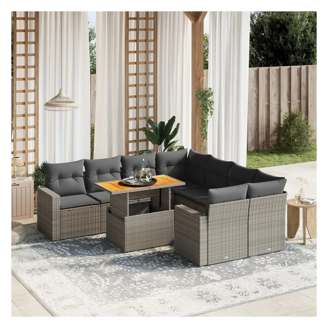 Cet ensemble de canapés de jardin est le complément parfait de votre arrière-cour, terrasse ou patio, offrant un espace confortable et accueillant pour discuter avec la famille et les amis ou simplement se détendre et profiter de l'extérieur. Matériau durable : la résine tressée, également connue sous le nom de poly rotin, est un matériau synthétique solide et nécessitant peu d'entretien qui ressemble au rotin naturel. Il est léger, facile à nettoyer et couramment utilisé pour les meubles d'extérieur en raison de sa durabilité et de ses propriétés de résistance aux intempéries.Dessus de table réglable : le dessus de table peut être soulevé pour rendre la table plus haute, ce qui transforme la table d'extérieur d'une table basse à une table de salle à manger. Elle est parfaite pour recevoir des invités ou prendre des repas à l'extérieur.Expérience d'assise confortable : ce mobilier d'extérieur, doté de coussins épais, offre une expérience d'assise confortable.Housse amovible et lavable : ces coussins de siège sont dotés de housses amovibles pour un lavage et un entretien faciles.Conception modulaire : cet ensemble de meubles d'extérieur a une conception modulaire, ce qui le rend complètement flexible et facile à déplacer, afin que vous puissiez créer un agencement de meubles d'extérieur personnalisé. Bon à savoir :Pour que vos meubles d'extérieur restent beaux, nous vous recommandons de les protéger avec une housse imperméable.