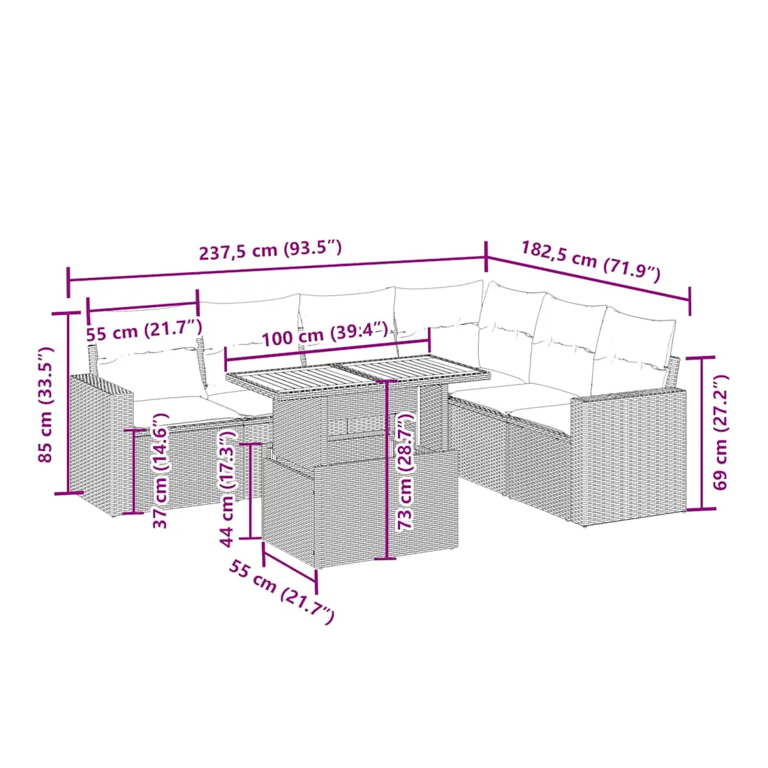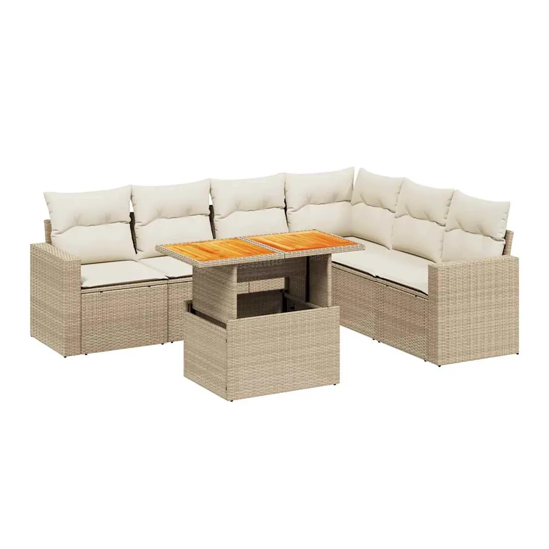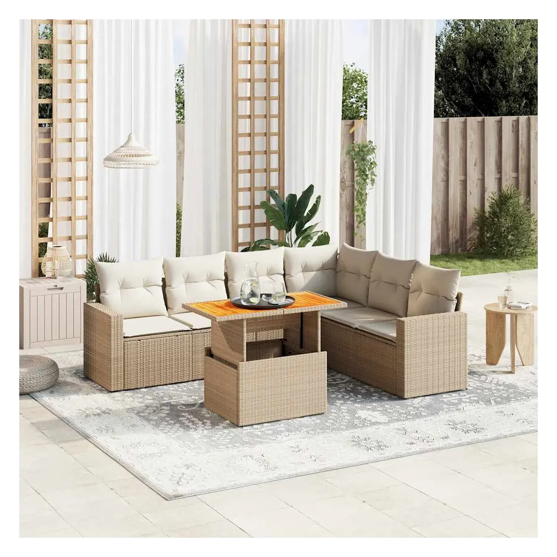 Cet ensemble de canapés de jardin est le complément parfait de votre arrière-cour, terrasse ou patio, offrant un espace confortable et accueillant pour discuter avec la famille et les amis ou simplement se détendre et profiter de l'extérieur. Matériau durable : la résine tressée, également connue sous le nom de poly rotin, est un matériau synthétique solide et nécessitant peu d'entretien qui ressemble au rotin naturel. Il est léger, facile à nettoyer et couramment utilisé pour les meubles d'extérieur en raison de sa durabilité et de ses propriétés de résistance aux intempéries.Dessus de table réglable : le dessus de table peut être soulevé pour rendre la table plus haute, ce qui transforme la table d'extérieur d'une table basse à une table de salle à manger. Elle est parfaite pour recevoir des invités ou prendre des repas à l'extérieur.Expérience d'assise confortable : ce mobilier d'extérieur, doté de coussins épais, offre une expérience d'assise confortable.Housse amovible et lavable : ces coussins de siège sont dotés de housses amovibles pour un lavage et un entretien faciles.Conception modulaire : cet ensemble de meubles d'extérieur a une conception modulaire, ce qui le rend complètement flexible et facile à déplacer, afin que vous puissiez créer un agencement de meubles d'extérieur personnalisé. Bon à savoir :Pour que vos meubles d'extérieur restent beaux, nous vous recommandons de les protéger avec une housse imperméable.