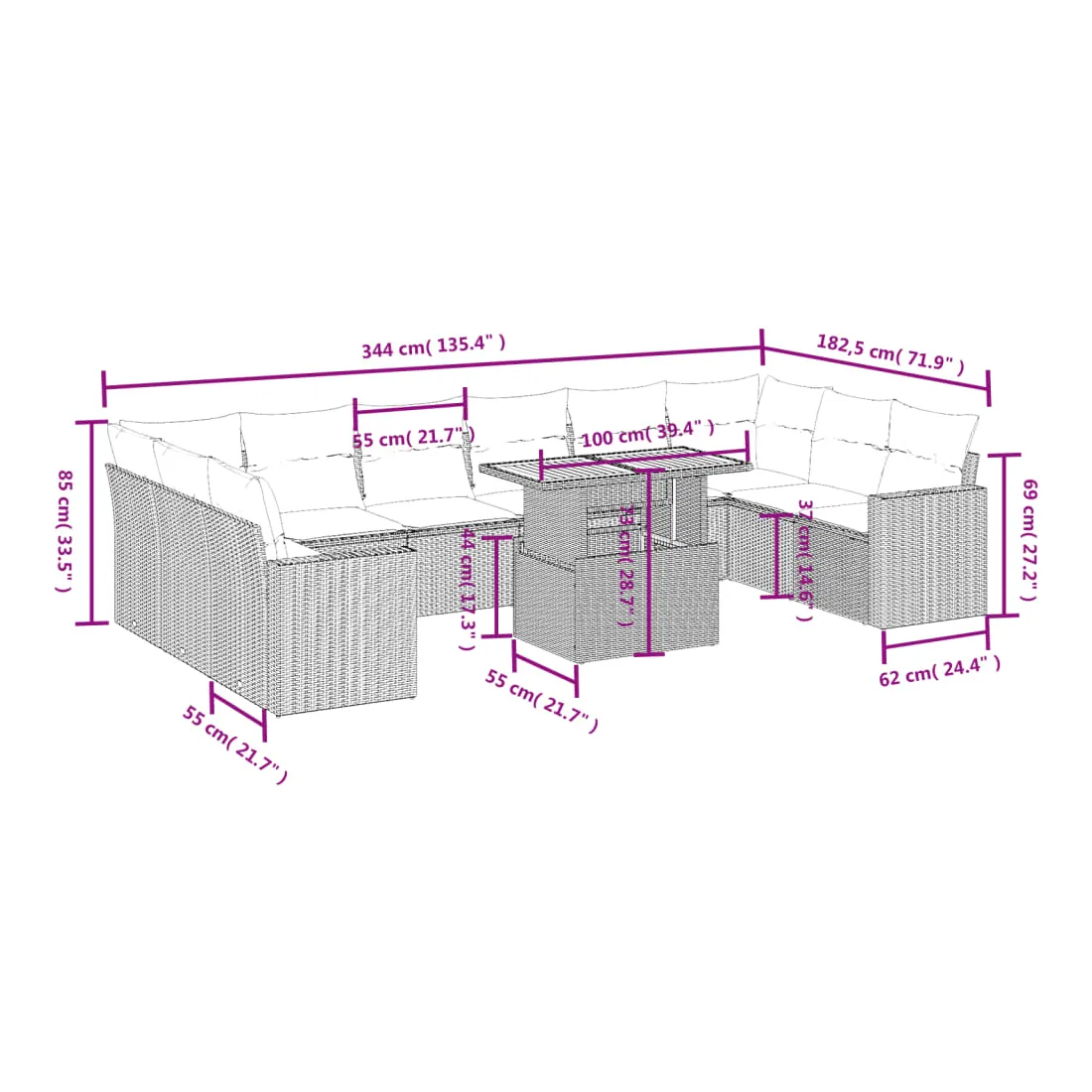 Cet ensemble de canapés de jardin est le complément parfait de votre arrière-cour, terrasse ou patio, offrant un espace confortable et accueillant pour discuter avec la famille et les amis ou simplement se détendre et profiter de l'extérieur. Matériau durable : la résine tressée, également connue sous le nom de poly rotin, est un matériau synthétique solide et nécessitant peu d'entretien qui ressemble au rotin naturel. Il est léger, facile à nettoyer et couramment utilisé pour les meubles d'extérieur en raison de sa durabilité et de ses propriétés de résistance aux intempéries.Dessus de table réglable : le dessus de table peut être soulevé pour rendre la table plus haute, ce qui transforme la table d'extérieur d'une table basse à une table de salle à manger. Elle est parfaite pour recevoir des invités ou prendre des repas à l'extérieur.Expérience d'assise confortable : ce mobilier d'extérieur, doté de coussins épais, offre une expérience d'assise confortable.Housse amovible et lavable : ces coussins de siège sont dotés de housses amovibles pour un lavage et un entretien faciles.Conception modulaire : cet ensemble de meubles d'extérieur a une conception modulaire, ce qui le rend complètement flexible et facile à déplacer, afin que vous puissiez créer un agencement de meubles d'extérieur personnalisé. Bon à savoir :Pour que vos meubles d'extérieur restent beaux, nous vous recommandons de les protéger avec une housse imperméable.