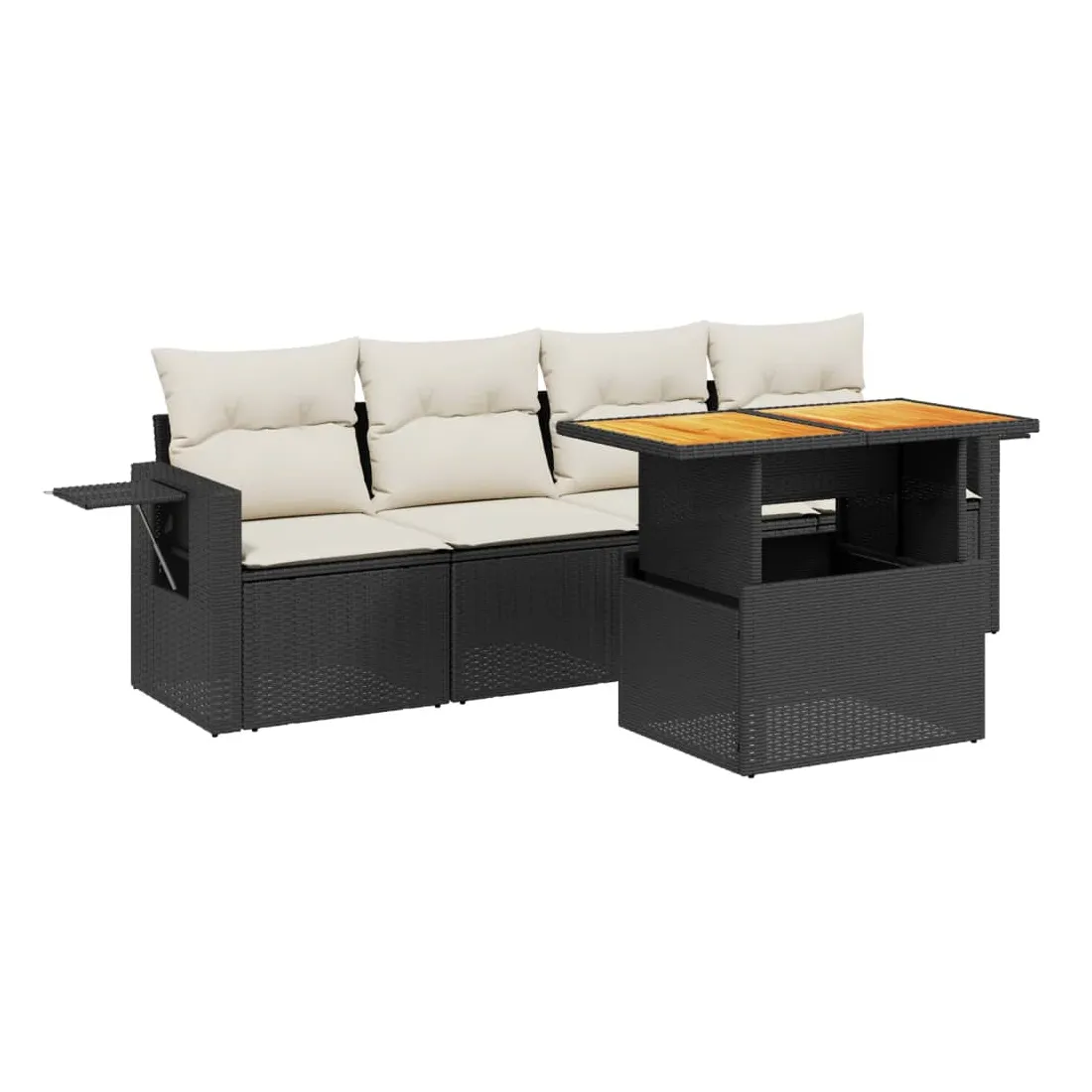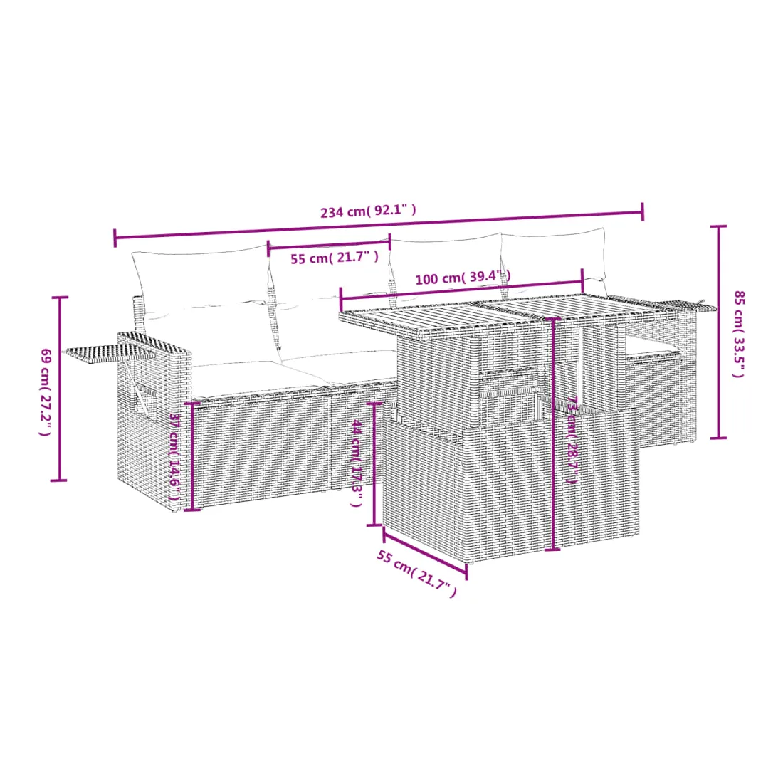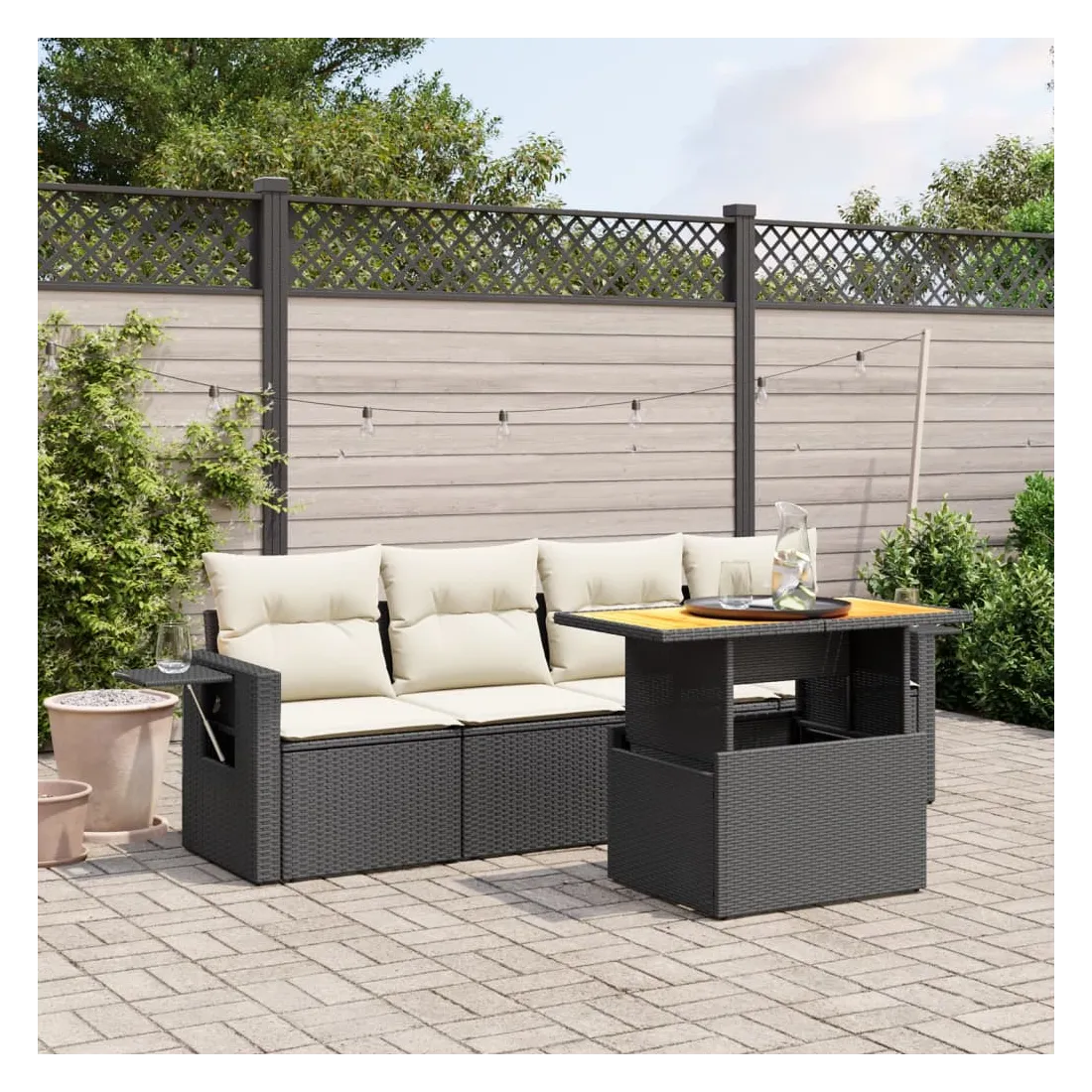 Cet ensemble de canapés de jardin est le complément parfait de votre arrière-cour, terrasse ou patio, offrant un espace confortable et accueillant pour discuter avec la famille et les amis ou simplement se détendre et profiter de l'extérieur. Matériau durable : la résine tressée, également connue sous le nom de poly rotin, est un matériau synthétique solide et nécessitant peu d'entretien qui ressemble au rotin naturel. Il est léger, facile à nettoyer et couramment utilisé pour les meubles d'extérieur en raison de sa durabilité et de ses propriétés de résistance aux intempéries.Dessus de table réglable : le dessus de table peut être soulevé pour rendre la table plus haute, ce qui transforme la table d'extérieur d'une table basse à une table de salle à manger. Elle est parfaite pour recevoir des invités ou prendre des repas à l'extérieur.Table d'appoint pratique : ce mobilier d'extérieur comprend une table d'appoint pliable avec un ressort à gaz sur les accoudoirs, offrant un endroit pratique pour garder vos essentiels à portée de main.Housse amovible et lavable : ces coussins de siège sont dotés de housses amovibles pour un lavage et un entretien faciles.Conception modulaire : cet ensemble de meubles d'extérieur a une conception modulaire, ce qui le rend complètement flexible et facile à déplacer, afin que vous puissiez créer un agencement de meubles d'extérieur personnalisé. Bon à savoir :Pour que vos meubles d'extérieur restent beaux, nous vous recommandons de les protéger avec une housse imperméable.