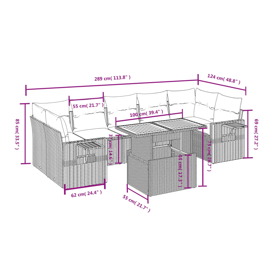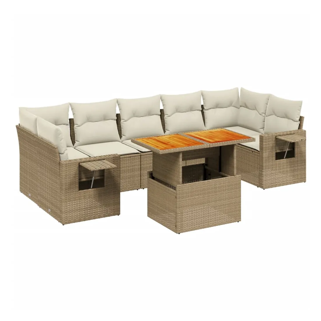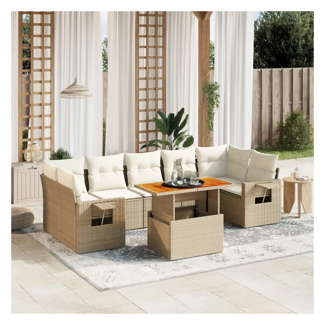 Cet ensemble de canapés de jardin est le complément parfait de votre arrière-cour, terrasse ou patio, offrant un espace confortable et accueillant pour discuter avec la famille et les amis ou simplement se détendre et profiter de l'extérieur. Matériau durable : la résine tressée, également connue sous le nom de poly rotin, est un matériau synthétique solide et nécessitant peu d'entretien qui ressemble au rotin naturel. Il est léger, facile à nettoyer et couramment utilisé pour les meubles d'extérieur en raison de sa durabilité et de ses propriétés de résistance aux intempéries.Dessus de table réglable : le dessus de table peut être soulevé pour rendre la table plus haute, ce qui transforme la table d'extérieur d'une table basse à une table de salle à manger. Elle est parfaite pour recevoir des invités ou prendre des repas à l'extérieur.Table d'appoint pratique : ce mobilier d'extérieur comprend une table d'appoint pliable avec un ressort à gaz sur les accoudoirs, offrant un endroit pratique pour garder vos essentiels à portée de main.Housse amovible et lavable : ces coussins de siège sont dotés de housses amovibles pour un lavage et un entretien faciles.Conception modulaire : cet ensemble de meubles d'extérieur a une conception modulaire, ce qui le rend complètement flexible et facile à déplacer, afin que vous puissiez créer un agencement de meubles d'extérieur personnalisé. Bon à savoir :Pour que vos meubles d'extérieur restent beaux, nous vous recommandons de les protéger avec une housse imperméable.