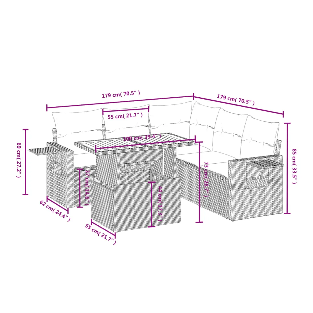 Cet ensemble de canapés de jardin est le complément parfait de votre arrière-cour, terrasse ou patio, offrant un espace confortable et accueillant pour discuter avec la famille et les amis ou simplement se détendre et profiter de l'extérieur. Matériau durable : la résine tressée, également connue sous le nom de poly rotin, est un matériau synthétique solide et nécessitant peu d'entretien qui ressemble au rotin naturel. Il est léger, facile à nettoyer et couramment utilisé pour les meubles d'extérieur en raison de sa durabilité et de ses propriétés de résistance aux intempéries.Dessus de table réglable : le dessus de table peut être soulevé pour rendre la table plus haute, ce qui transforme la table d'extérieur d'une table basse à une table de salle à manger. Elle est parfaite pour recevoir des invités ou prendre des repas à l'extérieur.Table d'appoint pratique : ce mobilier d'extérieur comprend une table d'appoint pliable avec un ressort à gaz sur les accoudoirs, offrant un endroit pratique pour garder vos essentiels à portée de main.Housse amovible et lavable : ces coussins de siège sont dotés de housses amovibles pour un lavage et un entretien faciles.Conception modulaire : cet ensemble de meubles d'extérieur a une conception modulaire, ce qui le rend complètement flexible et facile à déplacer, afin que vous puissiez créer un agencement de meubles d'extérieur personnalisé. Bon à savoir :Pour que vos meubles d'extérieur restent beaux, nous vous recommandons de les protéger avec une housse imperméable.