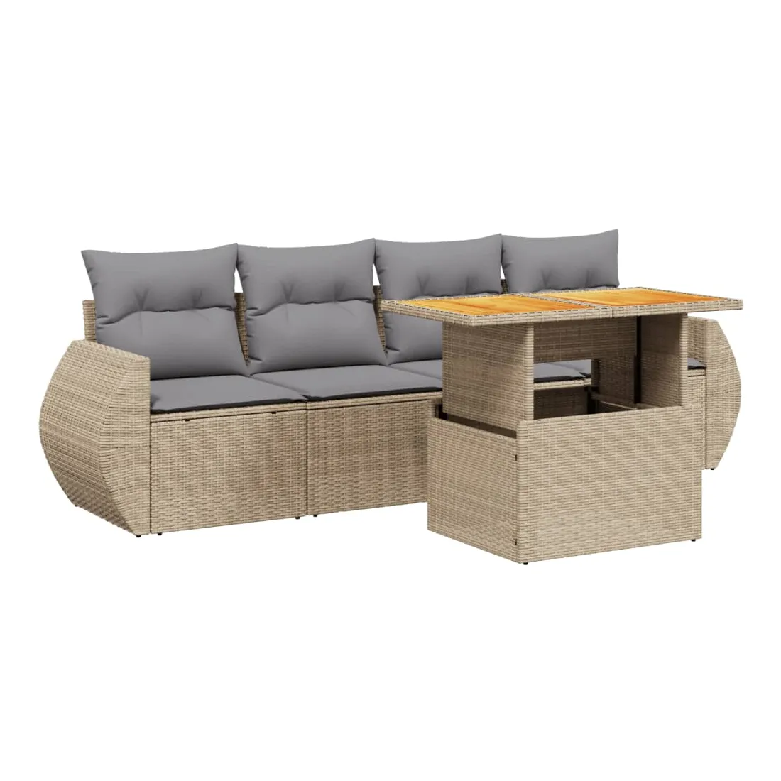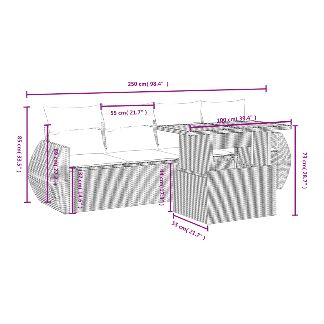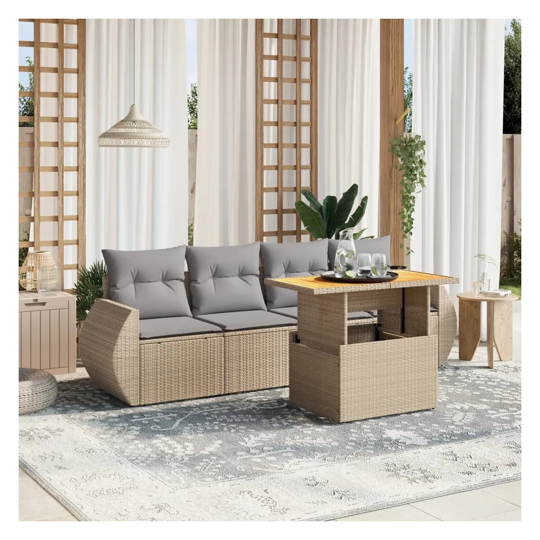 Cet ensemble de canapés de jardin est le complément parfait de votre arrière-cour, terrasse ou patio, offrant un espace confortable et accueillant pour discuter avec la famille et les amis ou simplement se détendre et profiter de l'extérieur. Matériau durable : la résine tressée, également connue sous le nom de poly rotin, est un matériau synthétique solide et nécessitant peu d'entretien qui ressemble au rotin naturel. Il est léger, facile à nettoyer et couramment utilisé pour les meubles d'extérieur en raison de sa durabilité et de ses propriétés de résistance aux intempéries.Dessus de table réglable : le dessus de table peut être soulevé pour rendre la table plus haute, ce qui transforme la table d'extérieur d'une table basse à une table de salle à manger. Elle est parfaite pour recevoir des invités ou prendre des repas à l'extérieur.Expérience d'assise confortable : ce mobilier d'extérieur, doté de coussins épais, offre une expérience d'assise confortable.Housse amovible et lavable : ces coussins de siège sont dotés de housses amovibles pour un lavage et un entretien faciles.Conception modulaire : cet ensemble de meubles d'extérieur a une conception modulaire, ce qui le rend complètement flexible et facile à déplacer, afin que vous puissiez créer un agencement de meubles d'extérieur personnalisé. Bon à savoir :Pour que vos meubles d'extérieur restent beaux, nous vous recommandons de les protéger avec une housse imperméable.