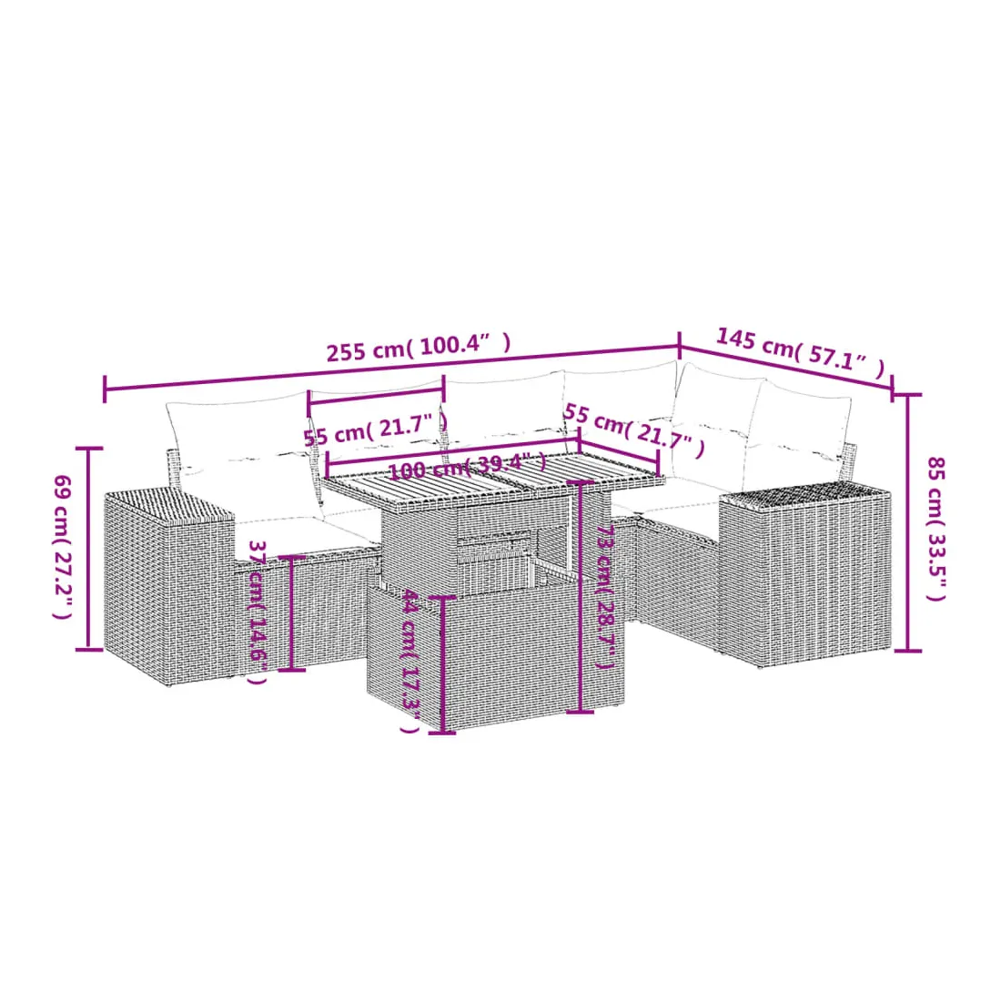 Cet ensemble de canapés de jardin est le complément parfait de votre arrière-cour, terrasse ou patio, offrant un espace confortable et accueillant pour discuter avec la famille et les amis ou simplement se détendre et profiter de l'extérieur. Matériau durable : la résine tressée, également connue sous le nom de poly rotin, est un matériau synthétique solide et nécessitant peu d'entretien qui ressemble au rotin naturel. Il est léger, facile à nettoyer et couramment utilisé pour les meubles d'extérieur en raison de sa durabilité et de ses propriétés de résistance aux intempéries.Dessus de table réglable : le dessus de table peut être soulevé pour rendre la table plus haute, ce qui transforme la table d'extérieur d'une table basse à une table de salle à manger. Elle est parfaite pour recevoir des invités ou prendre des repas à l'extérieur.Expérience d'assise confortable : ce mobilier d'extérieur, doté de coussins épais, offre une expérience d'assise confortable.Housse amovible et lavable : ces coussins de siège sont dotés de housses amovibles pour un lavage et un entretien faciles.Conception modulaire : cet ensemble de meubles d'extérieur a une conception modulaire, ce qui le rend complètement flexible et facile à déplacer, afin que vous puissiez créer un agencement de meubles d'extérieur personnalisé. Bon à savoir :Pour que vos meubles d'extérieur restent beaux, nous vous recommandons de les protéger avec une housse imperméable.