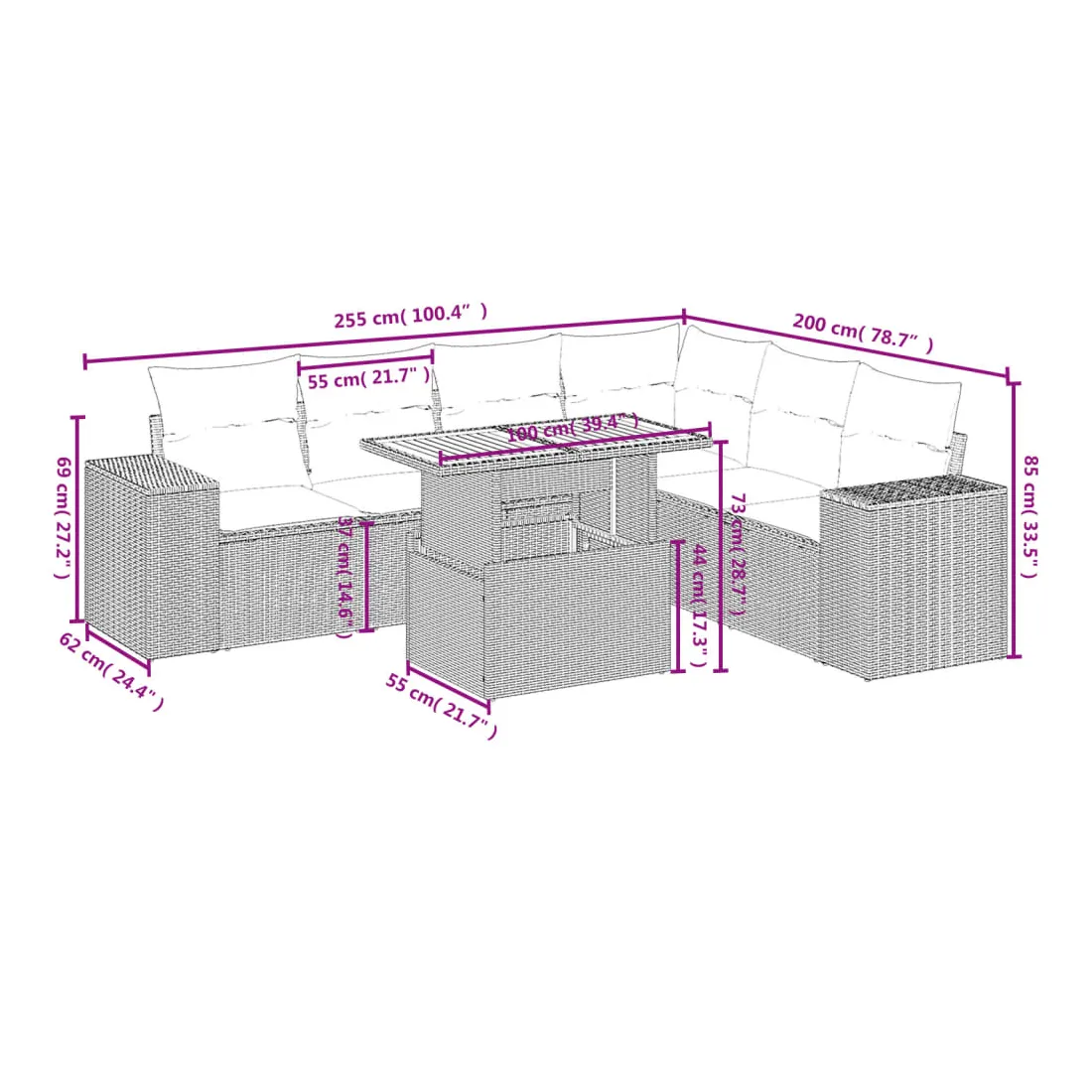 Cet ensemble de canapés de jardin est le complément parfait de votre arrière-cour, terrasse ou patio, offrant un espace confortable et accueillant pour discuter avec la famille et les amis ou simplement se détendre et profiter de l'extérieur. Matériau durable : la résine tressée, également connue sous le nom de poly rotin, est un matériau synthétique solide et nécessitant peu d'entretien qui ressemble au rotin naturel. Il est léger, facile à nettoyer et couramment utilisé pour les meubles d'extérieur en raison de sa durabilité et de ses propriétés de résistance aux intempéries.Dessus de table réglable : le dessus de table peut être soulevé pour rendre la table plus haute, ce qui transforme la table d'extérieur d'une table basse à une table de salle à manger. Elle est parfaite pour recevoir des invités ou prendre des repas à l'extérieur.Expérience d'assise confortable : ce mobilier d'extérieur, doté de coussins épais, offre une expérience d'assise confortable.Housse amovible et lavable : ces coussins de siège sont dotés de housses amovibles pour un lavage et un entretien faciles.Conception modulaire : cet ensemble de meubles d'extérieur a une conception modulaire, ce qui le rend complètement flexible et facile à déplacer, afin que vous puissiez créer un agencement de meubles d'extérieur personnalisé. Bon à savoir :Pour que vos meubles d'extérieur restent beaux, nous vous recommandons de les protéger avec une housse imperméable.