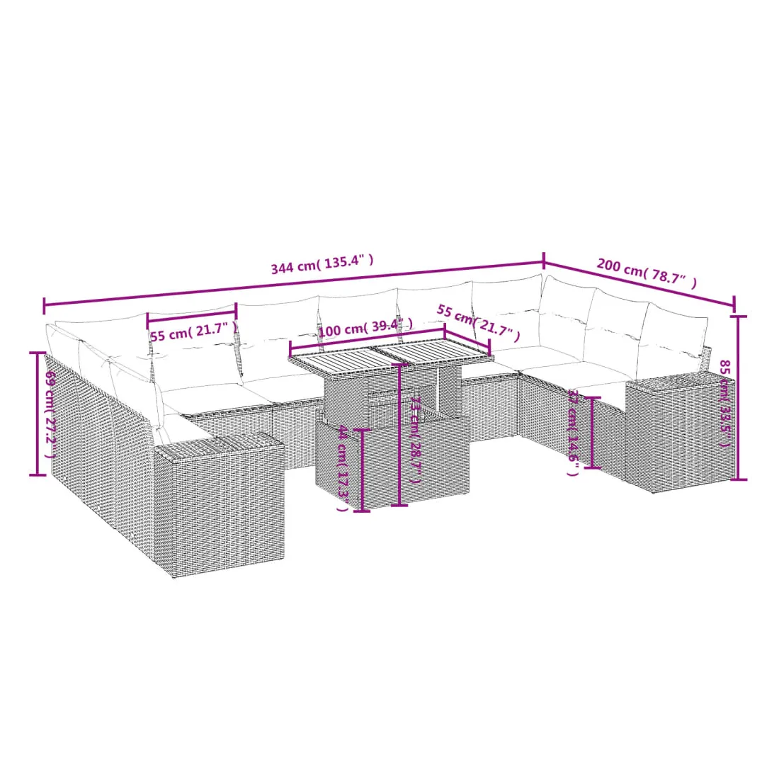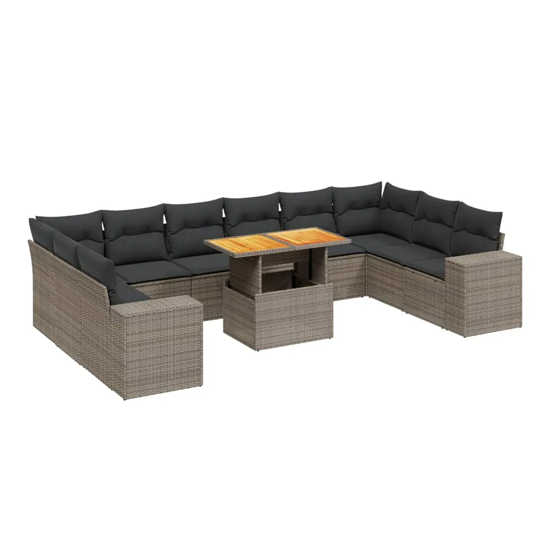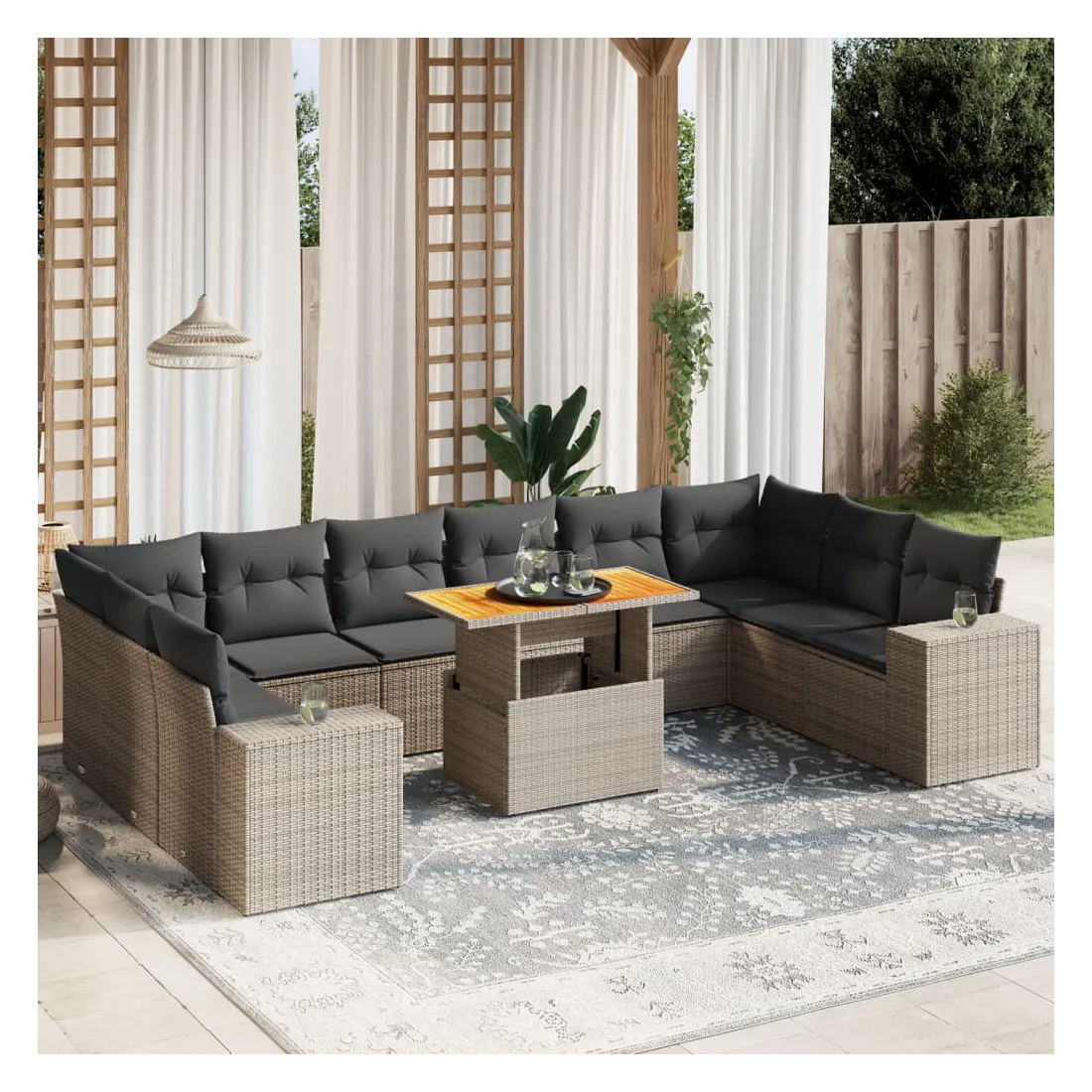 Cet ensemble de canapés de jardin est le complément parfait de votre arrière-cour, terrasse ou patio, offrant un espace confortable et accueillant pour discuter avec la famille et les amis ou simplement se détendre et profiter de l'extérieur. Matériau durable : la résine tressée, également connue sous le nom de poly rotin, est un matériau synthétique solide et nécessitant peu d'entretien qui ressemble au rotin naturel. Il est léger, facile à nettoyer et couramment utilisé pour les meubles d'extérieur en raison de sa durabilité et de ses propriétés de résistance aux intempéries.Dessus de table réglable : le dessus de table peut être soulevé pour rendre la table plus haute, ce qui transforme la table d'extérieur d'une table basse à une table de salle à manger. Elle est parfaite pour recevoir des invités ou prendre des repas à l'extérieur.Expérience d'assise confortable : ce mobilier d'extérieur, doté de coussins épais, offre une expérience d'assise confortable.Housse amovible et lavable : ces coussins de siège sont dotés de housses amovibles pour un lavage et un entretien faciles.Conception modulaire : cet ensemble de meubles d'extérieur a une conception modulaire, ce qui le rend complètement flexible et facile à déplacer, afin que vous puissiez créer un agencement de meubles d'extérieur personnalisé. Bon à savoir :Pour que vos meubles d'extérieur restent beaux, nous vous recommandons de les protéger avec une housse imperméable.