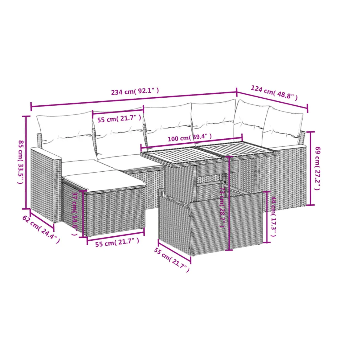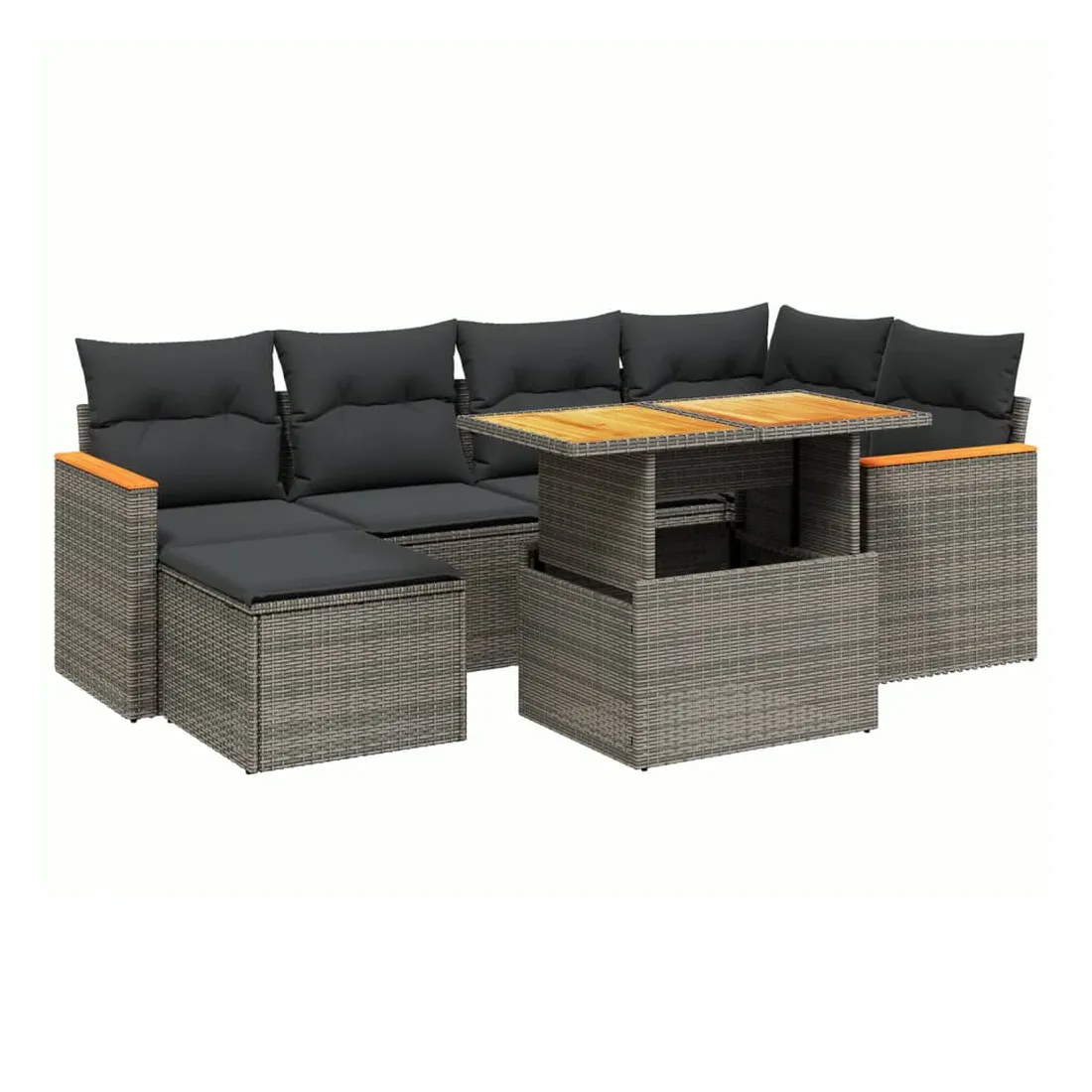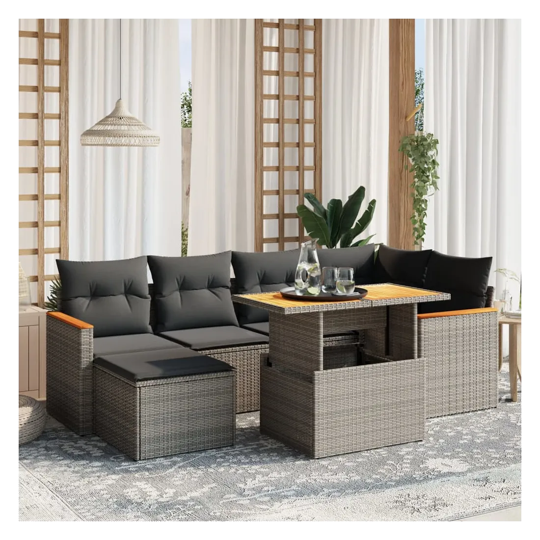 Cet ensemble de canapés de jardin est le complément parfait de votre arrière-cour, terrasse ou patio, offrant un espace confortable et accueillant pour discuter avec la famille et les amis ou simplement se détendre et profiter de l'extérieur. Matériau durable : la résine tressée, également connue sous le nom de poly rotin, est un matériau synthétique solide et nécessitant peu d'entretien qui ressemble au rotin naturel. Il est léger, facile à nettoyer et couramment utilisé pour les meubles d'extérieur en raison de sa durabilité et de ses propriétés de résistance aux intempéries.Dessus de table réglable : le dessus de table peut être soulevé pour rendre la table plus haute, ce qui transforme la table d'extérieur d'une table basse à une table de salle à manger. Elle est parfaite pour recevoir des invités ou prendre des repas à l'extérieur.Expérience d'assise confortable : ce mobilier d'extérieur, doté de coussins épais, offre une expérience d'assise confortable.Housse amovible et lavable : ces coussins de siège sont dotés de housses amovibles pour un lavage et un entretien faciles.Conception modulaire : cet ensemble de meubles d'extérieur a une conception modulaire, ce qui le rend complètement flexible et facile à déplacer, afin que vous puissiez créer un agencement de meubles d'extérieur personnalisé. Bon à savoir :Pour que vos meubles d'extérieur restent beaux, nous vous recommandons de les protéger avec une housse imperméable.