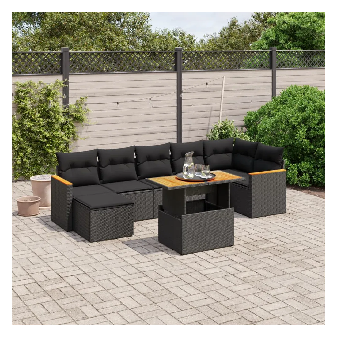 Salon de jardin 8 pcs avec coussins noir résine tressée