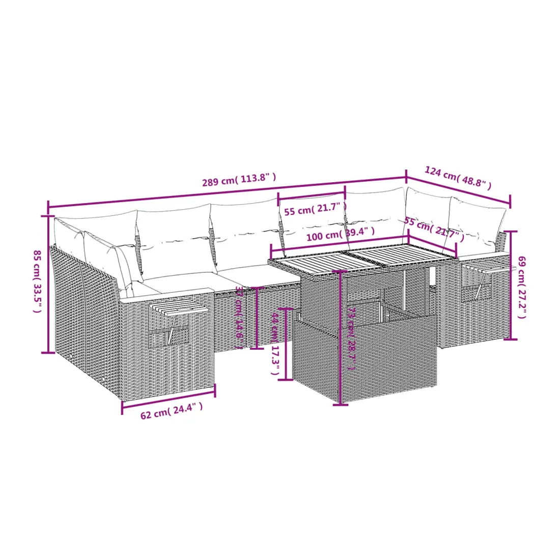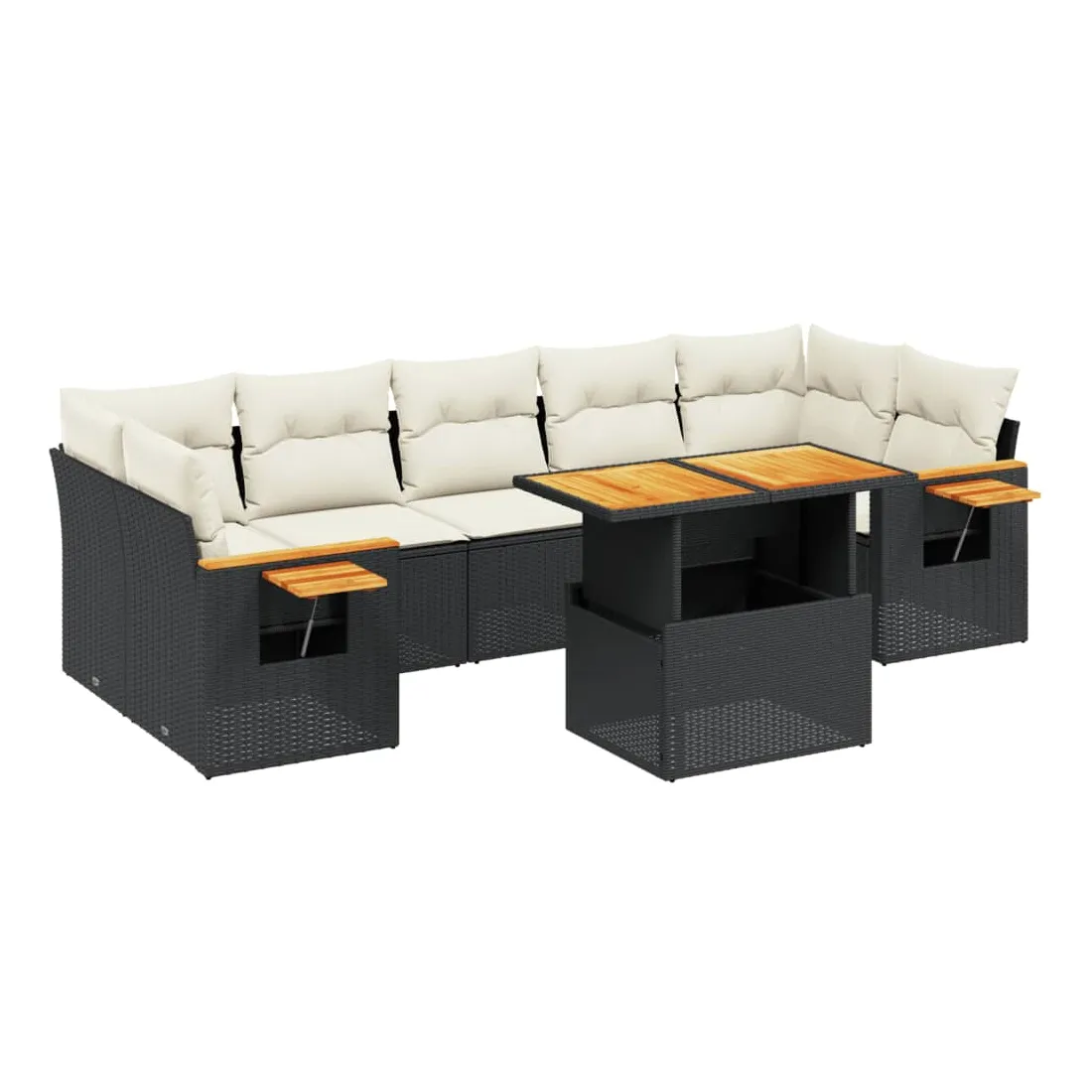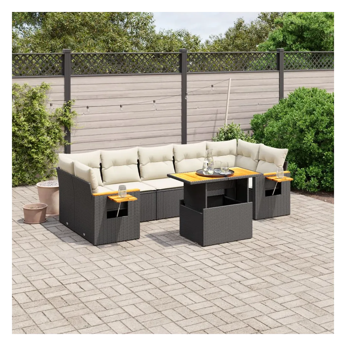 Cet ensemble de canapés de jardin est le complément parfait de votre arrière-cour, terrasse ou patio, offrant un espace confortable et accueillant pour discuter avec la famille et les amis ou simplement se détendre et profiter de l'extérieur. Matériau durable : la résine tressée, également connue sous le nom de poly rotin, est un matériau synthétique solide et nécessitant peu d'entretien qui ressemble au rotin naturel. Il est léger, facile à nettoyer et couramment utilisé pour les meubles d'extérieur en raison de sa durabilité et de ses propriétés de résistance aux intempéries.Dessus de table réglable : le dessus de table peut être soulevé pour rendre la table plus haute, ce qui transforme la table d'extérieur d'une table basse à une table de salle à manger. Elle est parfaite pour recevoir des invités ou prendre des repas à l'extérieur.Table d'appoint pratique : ce mobilier d'extérieur comprend une table d'appoint pliable avec un ressort à gaz sur les accoudoirs, offrant un endroit pratique pour garder vos essentiels à portée de main.Housse amovible et lavable : ces coussins de siège sont dotés de housses amovibles pour un lavage et un entretien faciles.Conception modulaire : cet ensemble de meubles d'extérieur a une conception modulaire, ce qui le rend complètement flexible et facile à déplacer, afin que vous puissiez créer un agencement de meubles d'extérieur personnalisé. Bon à savoir :Pour que vos meubles d'extérieur restent beaux, nous vous recommandons de les protéger avec une housse imperméable.