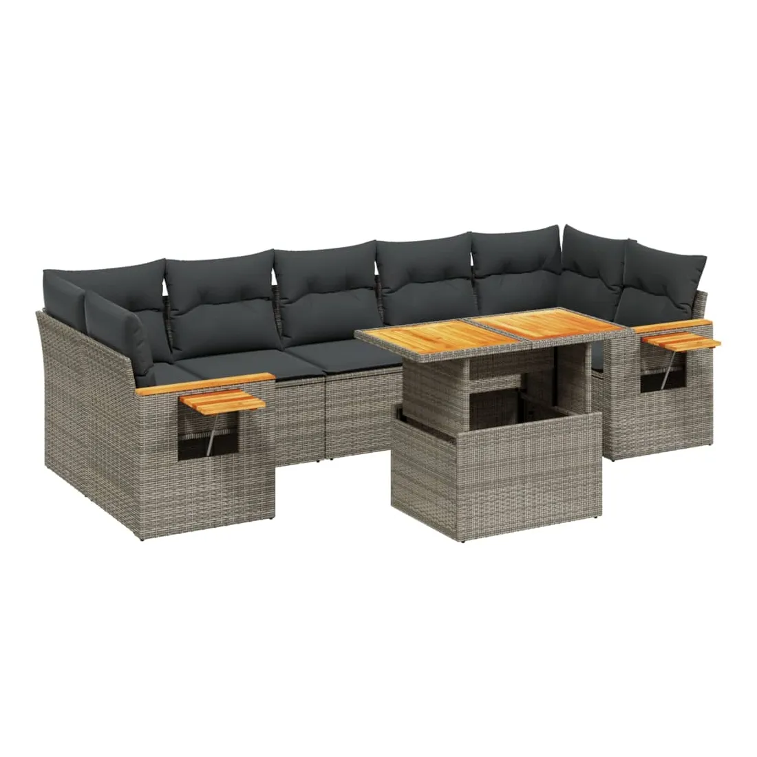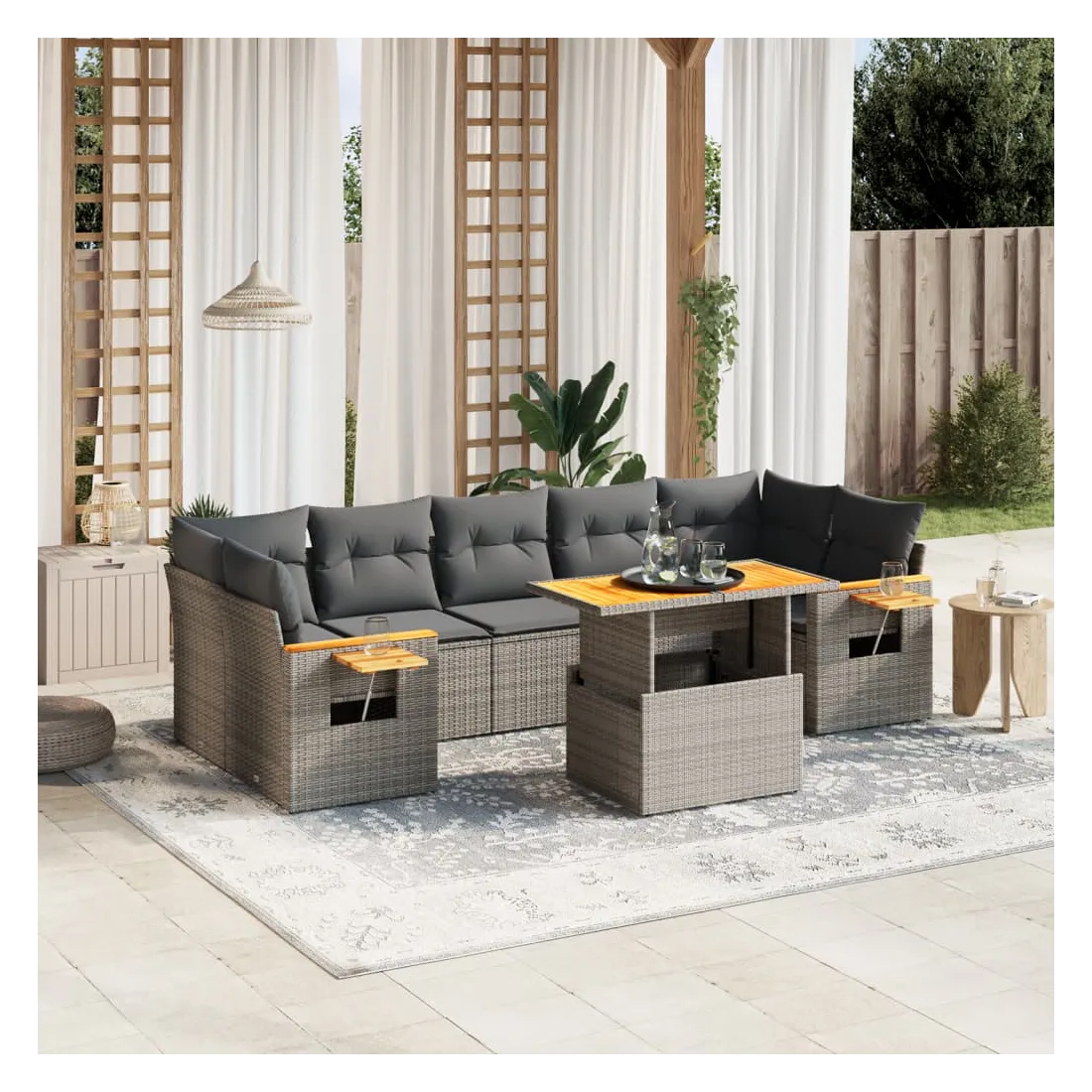 Cet ensemble de canapés de jardin est le complément parfait de votre arrière-cour, terrasse ou patio, offrant un espace confortable et accueillant pour discuter avec la famille et les amis ou simplement se détendre et profiter de l'extérieur. Matériau durable : la résine tressée, également connue sous le nom de poly rotin, est un matériau synthétique solide et nécessitant peu d'entretien qui ressemble au rotin naturel. Il est léger, facile à nettoyer et couramment utilisé pour les meubles d'extérieur en raison de sa durabilité et de ses propriétés de résistance aux intempéries.Dessus de table réglable : le dessus de table peut être soulevé pour rendre la table plus haute, ce qui transforme la table d'extérieur d'une table basse à une table de salle à manger. Elle est parfaite pour recevoir des invités ou prendre des repas à l'extérieur.Table d'appoint pratique : ce mobilier d'extérieur comprend une table d'appoint pliable avec un ressort à gaz sur les accoudoirs, offrant un endroit pratique pour garder vos essentiels à portée de main.Housse amovible et lavable : ces coussins de siège sont dotés de housses amovibles pour un lavage et un entretien faciles.Conception modulaire : cet ensemble de meubles d'extérieur a une conception modulaire, ce qui le rend complètement flexible et facile à déplacer, afin que vous puissiez créer un agencement de meubles d'extérieur personnalisé. Bon à savoir :Pour que vos meubles d'extérieur restent beaux, nous vous recommandons de les protéger avec une housse imperméable.