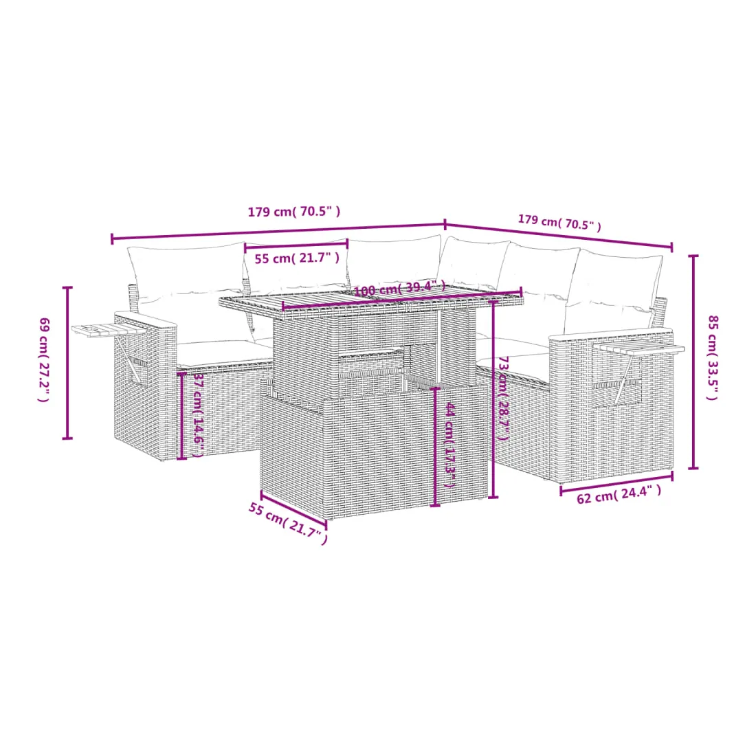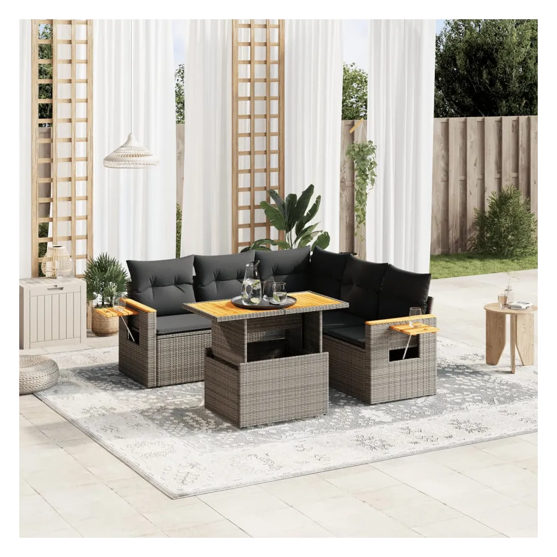 Cet ensemble de canapés de jardin est le complément parfait de votre arrière-cour, terrasse ou patio, offrant un espace confortable et accueillant pour discuter avec la famille et les amis ou simplement se détendre et profiter de l'extérieur. Matériau durable : la résine tressée, également connue sous le nom de poly rotin, est un matériau synthétique solide et nécessitant peu d'entretien qui ressemble au rotin naturel. Il est léger, facile à nettoyer et couramment utilisé pour les meubles d'extérieur en raison de sa durabilité et de ses propriétés de résistance aux intempéries.Dessus de table réglable : le dessus de table peut être soulevé pour rendre la table plus haute, ce qui transforme la table d'extérieur d'une table basse à une table de salle à manger. Elle est parfaite pour recevoir des invités ou prendre des repas à l'extérieur.Table d'appoint pratique : ce mobilier d'extérieur comprend une table d'appoint pliable avec un ressort à gaz sur les accoudoirs, offrant un endroit pratique pour garder vos essentiels à portée de main.Housse amovible et lavable : ces coussins de siège sont dotés de housses amovibles pour un lavage et un entretien faciles.Conception modulaire : cet ensemble de meubles d'extérieur a une conception modulaire, ce qui le rend complètement flexible et facile à déplacer, afin que vous puissiez créer un agencement de meubles d'extérieur personnalisé. Bon à savoir :Pour que vos meubles d'extérieur restent beaux, nous vous recommandons de les protéger avec une housse imperméable.
