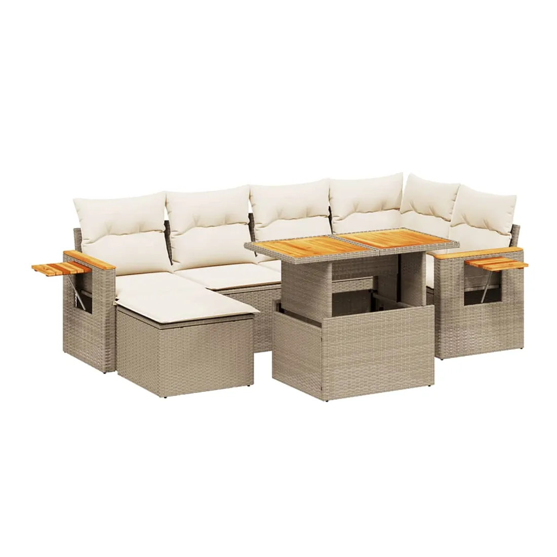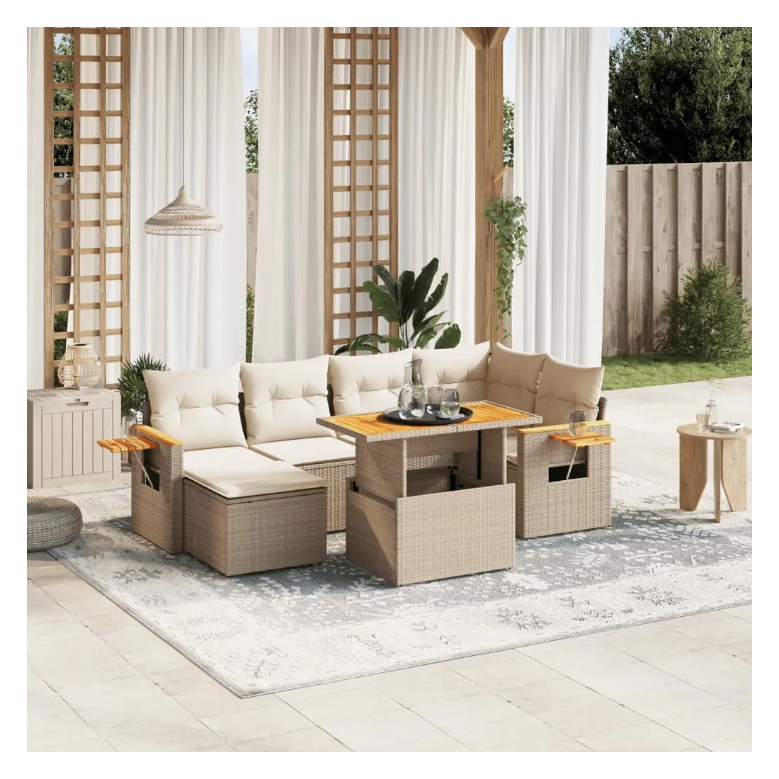 Cet ensemble de canapés de jardin est le complément parfait de votre arrière-cour, terrasse ou patio, offrant un espace confortable et accueillant pour discuter avec la famille et les amis ou simplement se détendre et profiter de l'extérieur. Matériau durable : la résine tressée, également connue sous le nom de poly rotin, est un matériau synthétique solide et nécessitant peu d'entretien qui ressemble au rotin naturel. Il est léger, facile à nettoyer et couramment utilisé pour les meubles d'extérieur en raison de sa durabilité et de ses propriétés de résistance aux intempéries.Dessus de table réglable : le dessus de table peut être soulevé pour rendre la table plus haute, ce qui transforme la table d'extérieur d'une table basse à une table de salle à manger. Elle est parfaite pour recevoir des invités ou prendre des repas à l'extérieur.Table d'appoint pratique : ce mobilier d'extérieur comprend une table d'appoint pliable avec un ressort à gaz sur les accoudoirs, offrant un endroit pratique pour garder vos essentiels à portée de main.Housse amovible et lavable : ces coussins de siège sont dotés de housses amovibles pour un lavage et un entretien faciles.Conception modulaire : cet ensemble de meubles d'extérieur a une conception modulaire, ce qui le rend complètement flexible et facile à déplacer, afin que vous puissiez créer un agencement de meubles d'extérieur personnalisé. Bon à savoir :Pour que vos meubles d'extérieur restent beaux, nous vous recommandons de les protéger avec une housse imperméable.