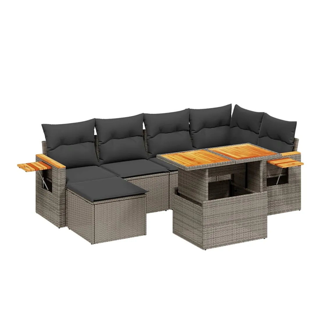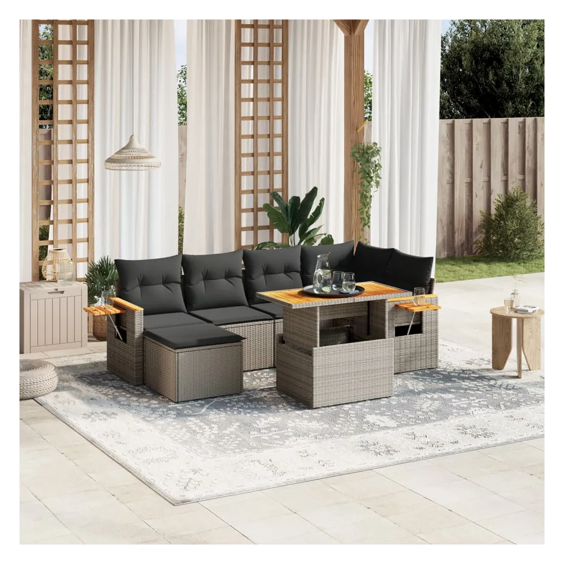 Cet ensemble de canapés de jardin est le complément parfait de votre arrière-cour, terrasse ou patio, offrant un espace confortable et accueillant pour discuter avec la famille et les amis ou simplement se détendre et profiter de l'extérieur. Matériau durable : la résine tressée, également connue sous le nom de poly rotin, est un matériau synthétique solide et nécessitant peu d'entretien qui ressemble au rotin naturel. Il est léger, facile à nettoyer et couramment utilisé pour les meubles d'extérieur en raison de sa durabilité et de ses propriétés de résistance aux intempéries.Dessus de table réglable : le dessus de table peut être soulevé pour rendre la table plus haute, ce qui transforme la table d'extérieur d'une table basse à une table de salle à manger. Elle est parfaite pour recevoir des invités ou prendre des repas à l'extérieur.Table d'appoint pratique : ce mobilier d'extérieur comprend une table d'appoint pliable avec un ressort à gaz sur les accoudoirs, offrant un endroit pratique pour garder vos essentiels à portée de main.Housse amovible et lavable : ces coussins de siège sont dotés de housses amovibles pour un lavage et un entretien faciles.Conception modulaire : cet ensemble de meubles d'extérieur a une conception modulaire, ce qui le rend complètement flexible et facile à déplacer, afin que vous puissiez créer un agencement de meubles d'extérieur personnalisé. Bon à savoir :Pour que vos meubles d'extérieur restent beaux, nous vous recommandons de les protéger avec une housse imperméable.