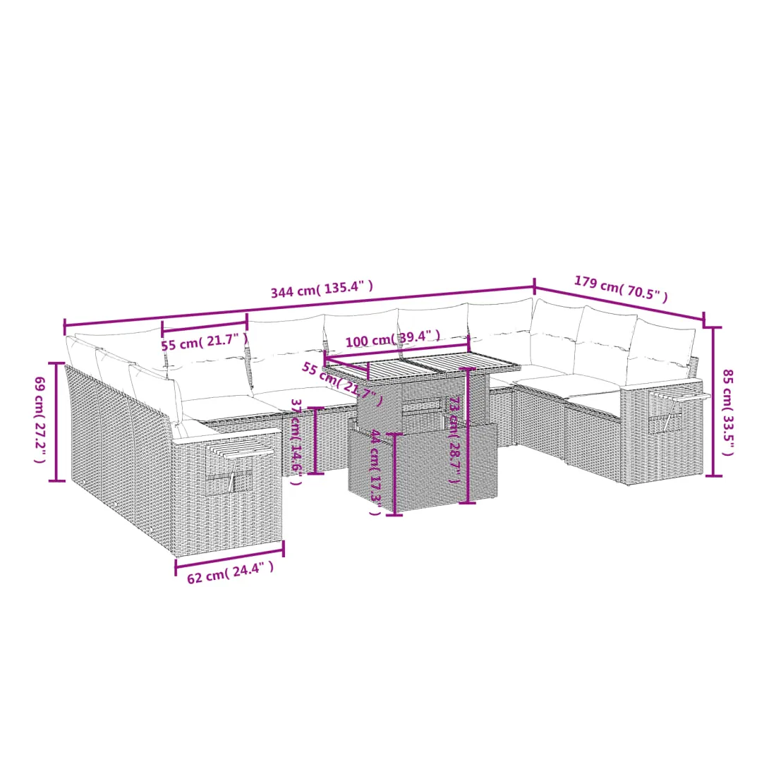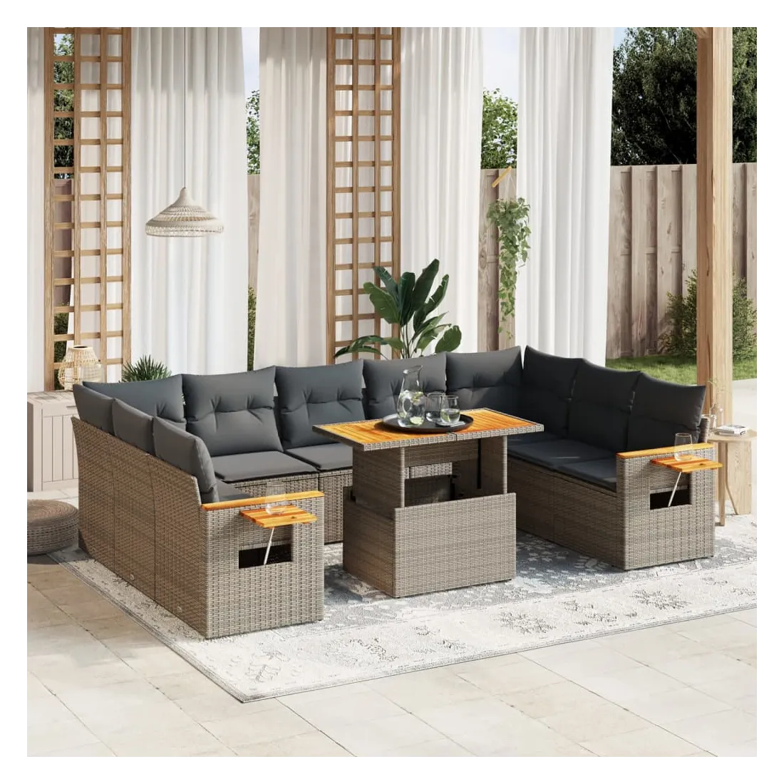 Cet ensemble de canapés de jardin est le complément parfait de votre arrière-cour, terrasse ou patio, offrant un espace confortable et accueillant pour discuter avec la famille et les amis ou simplement se détendre et profiter de l'extérieur. Matériau durable : la résine tressée, également connue sous le nom de poly rotin, est un matériau synthétique solide et nécessitant peu d'entretien qui ressemble au rotin naturel. Il est léger, facile à nettoyer et couramment utilisé pour les meubles d'extérieur en raison de sa durabilité et de ses propriétés de résistance aux intempéries.Dessus de table réglable : le dessus de table peut être soulevé pour rendre la table plus haute, ce qui transforme la table d'extérieur d'une table basse à une table de salle à manger. Elle est parfaite pour recevoir des invités ou prendre des repas à l'extérieur.Table d'appoint pratique : ce mobilier d'extérieur comprend une table d'appoint pliable avec un ressort à gaz sur les accoudoirs, offrant un endroit pratique pour garder vos essentiels à portée de main.Housse amovible et lavable : ces coussins de siège sont dotés de housses amovibles pour un lavage et un entretien faciles.Conception modulaire : cet ensemble de meubles d'extérieur a une conception modulaire, ce qui le rend complètement flexible et facile à déplacer, afin que vous puissiez créer un agencement de meubles d'extérieur personnalisé. Bon à savoir :Pour que vos meubles d'extérieur restent beaux, nous vous recommandons de les protéger avec une housse imperméable.