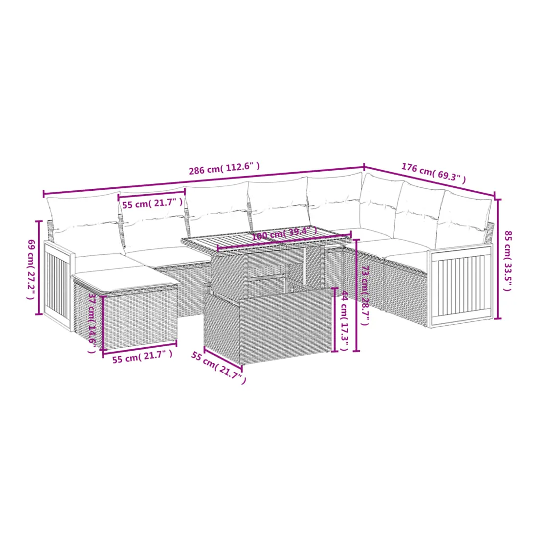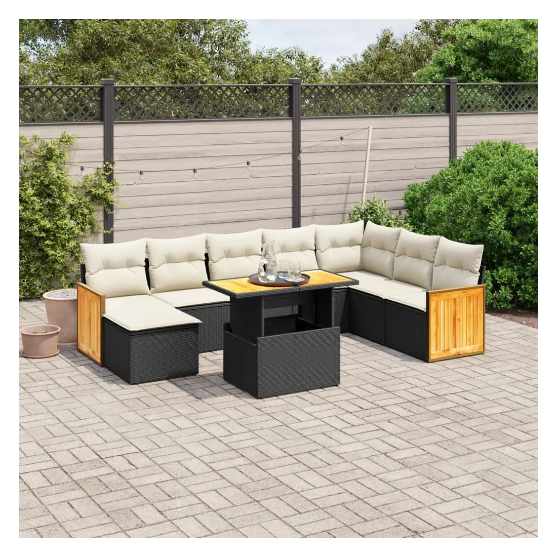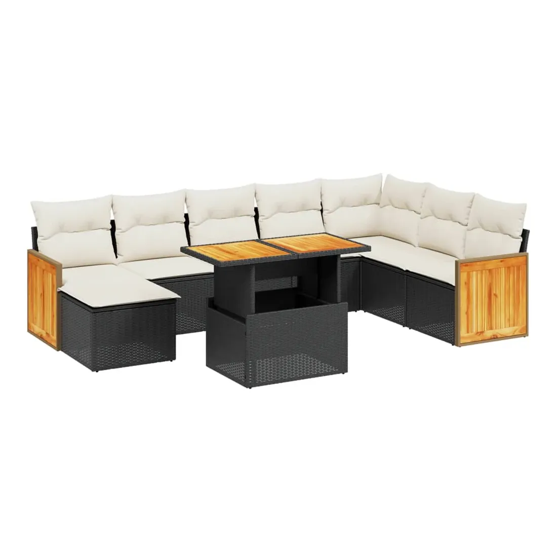 Cet ensemble de canapés de jardin est le complément parfait de votre arrière-cour, terrasse ou patio, offrant un espace confortable et accueillant pour discuter avec la famille et les amis ou simplement se détendre et profiter de l'extérieur. Matériau durable : la résine tressée, également connue sous le nom de poly rotin, est un matériau synthétique solide et nécessitant peu d'entretien qui ressemble au rotin naturel. Il est léger, facile à nettoyer et couramment utilisé pour les meubles d'extérieur en raison de sa durabilité et de ses propriétés de résistance aux intempéries.Dessus de table réglable : le dessus de table peut être soulevé pour rendre la table plus haute, ce qui transforme la table d'extérieur d'une table basse à une table de salle à manger. Elle est parfaite pour recevoir des invités ou prendre des repas à l'extérieur.Housse amovible et lavable : ces coussins de siège sont dotés de housses amovibles pour un lavage et un entretien faciles.Conception modulaire : cet ensemble de meubles d'extérieur a une conception modulaire, ce qui le rend complètement flexible et facile à déplacer, afin que vous puissiez créer un agencement de meubles d'extérieur personnalisé. Bon à savoir :Pour que vos meubles d'extérieur restent beaux, nous vous recommandons de les protéger avec une housse imperméable.