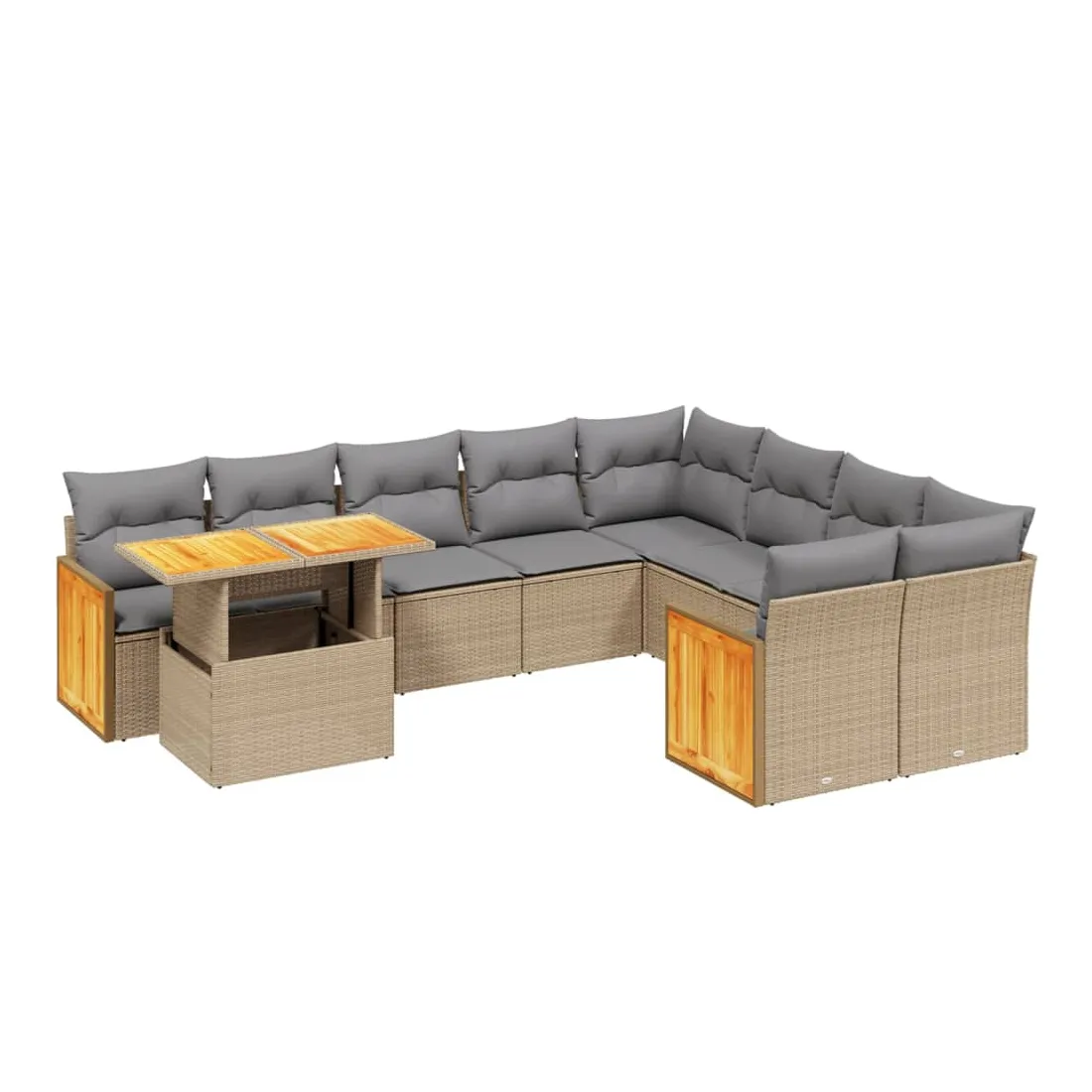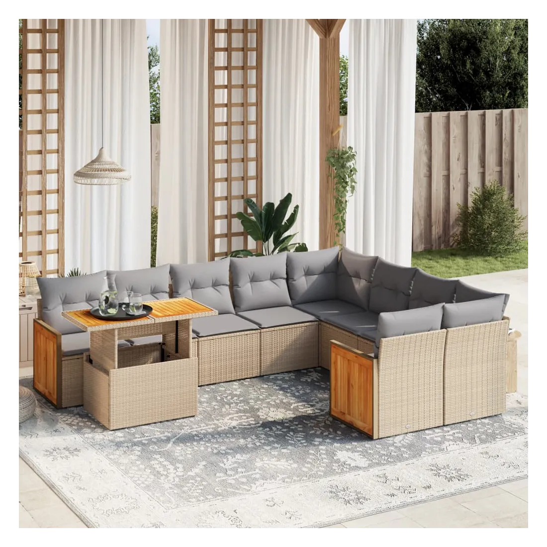 Cet ensemble de canapés de jardin est le complément parfait de votre arrière-cour, terrasse ou patio, offrant un espace confortable et accueillant pour discuter avec la famille et les amis ou simplement se détendre et profiter de l'extérieur. Matériau durable : la résine tressée, également connue sous le nom de poly rotin, est un matériau synthétique solide et nécessitant peu d'entretien qui ressemble au rotin naturel. Il est léger, facile à nettoyer et couramment utilisé pour les meubles d'extérieur en raison de sa durabilité et de ses propriétés de résistance aux intempéries.Dessus de table réglable : le dessus de table peut être soulevé pour rendre la table plus haute, ce qui transforme la table d'extérieur d'une table basse à une table de salle à manger. Elle est parfaite pour recevoir des invités ou prendre des repas à l'extérieur.Housse amovible et lavable : ces coussins de siège sont dotés de housses amovibles pour un lavage et un entretien faciles.Conception modulaire : cet ensemble de meubles d'extérieur a une conception modulaire, ce qui le rend complètement flexible et facile à déplacer, afin que vous puissiez créer un agencement de meubles d'extérieur personnalisé. Bon à savoir :Pour que vos meubles d'extérieur restent beaux, nous vous recommandons de les protéger avec une housse imperméable.
