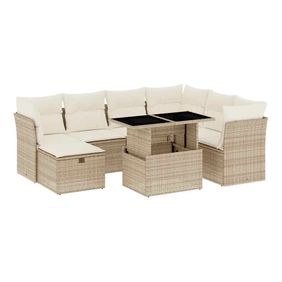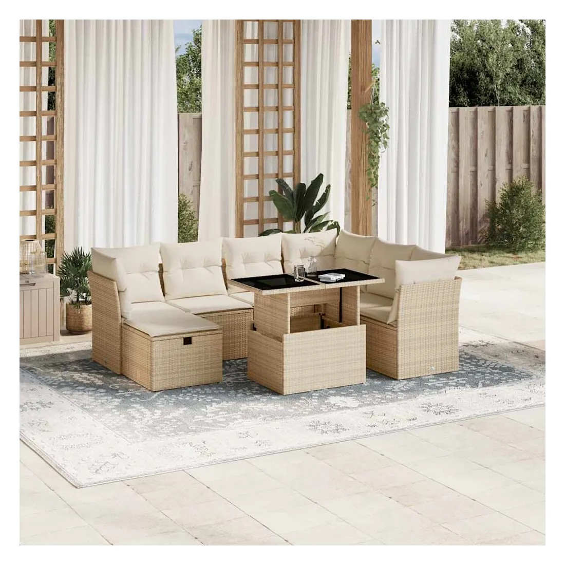 Cet ensemble de canapés de jardin est le complément parfait de votre arrière-cour, terrasse ou patio, offrant un espace confortable et accueillant pour discuter avec la famille et les amis ou simplement se détendre et profiter de l'extérieur. Matériau durable : la résine tressée, également connue sous le nom de poly rotin, est un matériau synthétique solide et nécessitant peu d'entretien qui ressemble au rotin naturel. Il est léger, facile à nettoyer et couramment utilisé pour les meubles d'extérieur en raison de sa durabilité et de ses propriétés de résistance aux intempéries.Dessus de table réglable : le dessus de table peut être soulevé pour rendre la table plus haute, ce qui transforme la table d'extérieur d'une table basse à une table de salle à manger. Elle est parfaite pour recevoir des invités ou prendre des repas à l'extérieur.Housse amovible et lavable : ces coussins de siège sont dotés de housses amovibles pour un lavage et un entretien faciles.Conception modulaire : cet ensemble de meubles d'extérieur a une conception modulaire, ce qui le rend complètement flexible et facile à déplacer, afin que vous puissiez créer un agencement de meubles d'extérieur personnalisé. Bon à savoir :Pour que vos meubles d'extérieur restent beaux, nous vous recommandons de les protéger avec une housse imperméable.