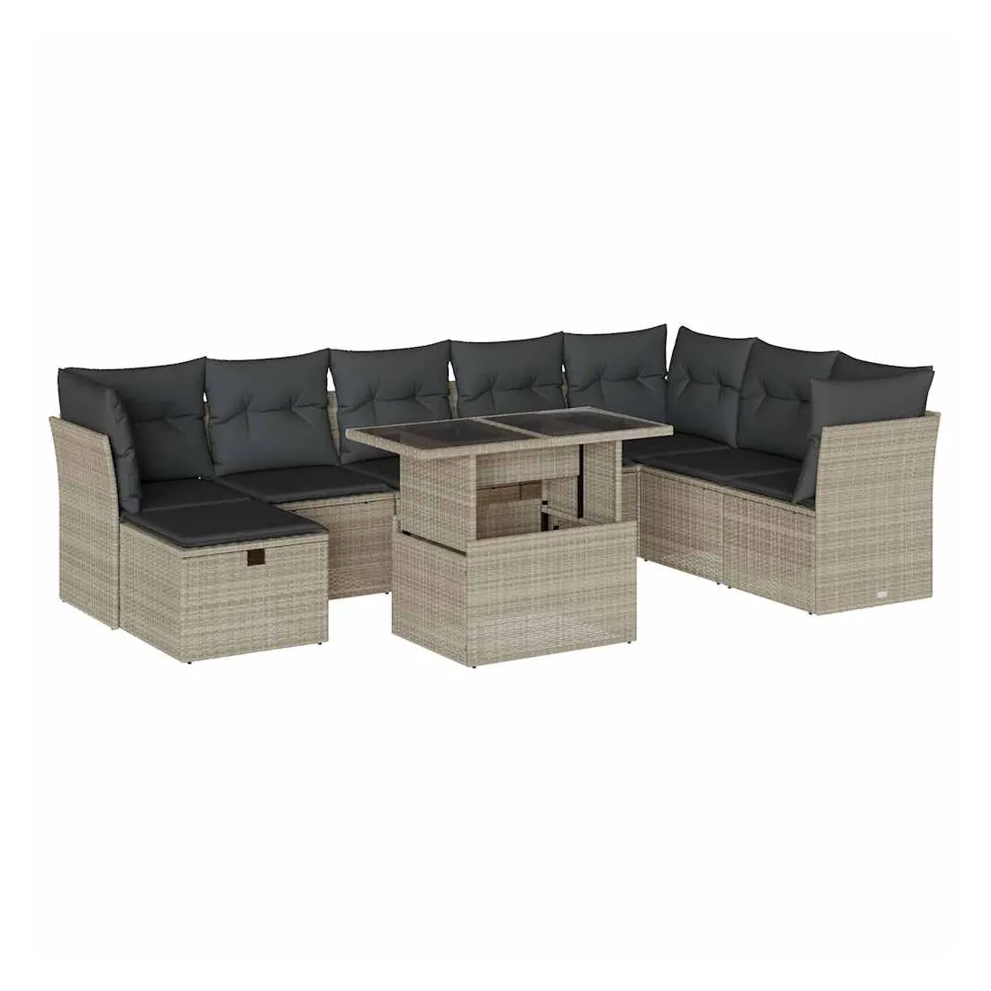 Cet ensemble de canapés de jardin est le complément parfait de votre arrière-cour, terrasse ou patio, offrant un espace confortable et accueillant pour discuter avec la famille et les amis ou simplement se détendre et profiter de l'extérieur. Matériau durable : la résine tressée, également connue sous le nom de poly rotin, est un matériau synthétique solide et nécessitant peu d'entretien qui ressemble au rotin naturel. Elle est légère, facile à nettoyer et couramment utilisée pour les meubles d'extérieur en raison de sa durabilité et de ses propriétés de résistance aux intempéries.Dessus de table réglable : le dessus de table peut être soulevé pour rendre la table plus haute, ce qui transforme la table d'extérieur d'une table basse à une table de salle à manger. Elle est parfaite pour recevoir des invités ou prendre des repas à l'extérieur.Housse amovible et lavable : ces coussins de siège sont dotés de housses amovibles pour un lavage et un entretien faciles.Conception modulaire : cet ensemble de meubles d'extérieur a une conception modulaire, ce qui le rend complètement flexible et facile à déplacer, afin que vous puissiez créer un agencement de meubles d'extérieur personnalisé. Bon à savoir :Pour que vos meubles d'extérieur restent beaux, nous vous recommandons de les protéger avec une housse imperméable.
