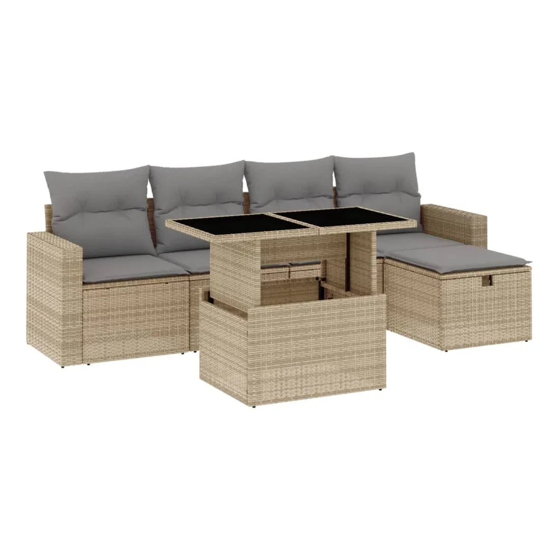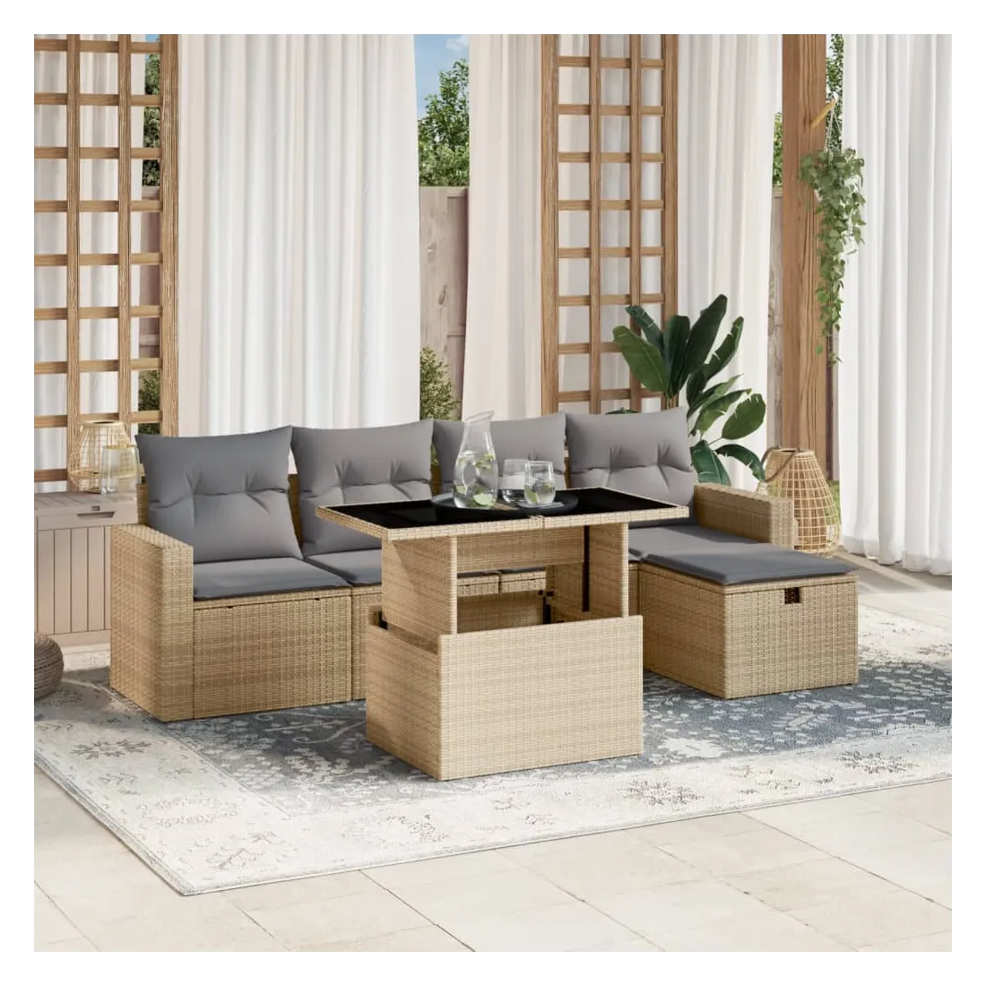 Cet ensemble de canapés de jardin est le complément parfait de votre arrière-cour, terrasse ou patio, offrant un espace confortable et accueillant pour discuter avec la famille et les amis ou simplement se détendre et profiter de l'extérieur. Matériau durable : la résine tressée, également connue sous le nom de poly rotin, est un matériau synthétique solide et nécessitant peu d'entretien qui ressemble au rotin naturel. Il est léger, facile à nettoyer et couramment utilisé pour les meubles d'extérieur en raison de sa durabilité et de ses propriétés de résistance aux intempéries.Dessus de table réglable : le dessus de table peut être soulevé pour rendre la table plus haute, ce qui transforme la table d'extérieur d'une table basse à une table de salle à manger. Elle est parfaite pour recevoir des invités ou prendre des repas à l'extérieur.Housse amovible et lavable : ces coussins de siège sont dotés de housses amovibles pour un lavage et un entretien faciles.Conception modulaire : cet ensemble de meubles d'extérieur a une conception modulaire, ce qui le rend complètement flexible et facile à déplacer, afin que vous puissiez créer un agencement de meubles d'extérieur personnalisé. Bon à savoir :Pour que vos meubles d'extérieur restent beaux, nous vous recommandons de les protéger avec une housse imperméable.