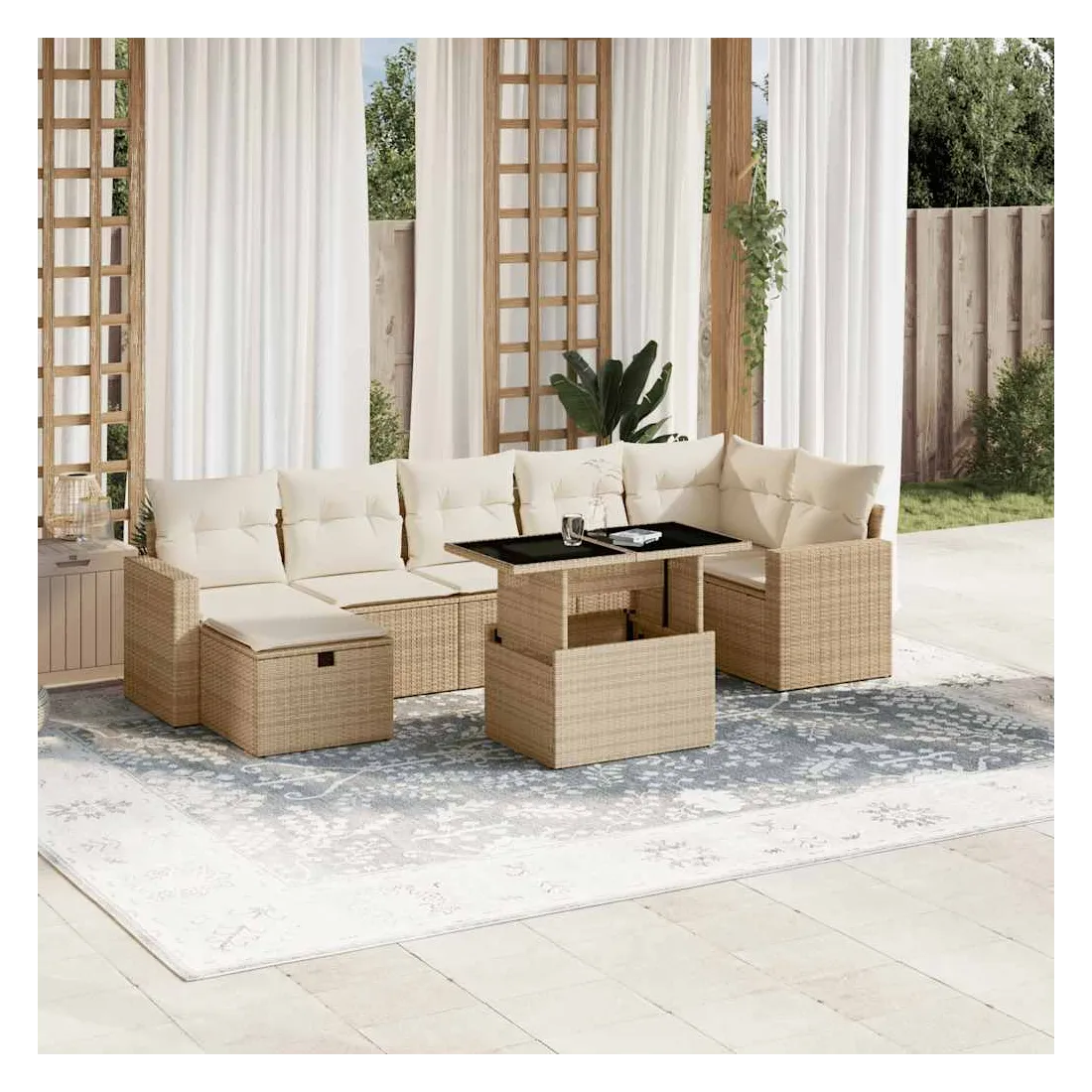Cet ensemble de canapés de jardin est le complément parfait de votre arrière-cour, terrasse ou patio, offrant un espace confortable et accueillant pour discuter avec la famille et les amis ou simplement se détendre et profiter de l'extérieur. Matériau durable : la résine tressée, également connue sous le nom de poly rotin, est un matériau synthétique solide et nécessitant peu d'entretien qui ressemble au rotin naturel. Il est léger, facile à nettoyer et couramment utilisé pour les meubles d'extérieur en raison de sa durabilité et de ses propriétés de résistance aux intempéries.Dessus de table réglable : le dessus de table peut être soulevé pour rendre la table plus haute, ce qui transforme la table d'extérieur d'une table basse à une table de salle à manger. Elle est parfaite pour recevoir des invités ou prendre des repas à l'extérieur.Housse amovible et lavable : ces coussins de siège sont dotés de housses amovibles pour un lavage et un entretien faciles.Conception modulaire : cet ensemble de meubles d'extérieur a une conception modulaire, ce qui le rend complètement flexible et facile à déplacer, afin que vous puissiez créer un agencement de meubles d'extérieur personnalisé. Bon à savoir :Pour que vos meubles d'extérieur restent beaux, nous vous recommandons de les protéger avec une housse imperméable.
