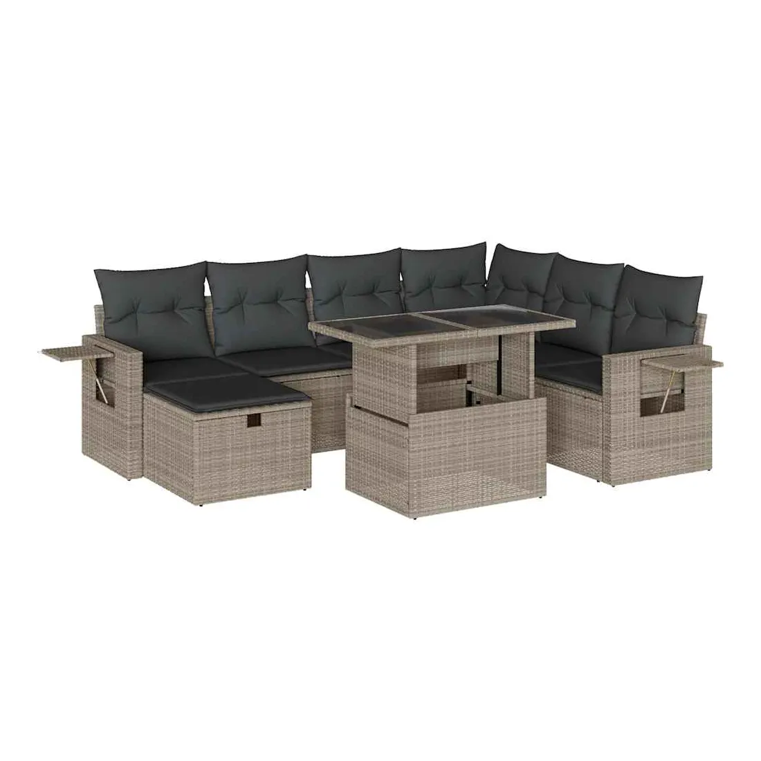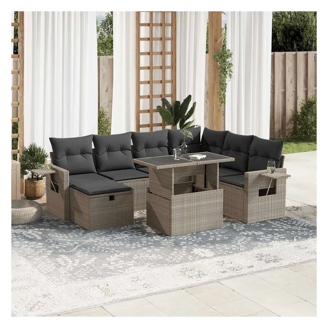 Cet ensemble de canapés de jardin est le complément parfait de votre arrière-cour, terrasse ou patio, offrant un espace confortable et accueillant pour discuter avec la famille et les amis ou simplement se détendre et profiter de l'extérieur. Matériau durable : la résine tressée, également connue sous le nom de poly rotin, est un matériau synthétique solide et nécessitant peu d'entretien qui ressemble au rotin naturel. Elle est légère, facile à nettoyer et couramment utilisée pour les meubles d'extérieur en raison de sa durabilité et de ses propriétés de résistance aux intempéries.Dessus de table réglable : le dessus de table peut être soulevé pour rendre la table plus haute, ce qui transforme la table d'extérieur d'une table basse à une table de salle à manger. Elle est parfaite pour recevoir des invités ou prendre des repas à l'extérieur.Housse amovible et lavable : ces coussins de siège sont dotés de housses amovibles pour un lavage et un entretien faciles.Conception modulaire : cet ensemble de meubles d'extérieur a une conception modulaire, ce qui le rend complètement flexible et facile à déplacer, afin que vous puissiez créer un agencement de meubles d'extérieur personnalisé. Bon à savoir :Pour que vos meubles d'extérieur restent beaux, nous vous recommandons de les protéger avec une housse imperméable.