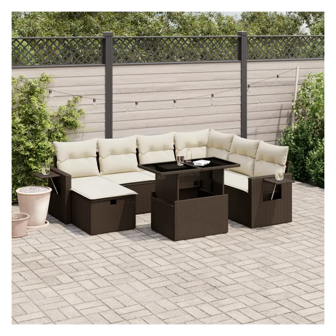 Cet ensemble de canapés de jardin est le complément parfait de votre arrière-cour, terrasse ou patio, offrant un espace confortable et accueillant pour discuter avec la famille et les amis ou simplement se détendre et profiter de l'extérieur. Matériau durable : la résine tressée, également connue sous le nom de poly rotin, est un matériau synthétique solide et nécessitant peu d'entretien qui ressemble au rotin naturel. Il est léger, facile à nettoyer et couramment utilisé pour les meubles d'extérieur en raison de sa durabilité et de ses propriétés de résistance aux intempéries.Dessus de table réglable : le dessus de table peut être soulevé pour rendre la table plus haute, ce qui transforme la table d'extérieur d'une table basse à une table de salle à manger. Elle est parfaite pour recevoir des invités ou prendre des repas à l'extérieur.Housse amovible et lavable : ces coussins de siège sont dotés de housses amovibles pour un lavage et un entretien faciles.Conception modulaire : cet ensemble de meubles d'extérieur a une conception modulaire, ce qui le rend complètement flexible et facile à déplacer, afin que vous puissiez créer un agencement de meubles d'extérieur personnalisé. Bon à savoir :Pour que vos meubles d'extérieur restent beaux, nous vous recommandons de les protéger avec une housse imperméable.