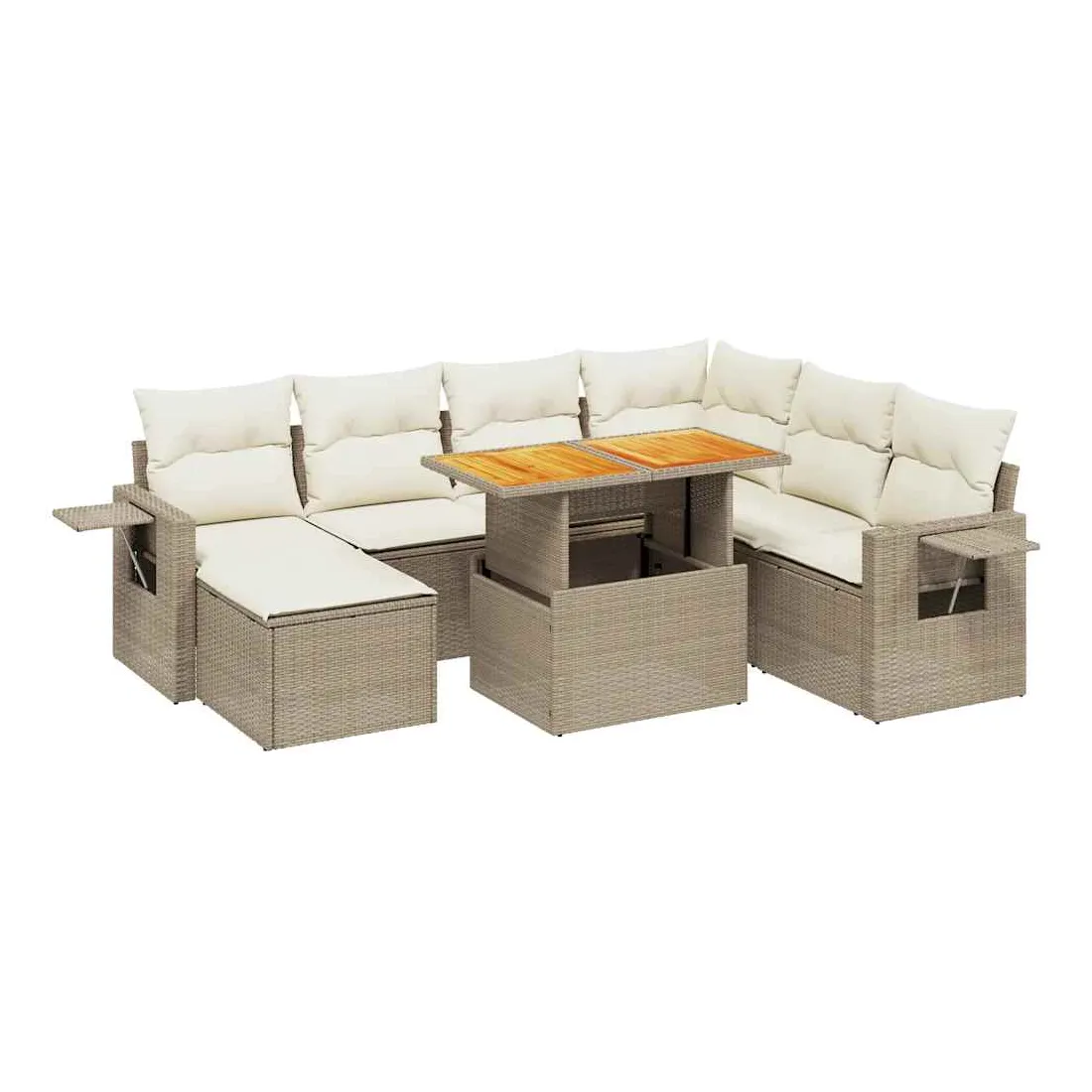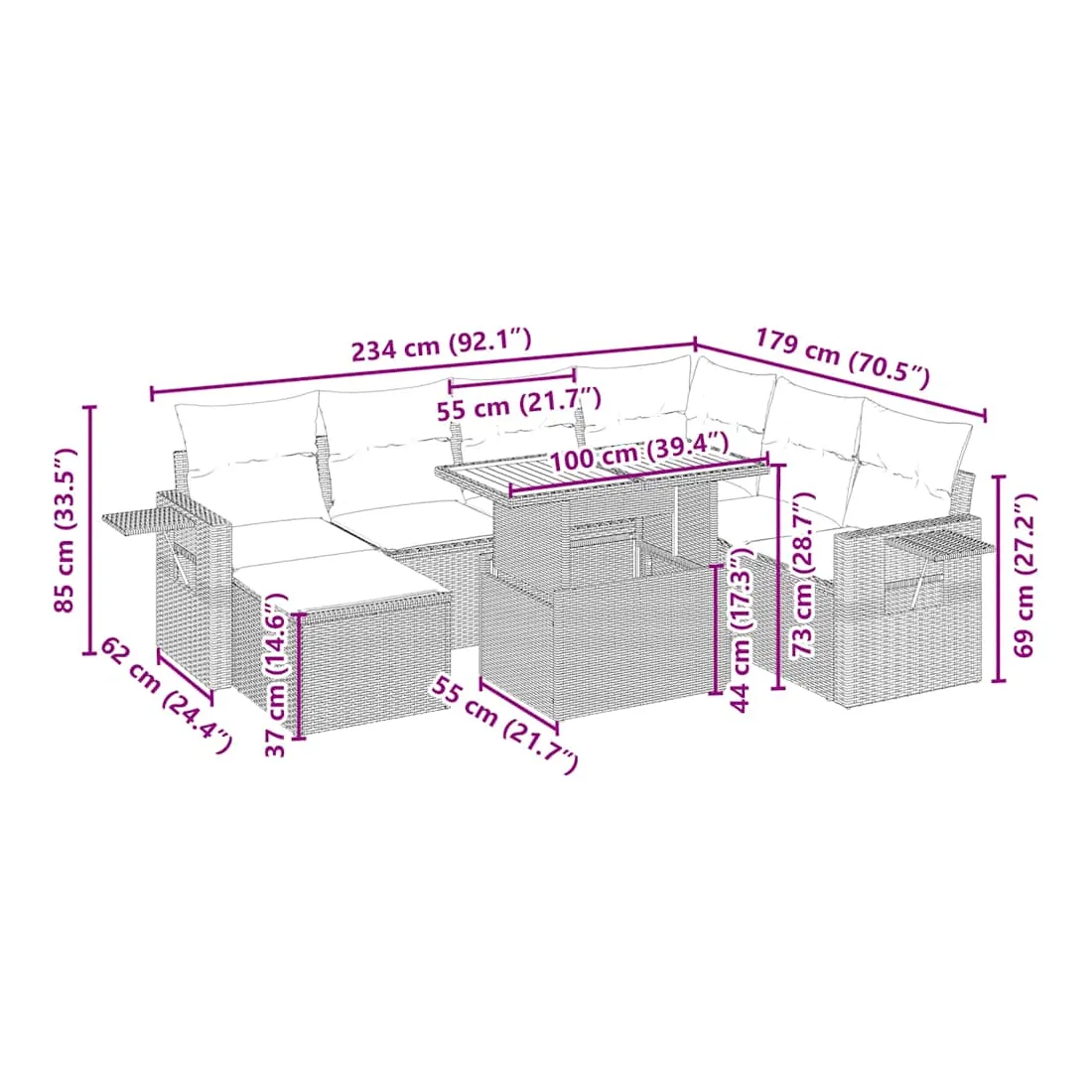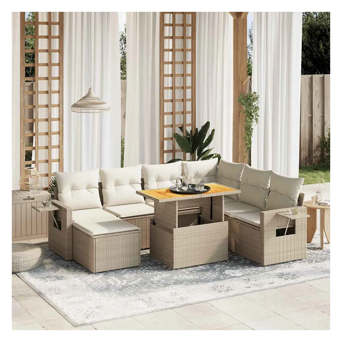 Cet ensemble de canapés de jardin est le complément parfait de votre arrière-cour, terrasse ou patio, offrant un espace confortable et accueillant pour discuter avec la famille et les amis ou simplement se détendre et profiter de l'extérieur. Matériau durable : la résine tressée, également connue sous le nom de poly rotin, est un matériau synthétique solide et nécessitant peu d'entretien qui ressemble au rotin naturel. Il est léger, facile à nettoyer et couramment utilisé pour les meubles d'extérieur en raison de sa durabilité et de ses propriétés de résistance aux intempéries.Dessus de table réglable : le dessus de table peut être soulevé pour rendre la table plus haute, ce qui transforme la table d'extérieur d'une table basse à une table de salle à manger. Elle est parfaite pour recevoir des invités ou prendre des repas à l'extérieur.Housse amovible et lavable : ces coussins de siège sont dotés de housses amovibles pour un lavage et un entretien faciles.Conception modulaire : cet ensemble de meubles d'extérieur a une conception modulaire, ce qui le rend complètement flexible et facile à déplacer, afin que vous puissiez créer un agencement de meubles d'extérieur personnalisé. Bon à savoir :Pour que vos meubles d'extérieur restent beaux, nous vous recommandons de les protéger avec une housse imperméable.