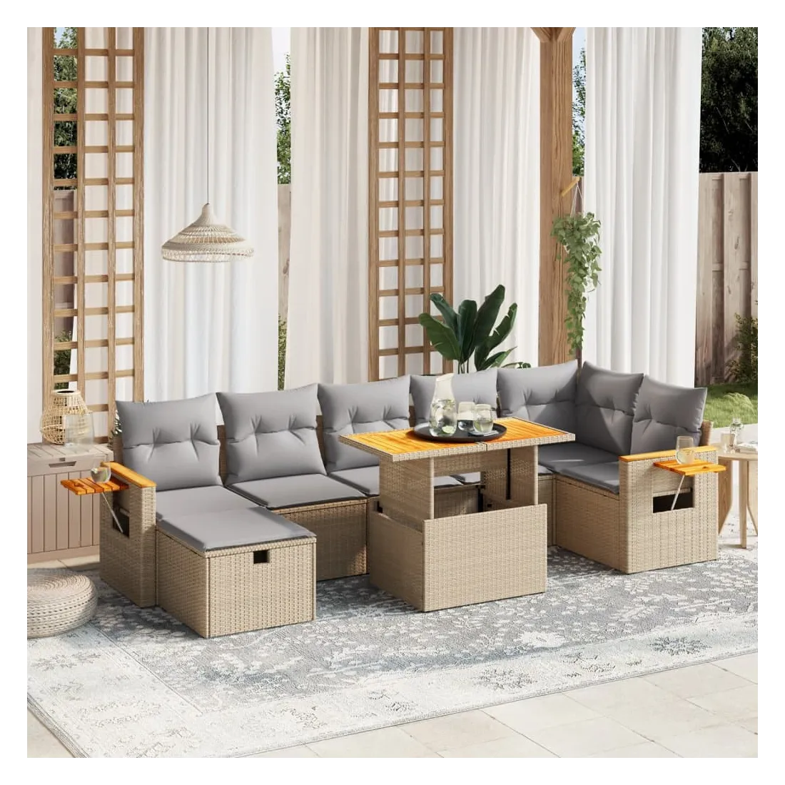 Cet ensemble de canapés de jardin est le complément parfait de votre arrière-cour, terrasse ou patio, offrant un espace confortable et accueillant pour discuter avec la famille et les amis ou simplement se détendre et profiter de l'extérieur. Matériau durable : la résine tressée, également connue sous le nom de poly rotin, est un matériau synthétique solide et nécessitant peu d'entretien qui ressemble au rotin naturel. Il est léger, facile à nettoyer et couramment utilisé pour les meubles d'extérieur en raison de sa durabilité et de ses propriétés de résistance aux intempéries.Dessus de table réglable : le dessus de table peut être soulevé pour rendre la table plus haute, ce qui transforme la table d'extérieur d'une table basse à une table de salle à manger. Elle est parfaite pour recevoir des invités ou prendre des repas à l'extérieur.Table d'appoint pratique : ce mobilier d'extérieur comprend une table d'appoint pliable avec un ressort à gaz sur les accoudoirs, offrant un endroit pratique pour garder vos essentiels à portée de main.Housse amovible et lavable : ces coussins de siège sont dotés de housses amovibles pour un lavage et un entretien faciles.Conception modulaire : cet ensemble de meubles d'extérieur a une conception modulaire, ce qui le rend complètement flexible et facile à déplacer, afin que vous puissiez créer un agencement de meubles d'extérieur personnalisé. Bon à savoir :Pour que vos meubles d'extérieur restent beaux, nous vous recommandons de les protéger avec une housse imperméable.