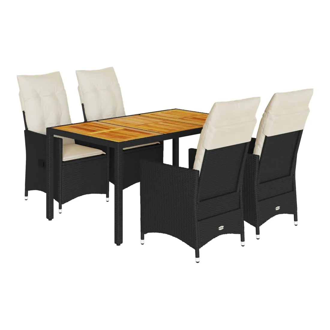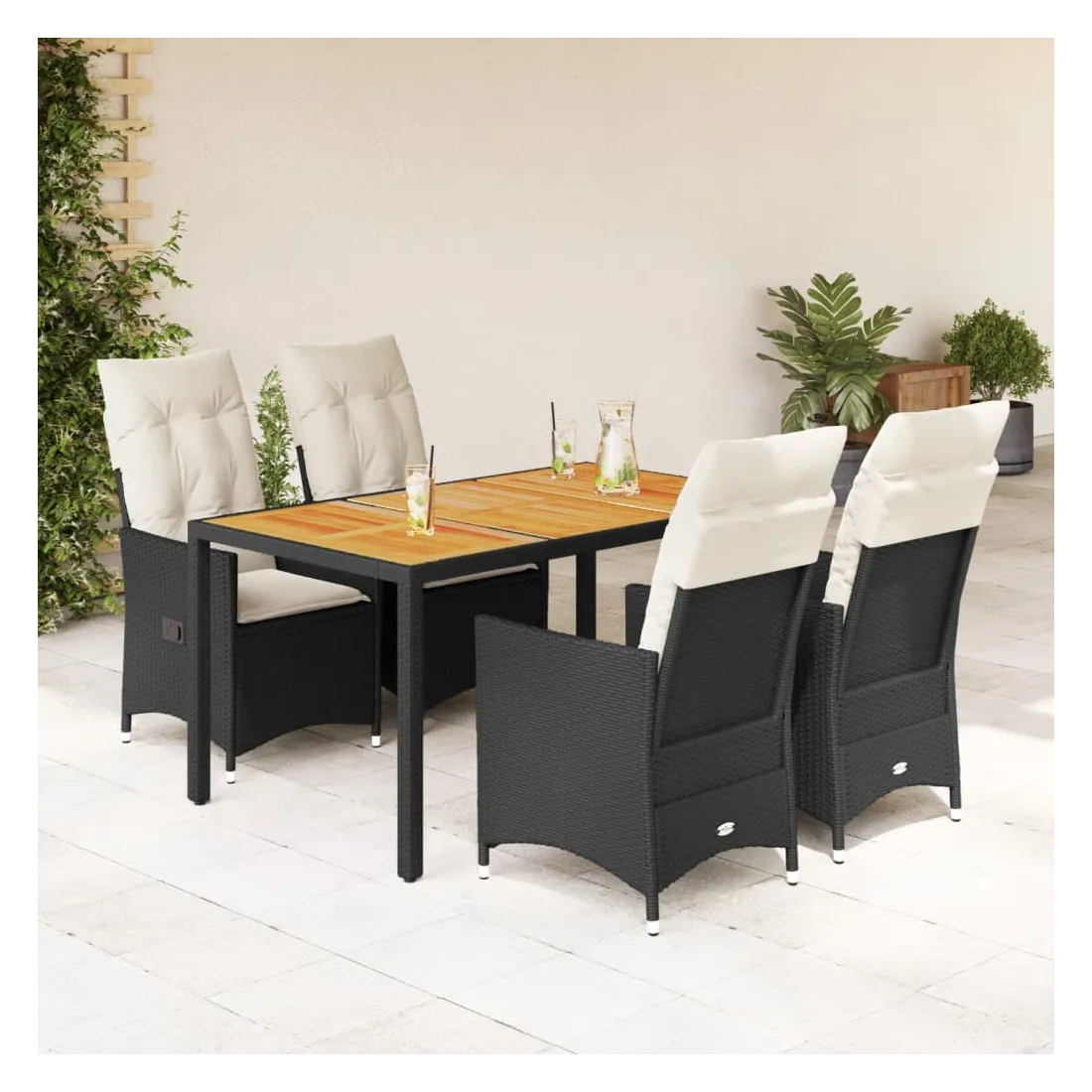 Cet ensemble de salle à manger de jardin est un excellent choix pour les repas en plein air ou pour vous détendre dans le jardin, dans l'arrière-cour ou sur la terrasse. Matériau durable : la résine tressée, également connue sous le nom de poly rotin, est un matériau synthétique solide et nécessitant peu d'entretien qui ressemble au rotin naturel. Il est léger, facile à nettoyer et couramment utilisé pour les meubles d'extérieur en raison de sa durabilité et de ses propriétés de résistance aux intempéries.Dossier réglable : ce siège de jardin est doté d'une poignée. Vous pouvez régler le dossier dans n'importe quelle position en tirant sur la poignée et le remettre rapidement dans sa position initiale.Dessus stable et facile à nettoyer : cette table de jardin a un dessus en bois d'acacia robuste, durable et facile à nettoyer avec un chiffon humide.Expérience d'assise confortable : cet ensemble de meubles d'extérieur, doté de coussins épais, offre une expérience d'assise confortable.Housse amovible et lavable : ces coussins de siège sont dotés de housses amovibles pour un lavage et un entretien faciles. Les coussins de dossier ont un rabat à l'arrière pour une fixation facile aux dossiers. Bon à savoir :Pour que vos meubles d'extérieur restent beaux, nous vous recommandons de les protéger avec une housse imperméable.