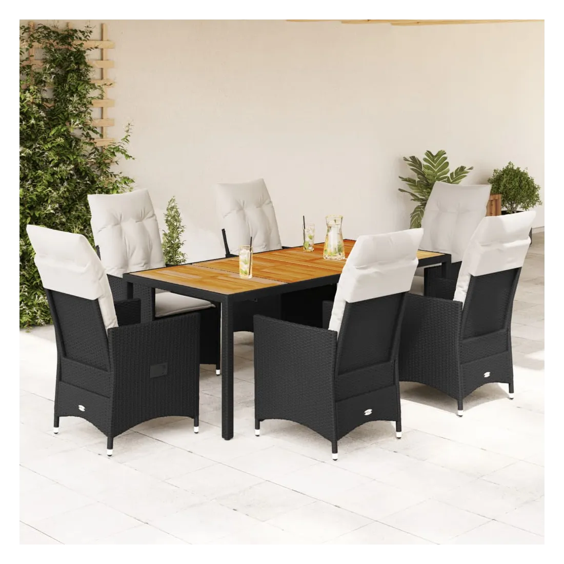 Cet ensemble de salle à manger de jardin est un excellent choix pour les repas en plein air ou pour vous détendre dans le jardin, dans l'arrière-cour ou sur la terrasse. Matériau durable : la résine tressée, également connue sous le nom de poly rotin, est un matériau synthétique solide et nécessitant peu d'entretien qui ressemble au rotin naturel. Il est léger, facile à nettoyer et couramment utilisé pour les meubles d'extérieur en raison de sa durabilité et de ses propriétés de résistance aux intempéries.Dossier réglable : ce siège de jardin est doté d'une poignée. Vous pouvez régler le dossier dans n'importe quelle position en tirant sur la poignée et le remettre rapidement dans sa position initiale.Dessus stable et facile à nettoyer : cette table de jardin a un dessus en bois d'acacia robuste, durable et facile à nettoyer avec un chiffon humide.Expérience d'assise confortable : cet ensemble de meubles d'extérieur, doté de coussins épais, offre une expérience d'assise confortable.Housse amovible et lavable : ces coussins de siège sont dotés de housses amovibles pour un lavage et un entretien faciles. Les coussins de dossier ont un rabat à l'arrière pour une fixation facile aux dossiers. Bon à savoir :Pour que vos meubles d'extérieur restent beaux, nous vous recommandons de les protéger avec une housse imperméable.