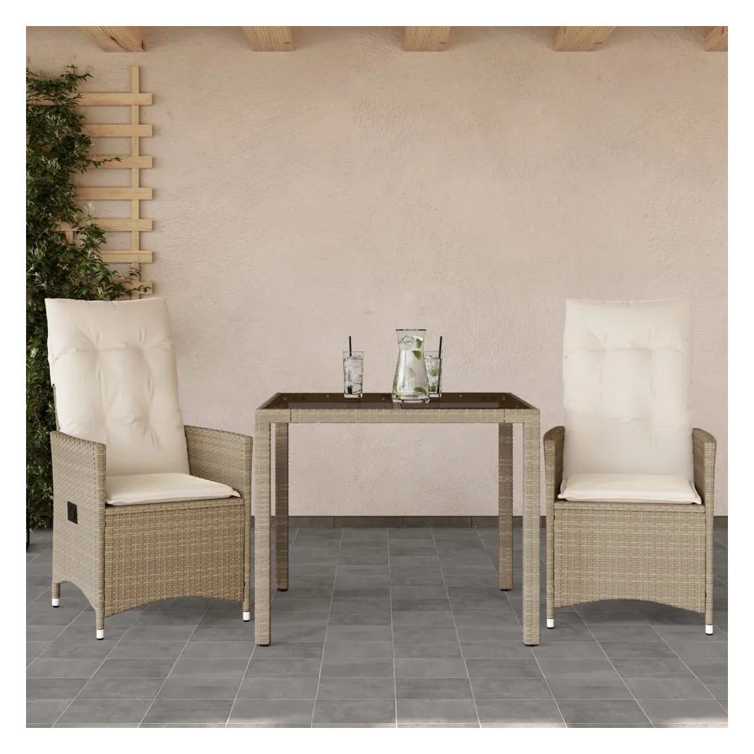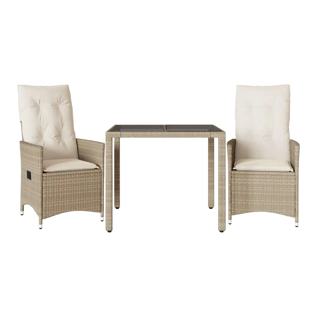 Savourez un café ou discutez avec votre famille et vos amis dans le jardin, l'arrière-cour ou sur le balcon avec cet ensemble de bistro confortable ! Matériau durable : la résine tressée, également connue sous le nom de poly rotin, est un matériau synthétique solide et nécessitant peu d'entretien qui ressemble au rotin naturel. Il est léger, facile à nettoyer et couramment utilisé pour les meubles d'extérieur en raison de sa durabilité et de ses propriétés de résistance aux intempéries.Dossier réglable : ce siège de jardin est doté d'une poignée. Vous pouvez régler le dossier dans n'importe quelle position en tirant sur la poignée et le remettre rapidement dans sa position initiale.Dessus de table pratique : le dessus de table en verre trempé est parfait pour placer ou afficher vos divers objets essentiels. De plus, il est facile à nettoyer et à entretenir.Expérience d'assise confortable : cet ensemble de meubles d'extérieur, doté de coussins épais, offre une expérience d'assise confortable.Housse amovible et lavable : ces coussins de siège sont dotés de housses amovibles pour un lavage et un entretien faciles. Les coussins de dossier ont un rabat à l'arrière pour une fixation facile aux dossiers. Bon à savoir :Pour que vos meubles d'extérieur restent beaux, nous vous recommandons de les protéger avec une housse imperméable.