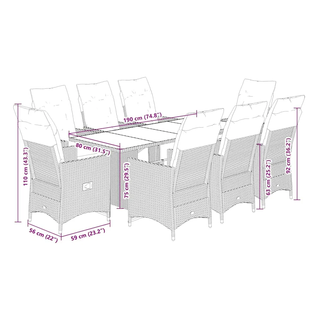 - Dimensions : 190 x 80 x 75 cm (L x l x H)
