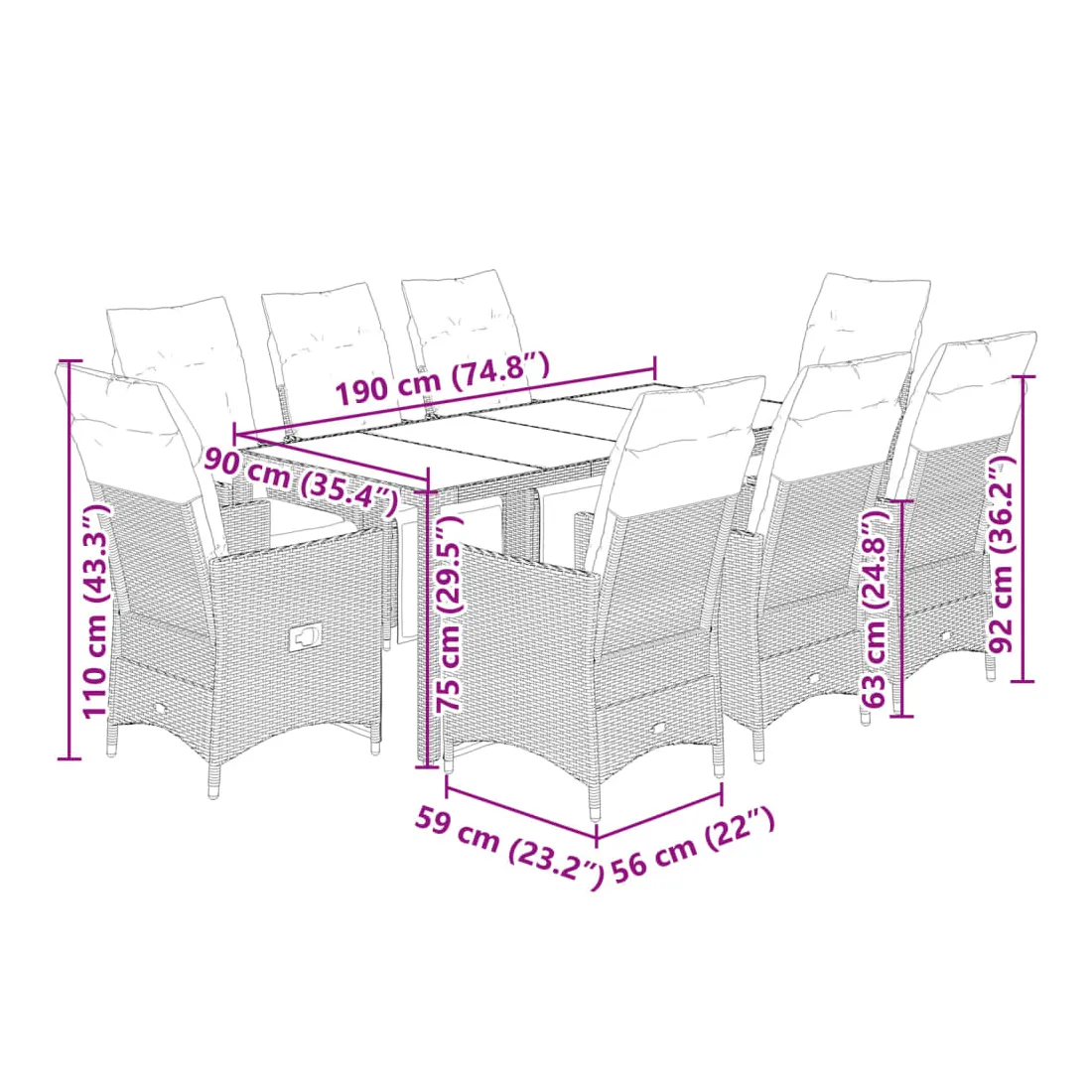 - Dimensions : 190 x 90 x 75 cm (L x l x H)
