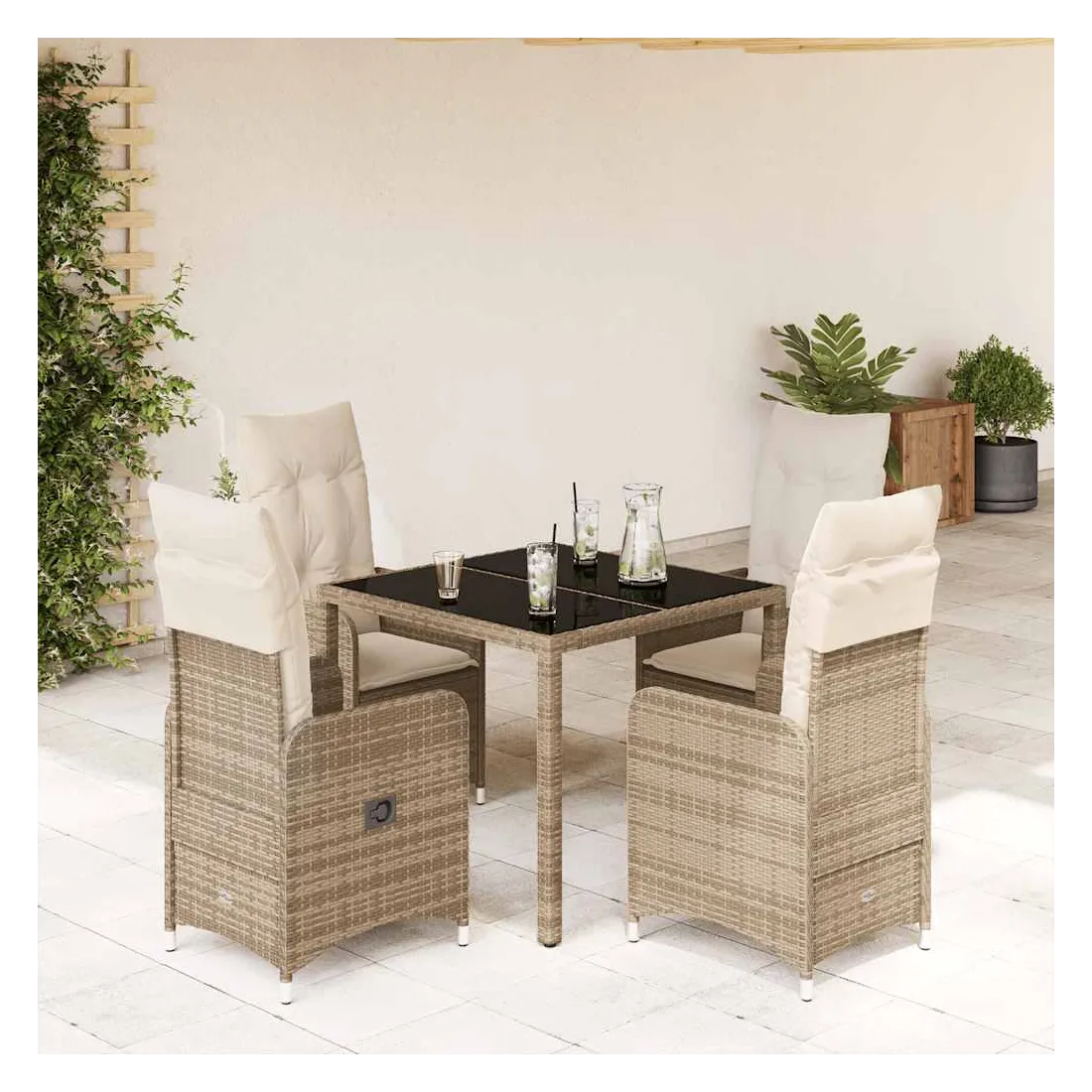 Savourez un café ou discutez avec votre famille et vos amis dans le jardin, l'arrière-cour ou sur le balcon avec cet ensemble de bistro confortable ! Matériau durable : la résine tressée, également connue sous le nom de poly rotin, est un matériau synthétique solide et nécessitant peu d'entretien qui ressemble au rotin naturel. Elle est légère, facile à nettoyer et couramment utilisée pour les meubles d'extérieur en raison de sa durabilité et de ses propriétés de résistance aux intempéries.Dossier réglable : ce siège de jardin est doté d'une poignée. Vous pouvez régler le dossier dans n'importe quelle position en tirant sur la poignée et le remettre rapidement dans sa position initiale.Expérience d'assise confortable : ce mobilier d'extérieur, doté de coussins épais, offre une expérience d'assise confortable.Housse amovible et lavable : ces coussins de siège sont dotés de housses amovibles pour un lavage et un entretien faciles. Les coussins de dossier ont un rabat à l'arrière pour une fixation facile aux dossiers.Dessus en verre : le dessus de la table d'extérieur est fabriqué en verre trempé solide et durable, ce qui le rend facile à nettoyer avec un chiffon humide et ajoute une touche d'élégance à votre espace extérieur. Bon à savoir :Pour que vos meubles d'extérieur restent beaux, nous vous recommandons de les protéger avec une housse imperméable.