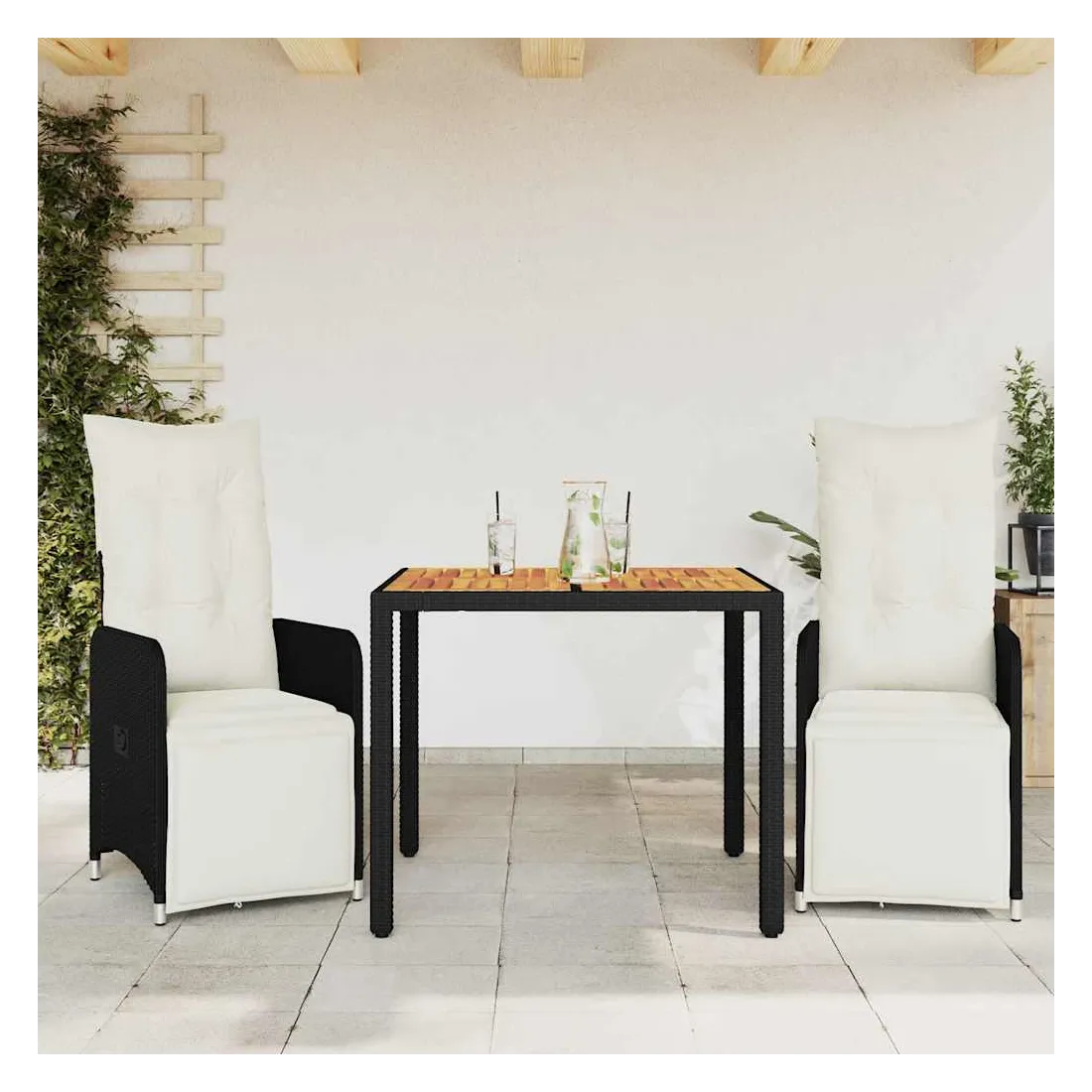 Savourez un café ou discutez avec votre famille et vos amis dans le jardin, l'arrière-cour ou sur le balcon avec cet ensemble de bistro confortable ! Matériau durable : la résine tressée, également connue sous le nom de poly rotin, est un matériau synthétique solide et nécessitant peu d'entretien qui ressemble au rotin naturel. Elle est légère, facile à nettoyer et couramment utilisée pour les meubles d'extérieur en raison de sa durabilité et de ses propriétés de résistance aux intempéries.Dossier et repose-pied réglables : ce siège de jardin est doté d'une poignée. Vous pouvez régler le dossier et le repose-pied dans n'importe quelle position en tirant sur la poignée, et le remettre rapidement dans sa position initiale.Expérience d'assise confortable : ce mobilier d'extérieur, doté de coussins épais, offre une expérience d'assise confortable.Housse amovible et lavable : ces coussins de siège sont dotés de housses amovibles pour un lavage et un entretien faciles. Les coussins de dossier ont un rabat à l'arrière pour une fixation facile aux dossiers.Dessus stable et facile à nettoyer : cette table de jardin a un dessus en bois d'acacia robuste, durable et facile à nettoyer avec un chiffon humide. Bon à savoir :Pour que vos meubles d'extérieur restent beaux, nous vous recommandons de les protéger avec une housse imperméable.