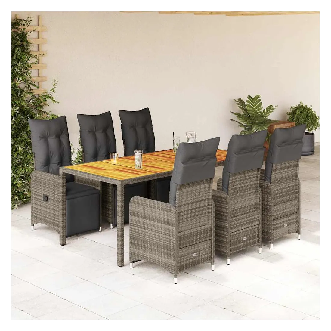 Savourez un café ou discutez avec votre famille et vos amis dans le jardin, l'arrière-cour ou sur le balcon avec cet ensemble de bistro confortable ! Matériau durable : la résine tressée, également connue sous le nom de poly rotin, est un matériau synthétique solide et nécessitant peu d'entretien qui ressemble au rotin naturel. Elle est légère, facile à nettoyer et couramment utilisée pour les meubles d'extérieur en raison de sa durabilité et de ses propriétés de résistance aux intempéries.Dossier et repose-pied réglables : ce siège de jardin est doté d'une poignée. Vous pouvez régler le dossier et le repose-pied dans n'importe quelle position en tirant sur la poignée, et le remettre rapidement dans sa position initiale.Expérience d'assise confortable : ce mobilier d'extérieur, doté de coussins épais, offre une expérience d'assise confortable.Housse amovible et lavable : ces coussins de siège sont dotés de housses amovibles pour un lavage et un entretien faciles. Les coussins de dossier ont un rabat à l'arrière pour une fixation facile aux dossiers.Dessus stable et facile à nettoyer : cette table de jardin a un dessus en bois d'acacia robuste, durable et facile à nettoyer avec un chiffon humide. Bon à savoir :Pour que vos meubles d'extérieur restent beaux, nous vous recommandons de les protéger avec une housse imperméable.