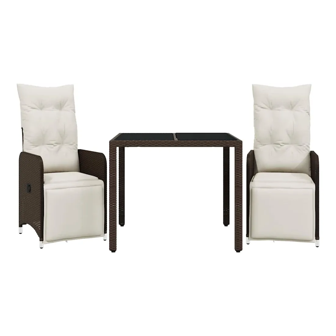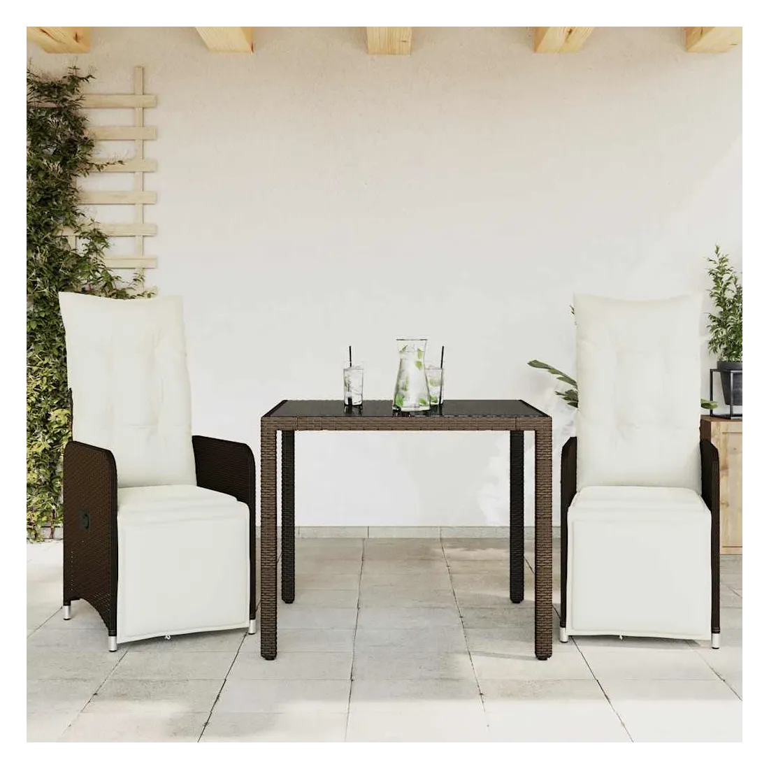 Savourez un café ou discutez avec votre famille et vos amis dans le jardin, l'arrière-cour ou sur le balcon avec cet ensemble de bistro confortable ! Matériau durable : la résine tressée, également connue sous le nom de poly rotin, est un matériau synthétique solide et nécessitant peu d'entretien qui ressemble au rotin naturel. Elle est légère, facile à nettoyer et couramment utilisée pour les meubles d'extérieur en raison de sa durabilité et de ses propriétés de résistance aux intempéries.Dossier et repose-pied réglables : ce siège de jardin est doté d'une poignée. Vous pouvez régler le dossier et le repose-pied dans n'importe quelle position en tirant sur la poignée, et le remettre rapidement dans sa position initiale.Expérience d'assise confortable : ce mobilier d'extérieur, doté de coussins épais, offre une expérience d'assise confortable.Housse amovible et lavable : ces coussins de siège sont dotés de housses amovibles pour un lavage et un entretien faciles. Les coussins de dossier ont un rabat à l'arrière pour une fixation facile aux dossiers.Dessus en verre : le dessus de la table d'extérieur est fabriqué en verre trempé solide et durable, ce qui le rend facile à nettoyer avec un chiffon humide et ajoute une touche d'élégance à votre espace extérieur. Bon à savoir :Pour que vos meubles d'extérieur restent beaux, nous vous recommandons de les protéger avec une housse imperméable.