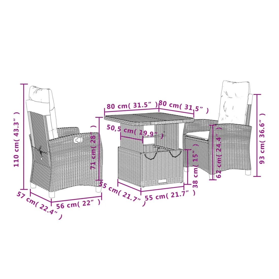 - Dimensions de la table : 80 x 80 x 40/71 cm (L x l x H)