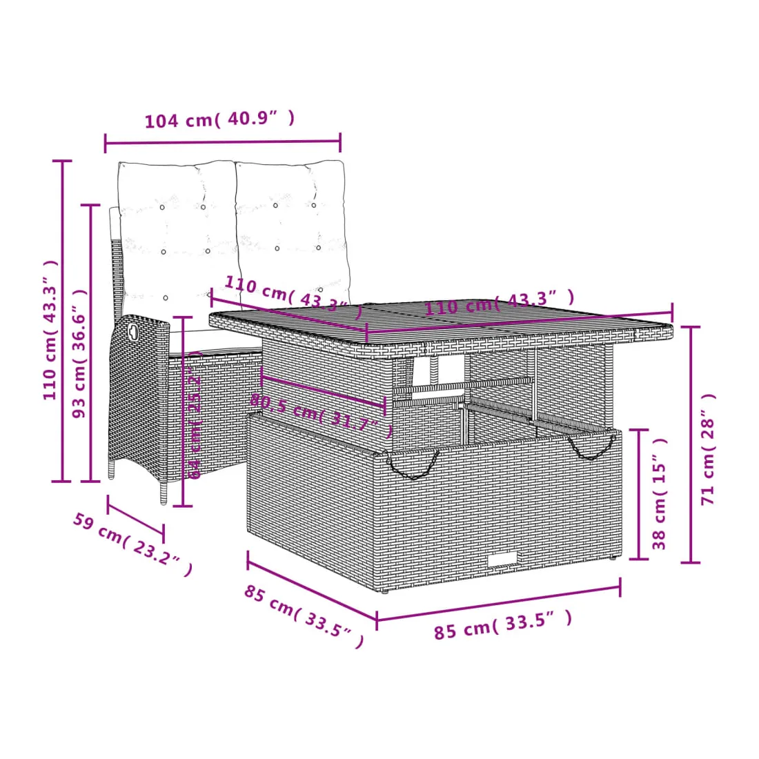 - Dimensions de la table : 110 x 110 x 40/71 cm (L x l x H)