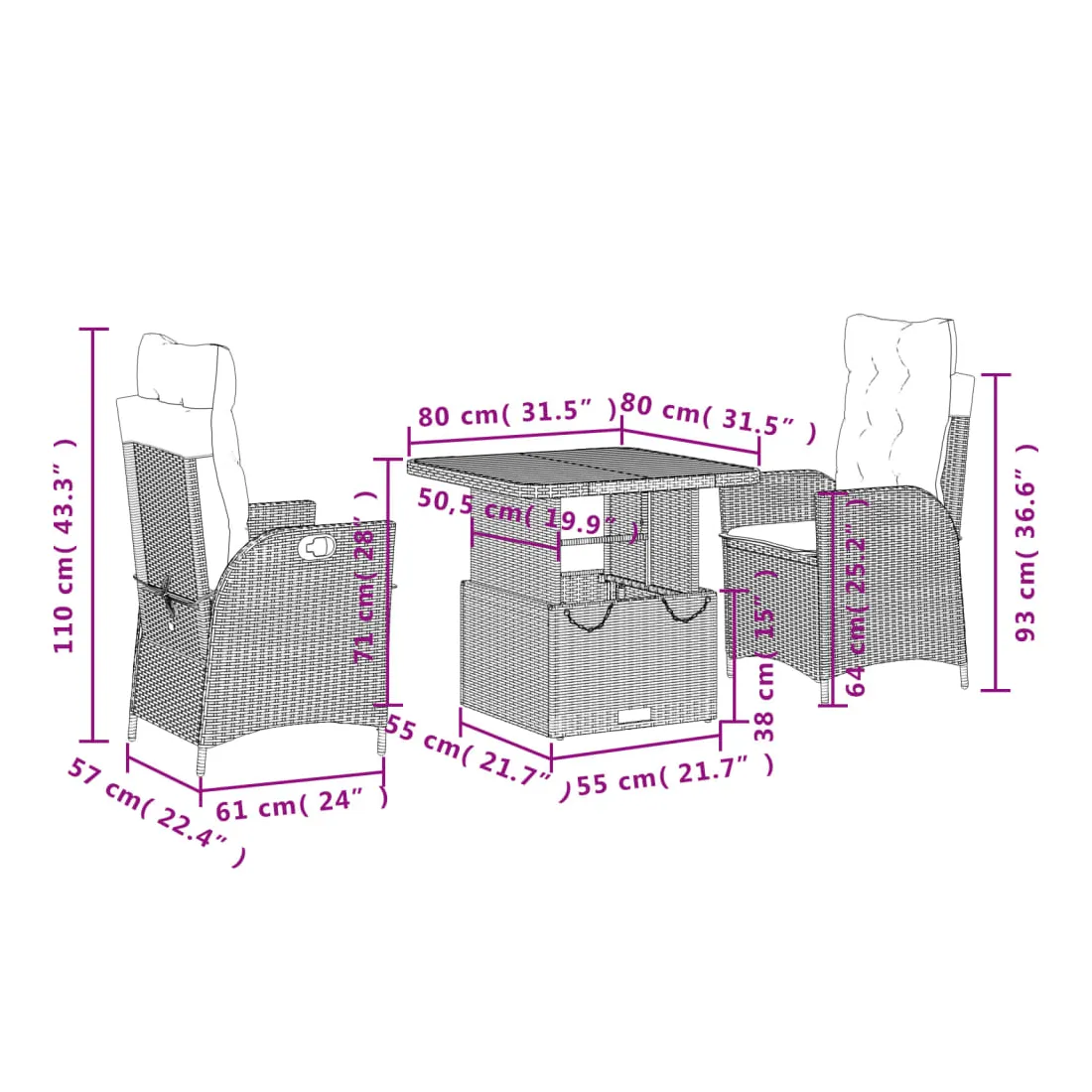 - Dimensions de la table : 80 x 80 x 40/71 cm (L x l x H)