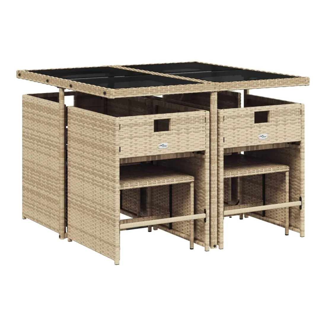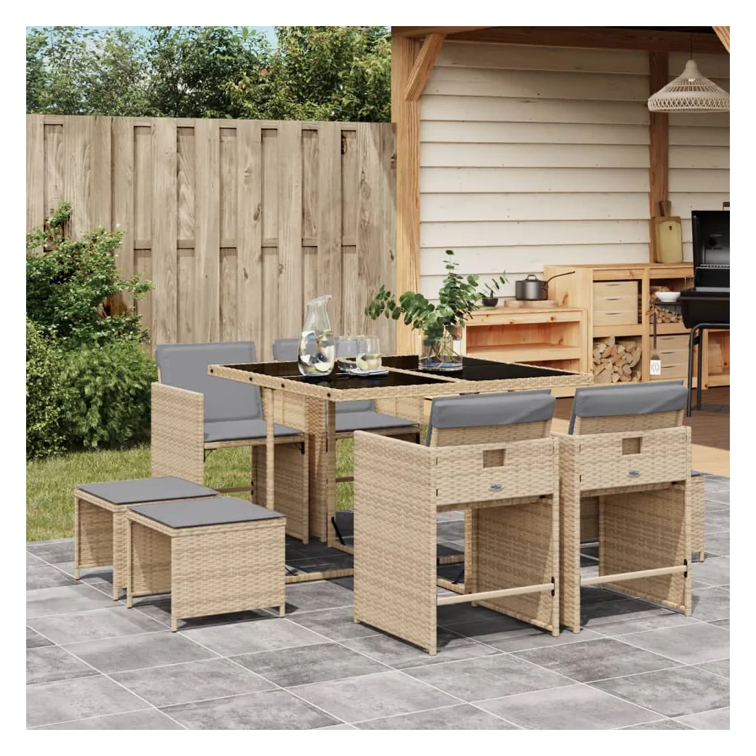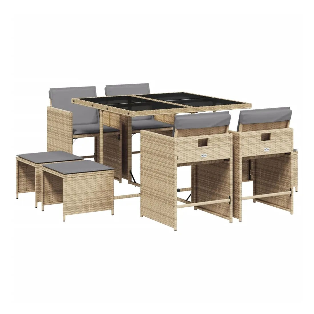 Cet ensemble de salle à manger de jardin est un excellent choix pour les repas en plein air ou pour vous détendre dans le jardin, dans l'arrière-cour ou sur la terrasse. Matériau durable : la résine tressée, également connue sous le nom de poly rotin, est un matériau synthétique solide et nécessitant peu d'entretien qui ressemble au rotin naturel. Il est léger, facile à nettoyer et couramment utilisé pour les meubles d'extérieur en raison de sa durabilité et de ses propriétés de résistance aux intempéries.Rangement compact : ces chaises sont dotées d'un dossier rabattable, ce qui permet de les ranger facilement sous la table. Une fois pliées, elles se rangent parfaitement sous la table, formant un cube peu encombrant. De plus, les tabourets peuvent également être rangés sous les chaises, maximisant encore davantage l'efficacité de l'espace.Expérience d'assise confortable : ce mobilier d'extérieur, doté de coussins épais, offre une expérience d'assise confortable.Housse amovible et lavable : ces coussins de siège sont dotés de housses amovibles pour un lavage et un entretien faciles. Les housses de coussin de chaise ont un rabat à l'arrière pour une fixation facile aux chaises.Dessus stable et facile à nettoyer : cette table de jardin est dotée d'un dessus en verre trempé robuste, durable et facile à nettoyer à l'aide d'un chiffon humide. Bon à savoir : Pour que vos meubles d'extérieur restent beaux, nous vous recommandons de les protéger avec une housse imperméable.