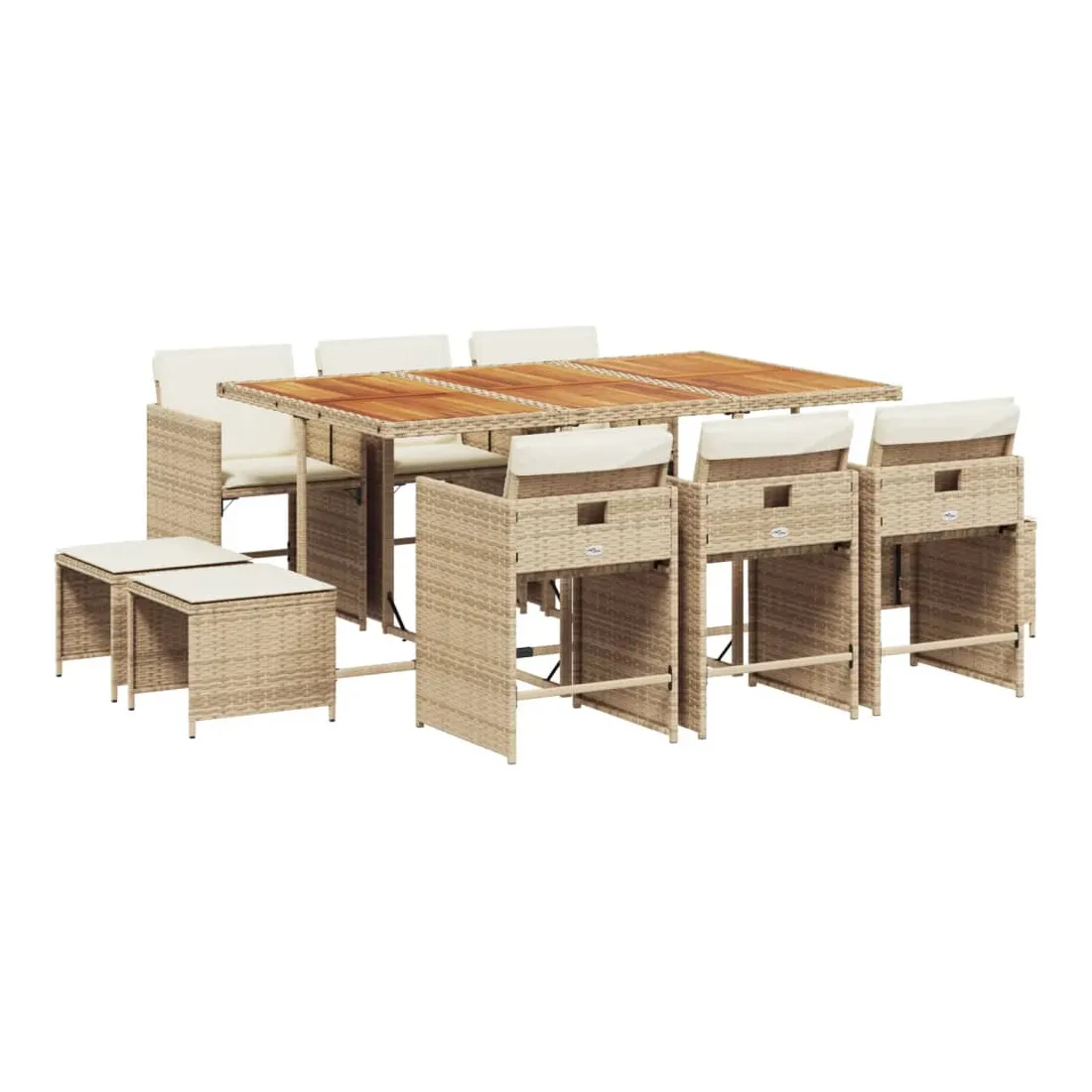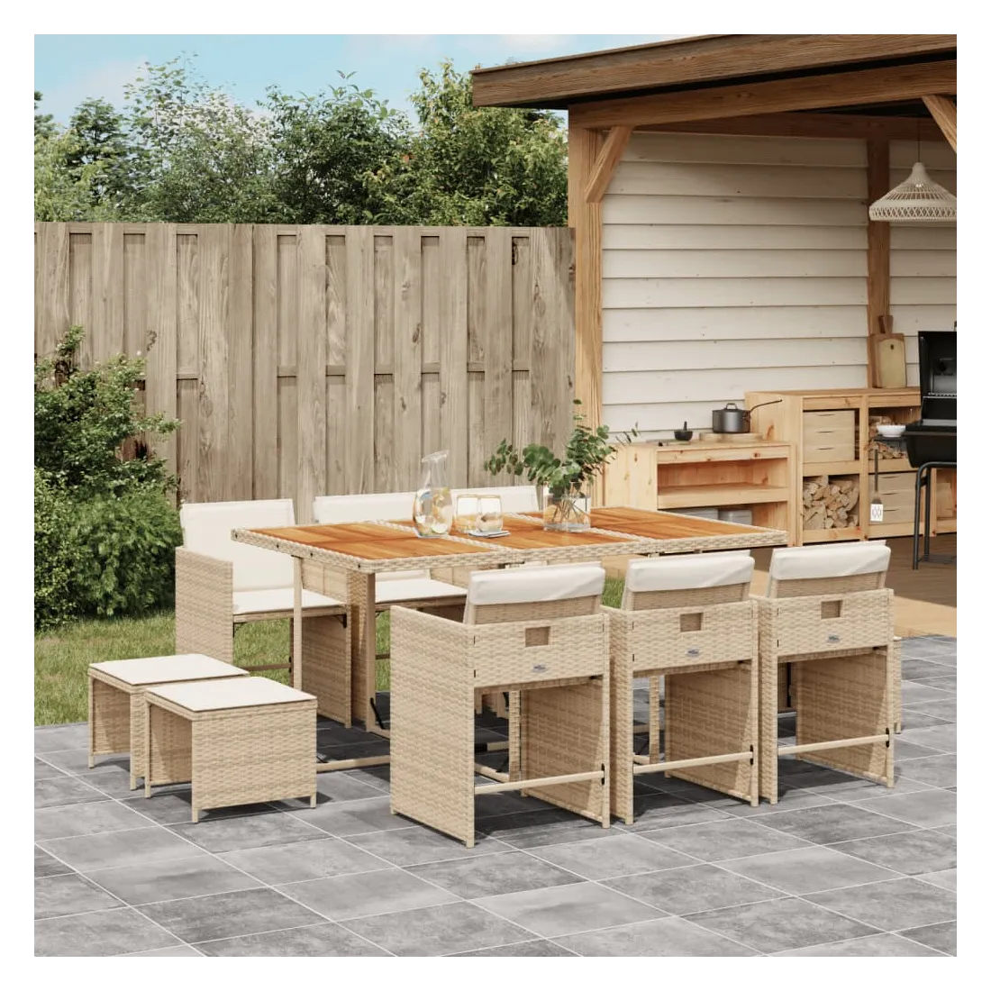 Cet ensemble de salle à manger de jardin est un excellent choix pour les repas en plein air ou pour vous détendre dans le jardin, dans l'arrière-cour ou sur la terrasse. Matériau durable : la résine tressée, également connue sous le nom de poly rotin, est un matériau synthétique solide et nécessitant peu d'entretien qui ressemble au rotin naturel. Il est léger, facile à nettoyer et couramment utilisé pour les meubles d'extérieur en raison de sa durabilité et de ses propriétés de résistance aux intempéries.Rangement compact : ces chaises sont dotées d'un dossier rabattable, ce qui permet de les ranger facilement sous la table. Une fois pliées, elles se rangent parfaitement sous la table, formant un cube peu encombrant. De plus, les tabourets peuvent également être rangés sous les chaises, maximisant encore davantage l'efficacité de l'espace.Expérience d'assise confortable : ce mobilier d'extérieur, doté de coussins épais, offre une expérience d'assise confortable.Housse amovible et lavable : ces coussins de siège sont dotés de housses amovibles pour un lavage et un entretien faciles. Les housses de coussin de chaise ont un rabat à l'arrière pour une fixation facile aux chaises.Dessus stable et facile à nettoyer : cette table de jardin a un dessus en bois d'acacia robuste, durable et facile à nettoyer avec un chiffon humide. Bon à savoir : Pour que vos meubles d'extérieur restent beaux, nous vous recommandons de les protéger avec une housse imperméable.