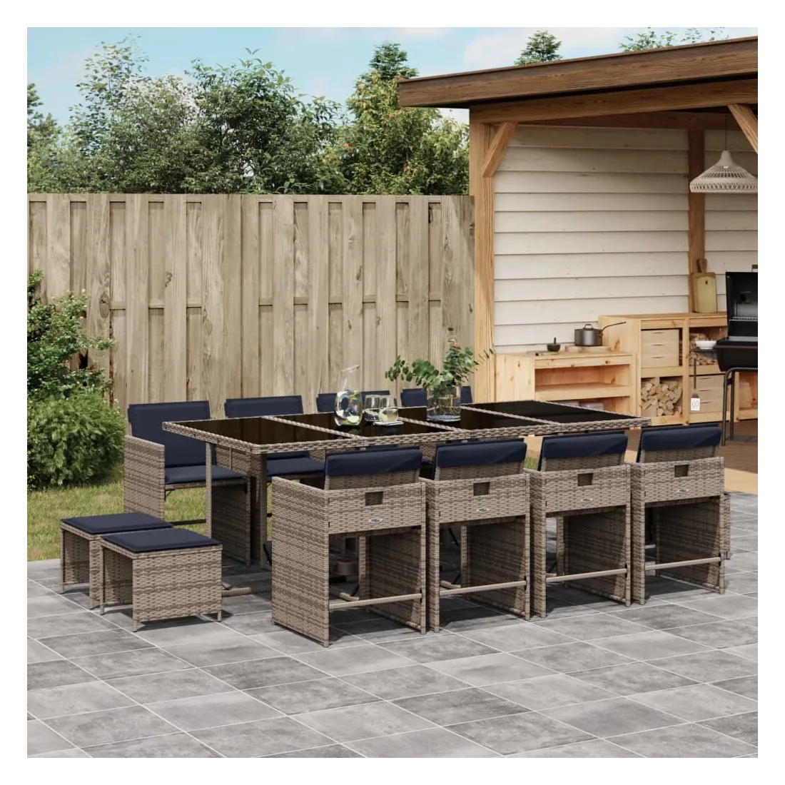 Cet ensemble de salle à manger de jardin est un excellent choix pour les repas en plein air ou pour vous détendre dans le jardin, dans l'arrière-cour ou sur la terrasse. Matériau durable : la résine tressée, également connue sous le nom de poly rotin, est un matériau synthétique solide et nécessitant peu d'entretien qui ressemble au rotin naturel. Elle est légère, facile à nettoyer et couramment utilisée pour les meubles d'extérieur en raison de sa durabilité et de ses propriétés de résistance aux intempéries.Rangement compact : ces chaises sont dotées d'un dossier rabattable, ce qui permet de les ranger facilement sous la table. Une fois pliées, elles se rangent parfaitement sous la table, formant un cube peu encombrant. De plus, les tabourets peuvent également être rangés sous les chaises, maximisant encore davantage l'efficacité de l'espace.Expérience d'assise confortable : ce mobilier d'extérieur, doté de coussins épais, offre une expérience d'assise confortable.Housse amovible et lavable : ces coussins de siège sont dotés de housses amovibles pour un lavage et un entretien faciles. Les housses de coussin de chaise ont un rabat à l'arrière pour une fixation facile aux chaises.Dessus stable et facile à nettoyer : cette table de jardin est dotée d'un dessus en verre trempé robuste, durable et facile à nettoyer à l'aide d'un chiffon humide. Bon à savoir : Pour que vos meubles d'extérieur restent beaux, nous vous recommandons de les protéger avec une housse imperméable.