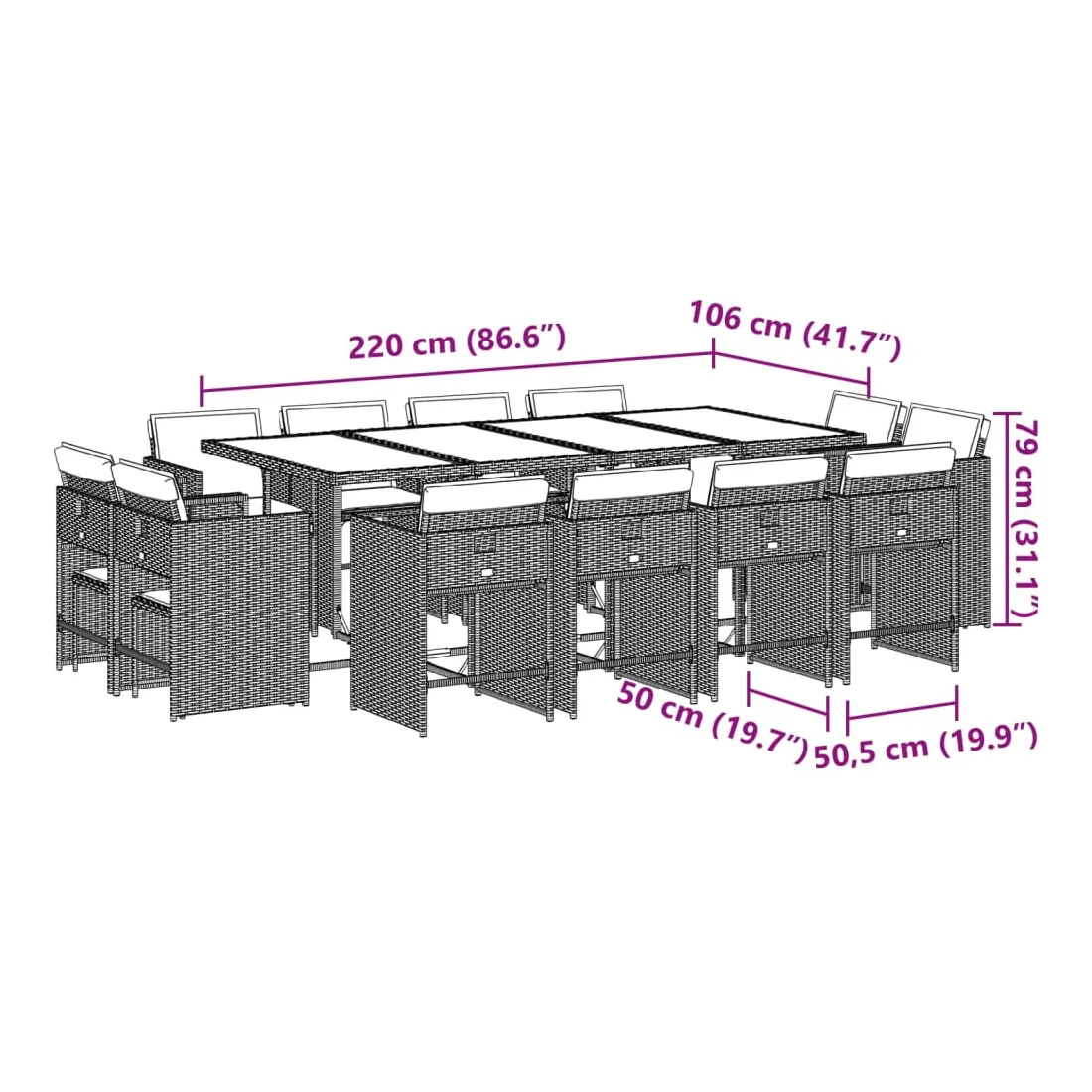 - Dimensions : 220 x 106 x 73 cm (L x l x H)
