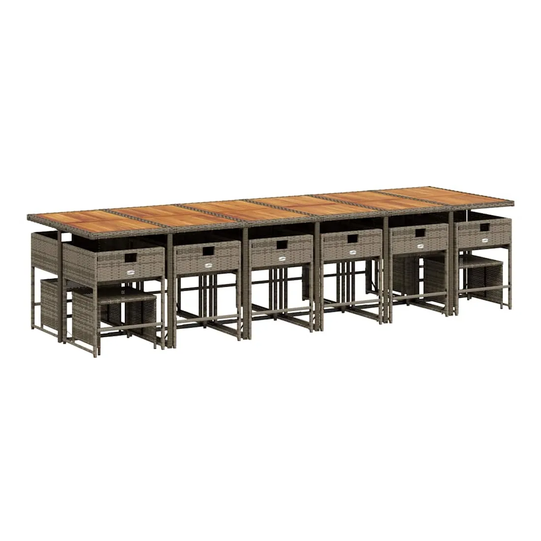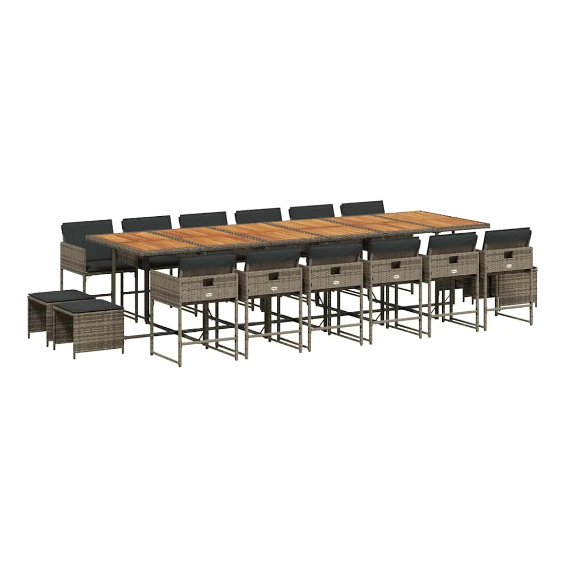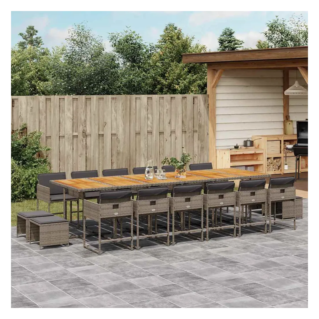 Cet ensemble de salle à manger de jardin est un excellent choix pour les repas en plein air ou pour vous détendre dans le jardin, dans l'arrière-cour ou sur la terrasse. Matériau durable : la résine tressée, également connue sous le nom de poly rotin, est un matériau synthétique solide et nécessitant peu d'entretien qui ressemble au rotin naturel. Il est léger, facile à nettoyer et couramment utilisé pour les meubles d'extérieur en raison de sa durabilité et de ses propriétés de résistance aux intempéries.Rangement compact : ces chaises sont dotées d'un dossier rabattable, ce qui permet de les ranger facilement sous la table. Une fois pliées, elles se rangent parfaitement sous la table, formant un cube peu encombrant. De plus, les tabourets peuvent également être rangés sous les chaises, maximisant encore davantage l'efficacité de l'espace.Expérience d'assise confortable : ce mobilier d'extérieur, doté de coussins épais, offre une expérience d'assise confortable.Housse amovible et lavable : ces coussins de siège sont dotés de housses amovibles pour un lavage et un entretien faciles. Les housses de coussin ont un rabat à l'arrière pour une fixation facile aux dossiers.Dessus stable et facile à nettoyer : cette table de jardin a un dessus en bois d'acacia robuste, durable et facile à nettoyer avec un chiffon humide. Bon à savoir : Pour que vos meubles d'extérieur restent beaux, nous vous recommandons de les protéger avec une housse imperméable.